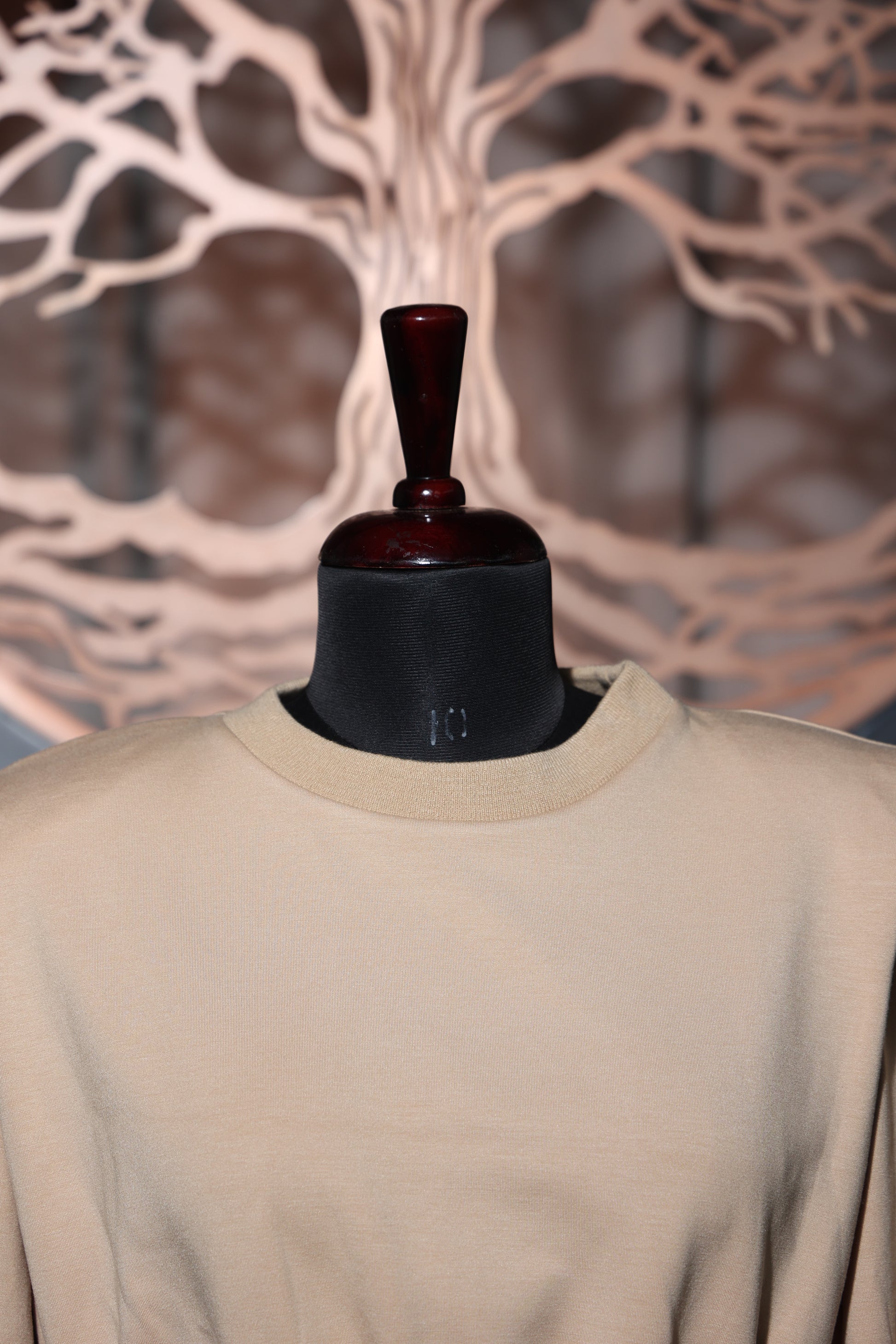 This stylish beige pullover features structured shoulders that give it a bold, modern look. The cropped silhouette has a cinched waistline, creating a flattering, fitted shape, while the soft, slightly oversized sleeves add a relaxed feel.