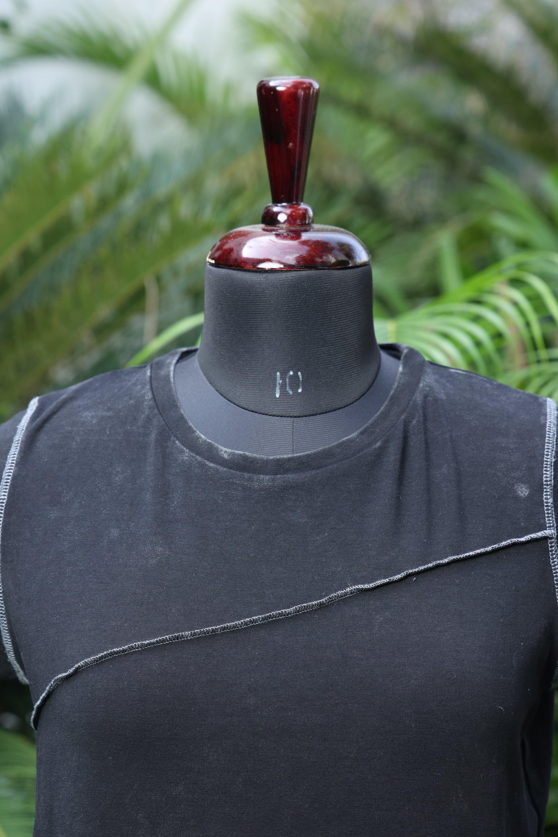 Elevate your casual look with this black t-shirt, featuring unique asymmetrical stitch detailing across the front. Perfect for adding an edgy vibe to your everyday style.