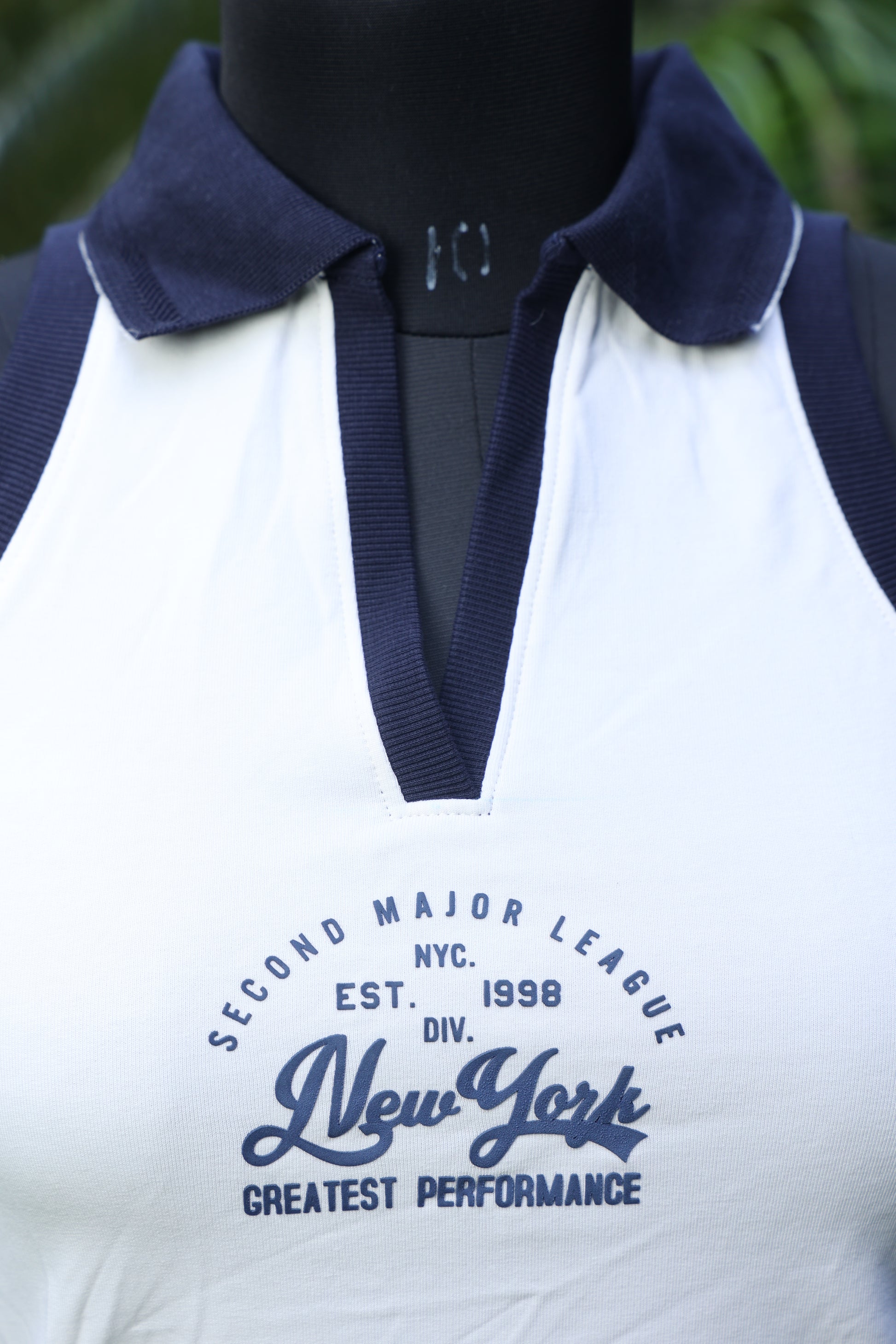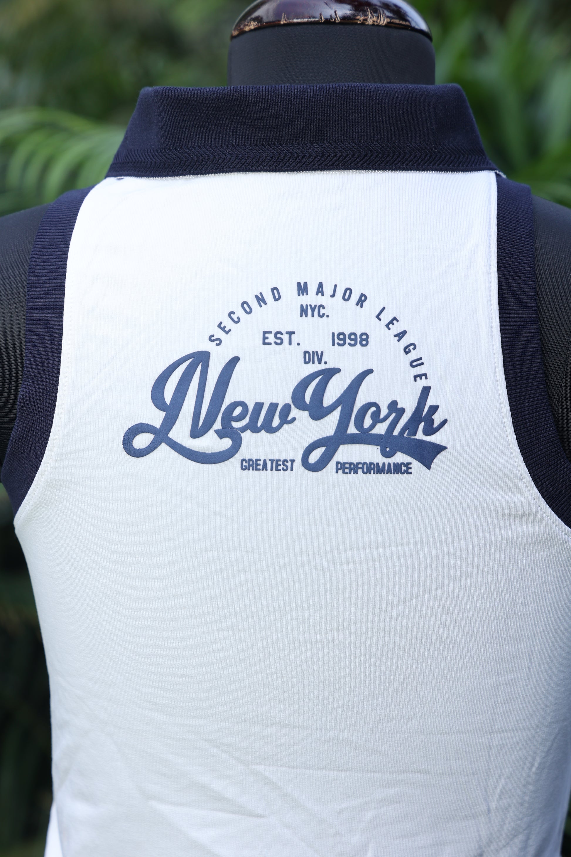 This white tank top features a stylish navy collar and vintage-inspired New York print, making it a versatile choice for both sporty and casual looks.