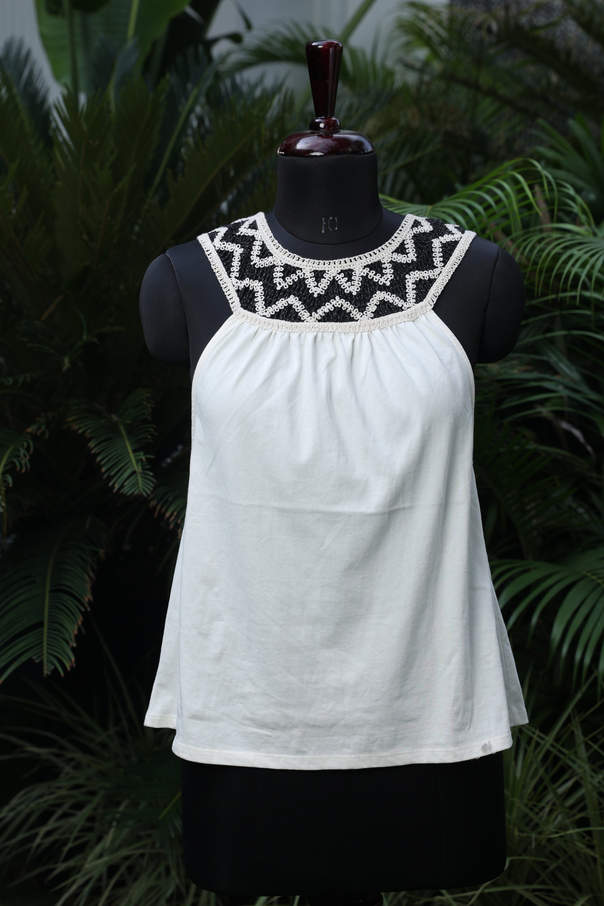This white top brings effortless sophistication with intricate threadwork details, offering a refined yet relaxed style perfect for any occasion.
