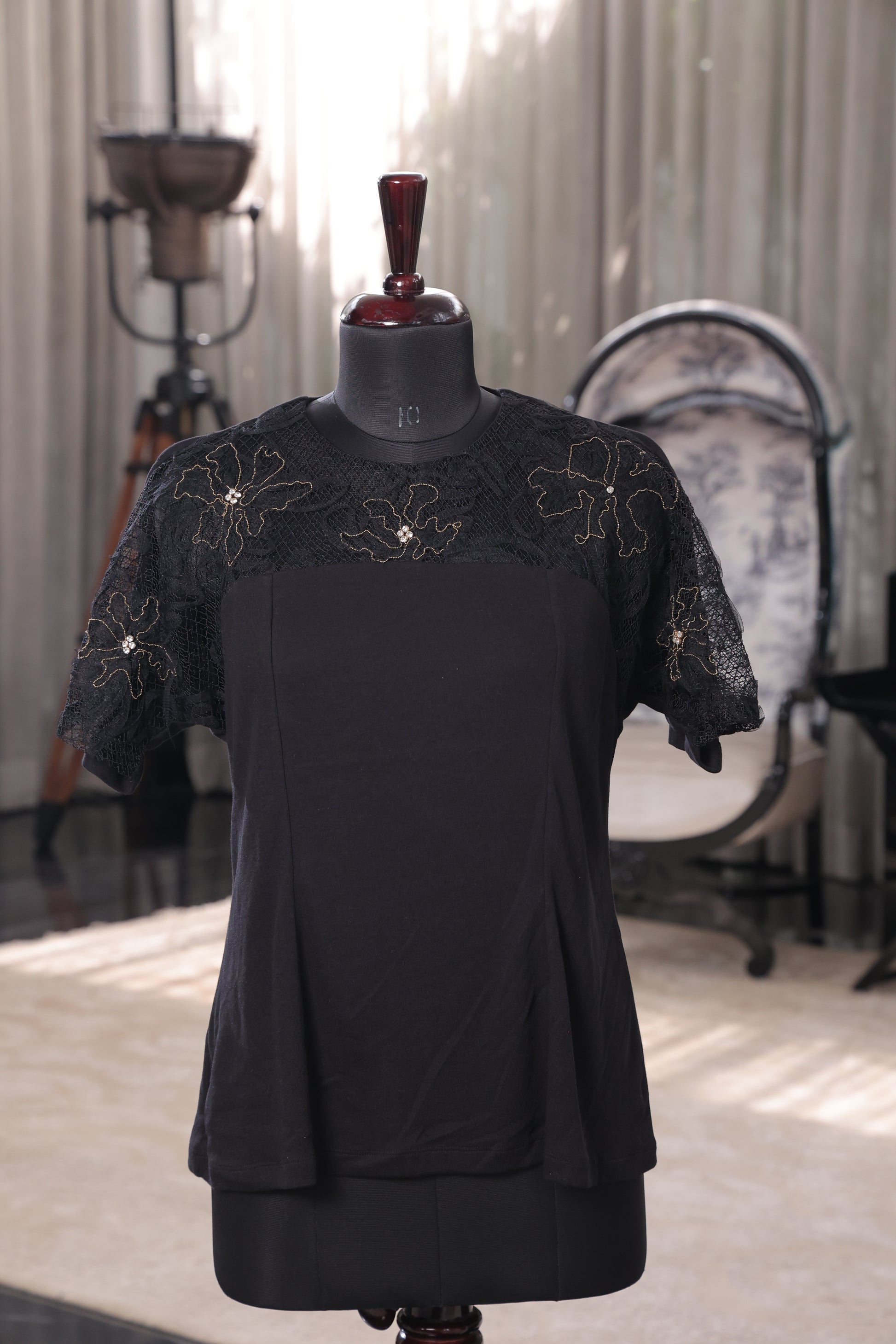 This Lace adorn top is your go-to for effortless style and comfort. Perfect for casual outings or lounging at home, this t-shirt blends versatility with a laid-back vibe.