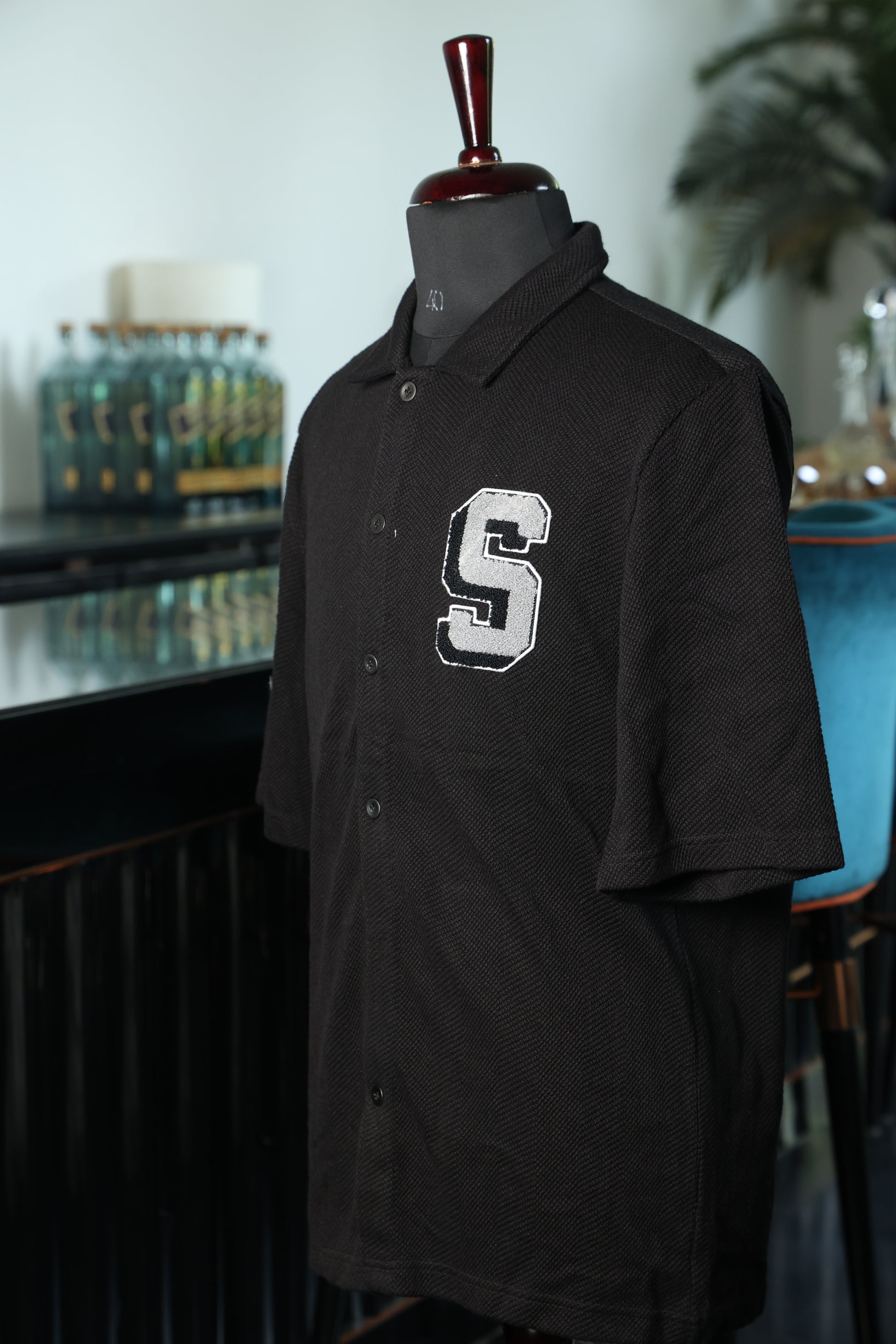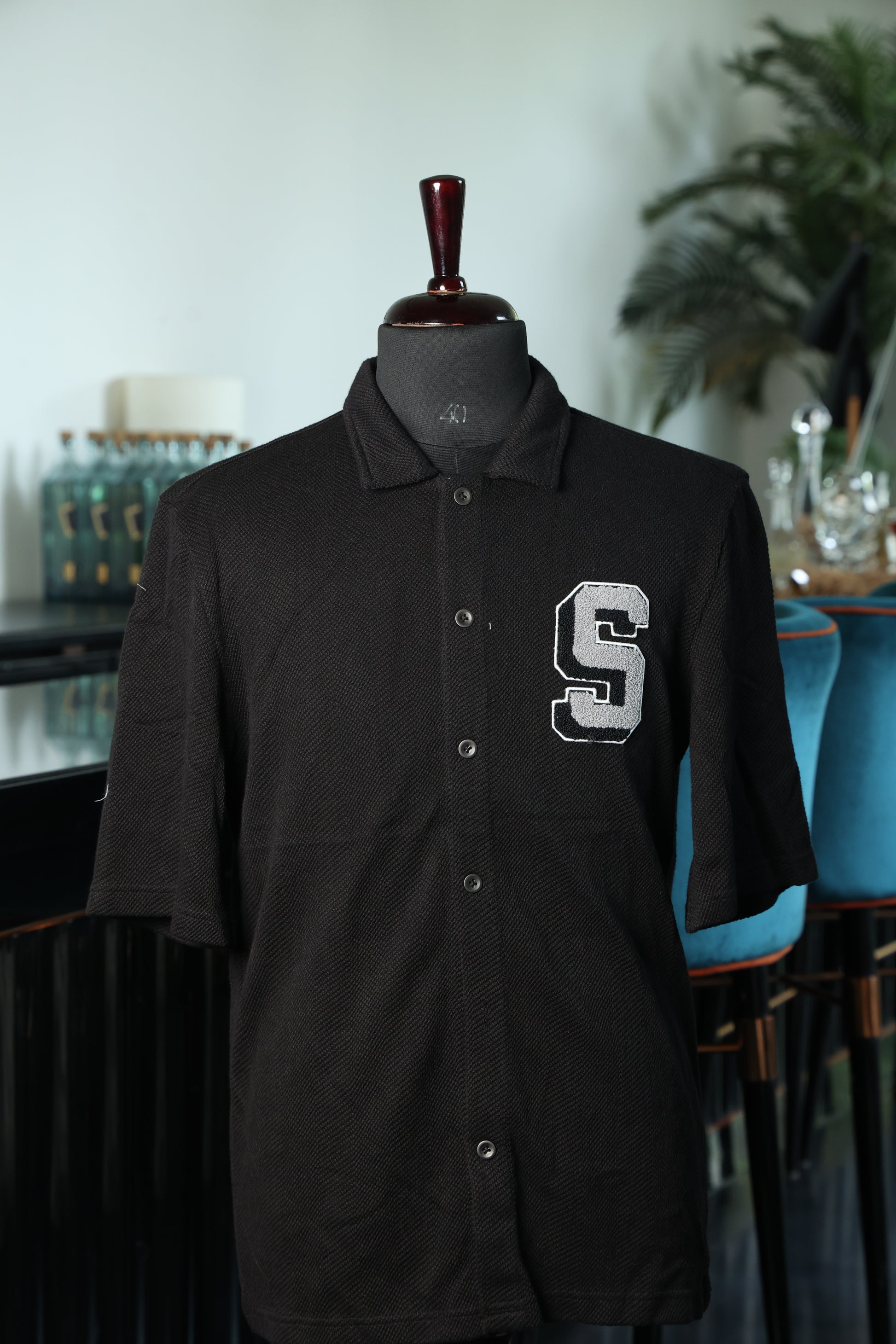 This black shirt features a small, subtle graphic, adding a modern touch to its classic, minimalist design. Perfect for everyday wear.