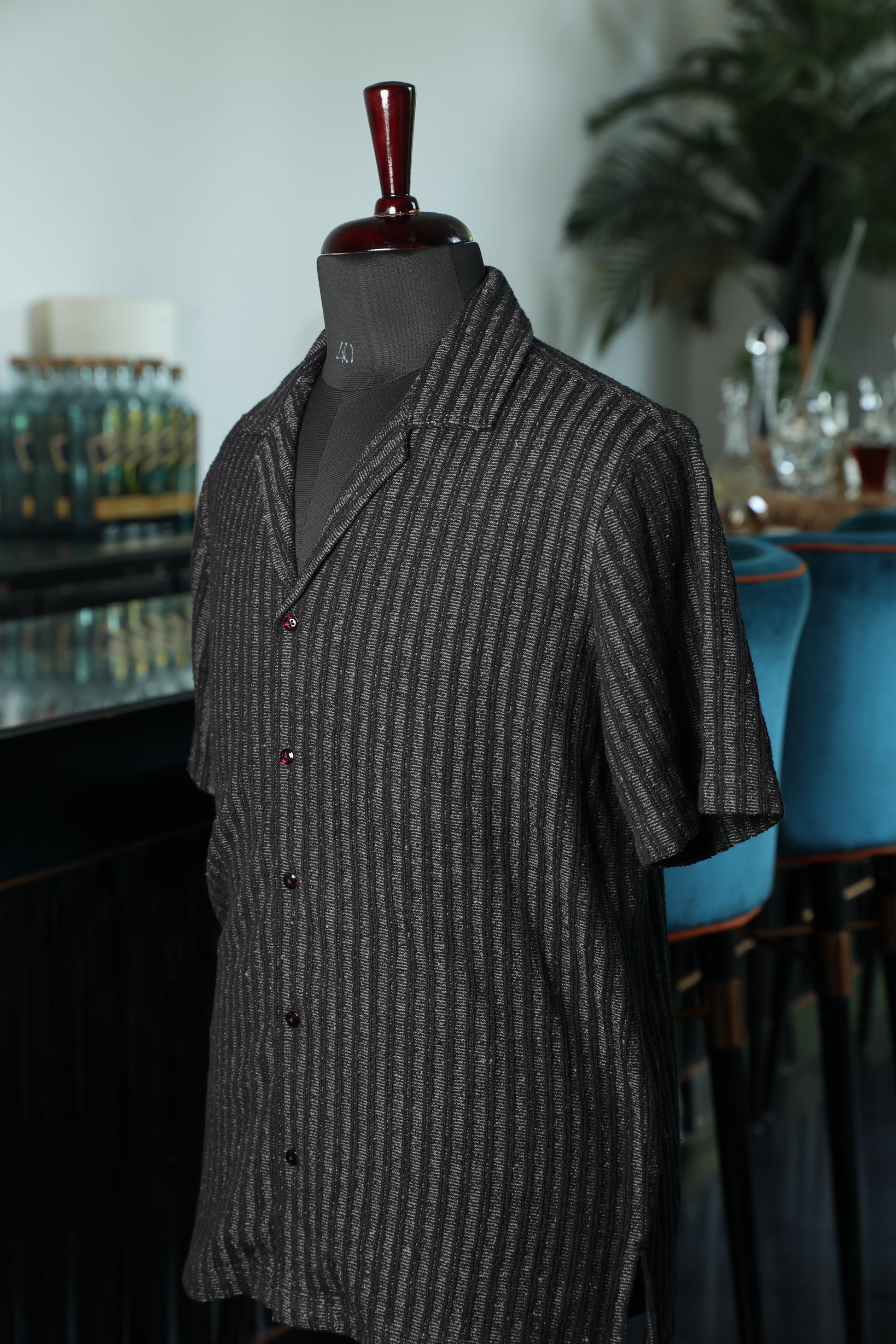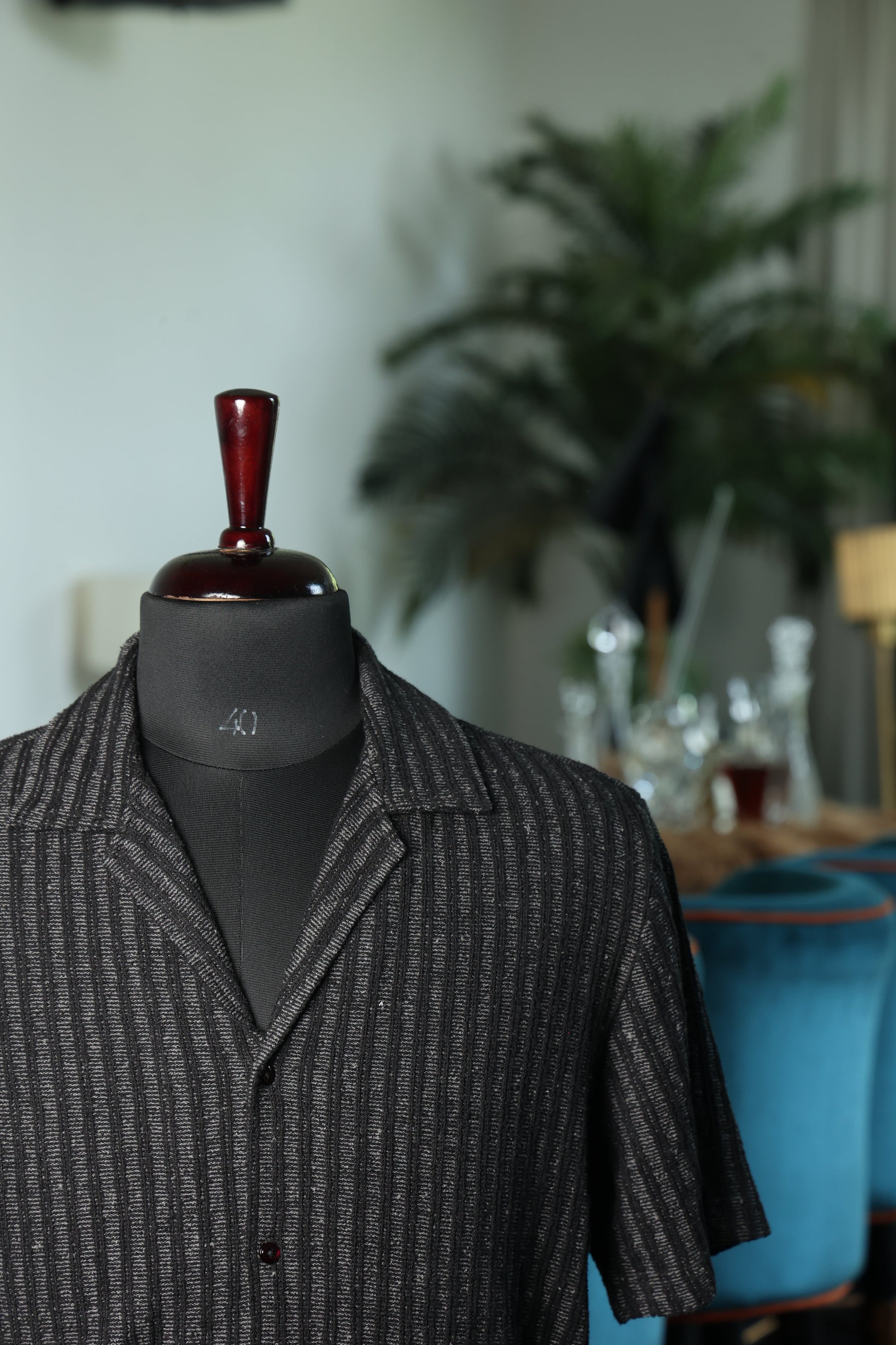A sleek black shirt with fine textured stripes, designed to offer a refined and modern edge while maintaining a timeless appeal.