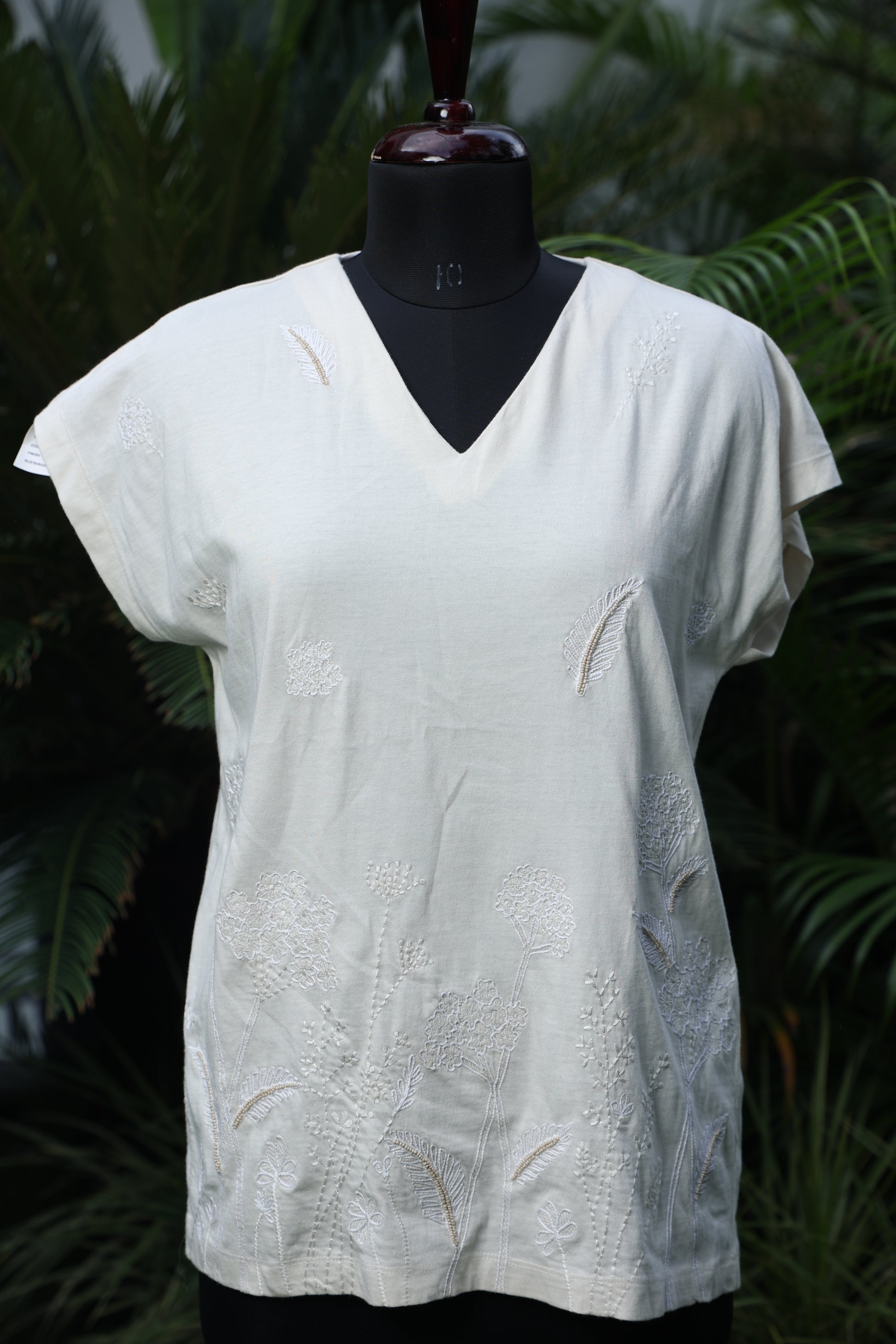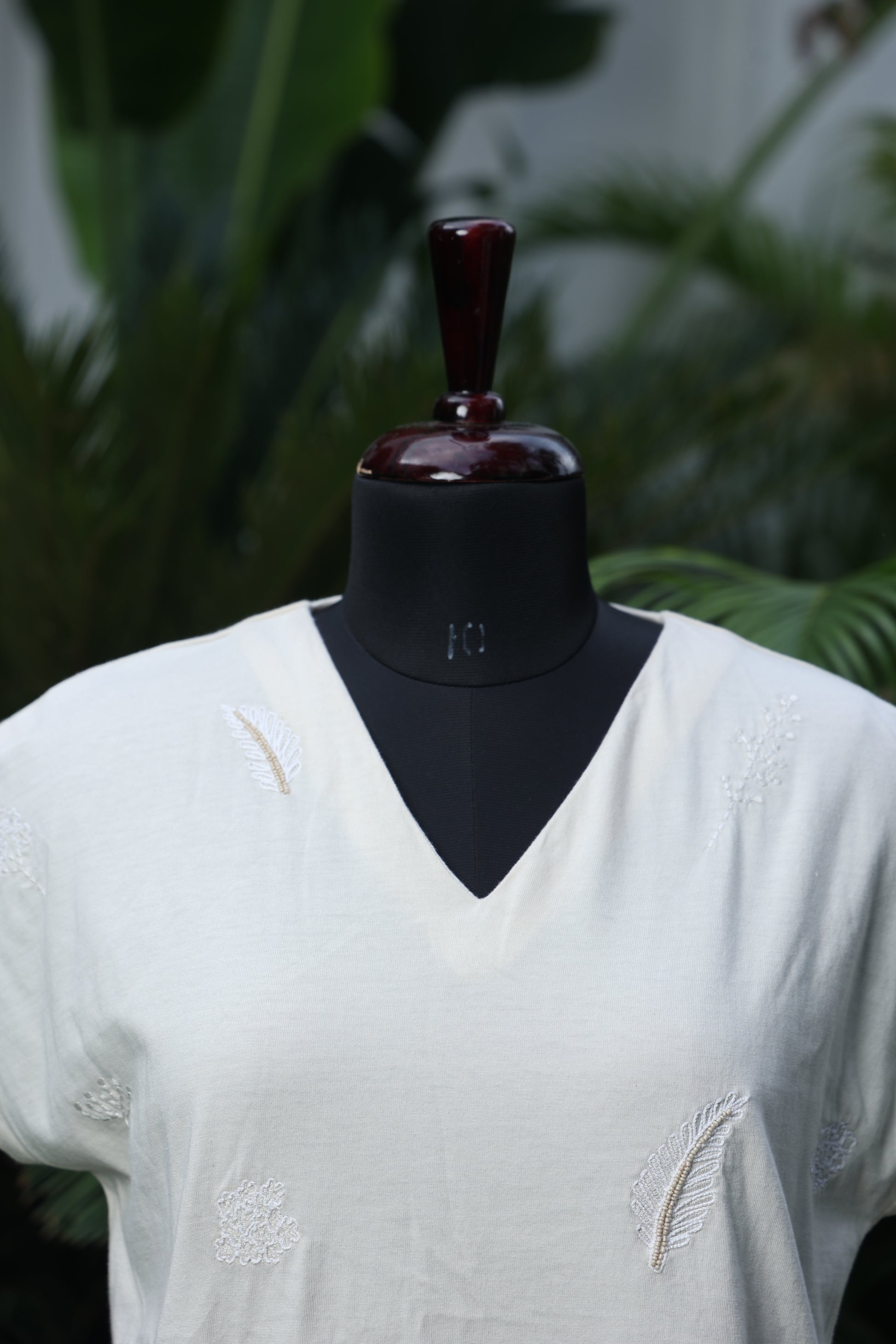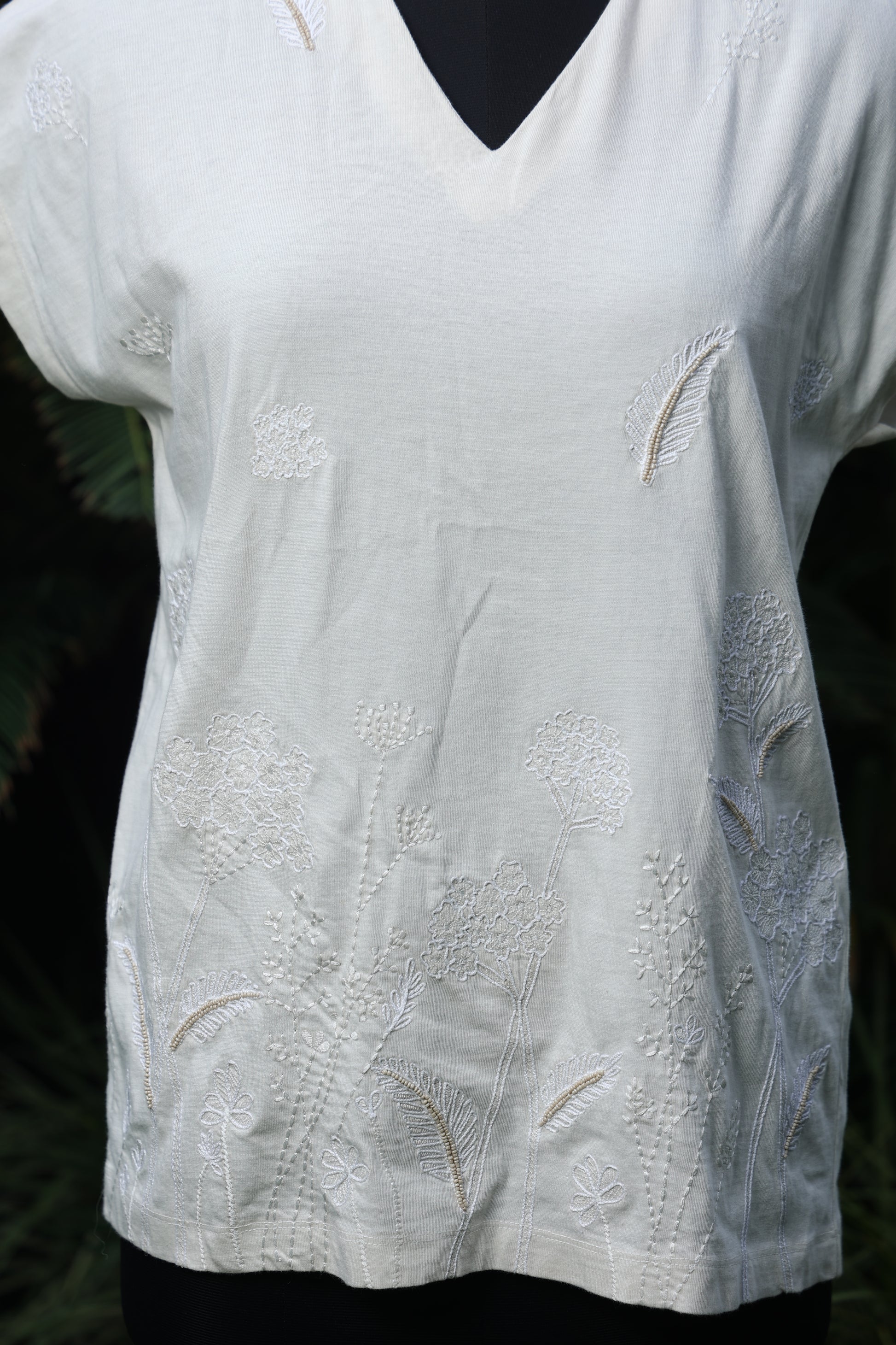 This charming white t-shirt features delicate floral embroidery, offering a subtle touch of elegance to a casual wardrobe essential.