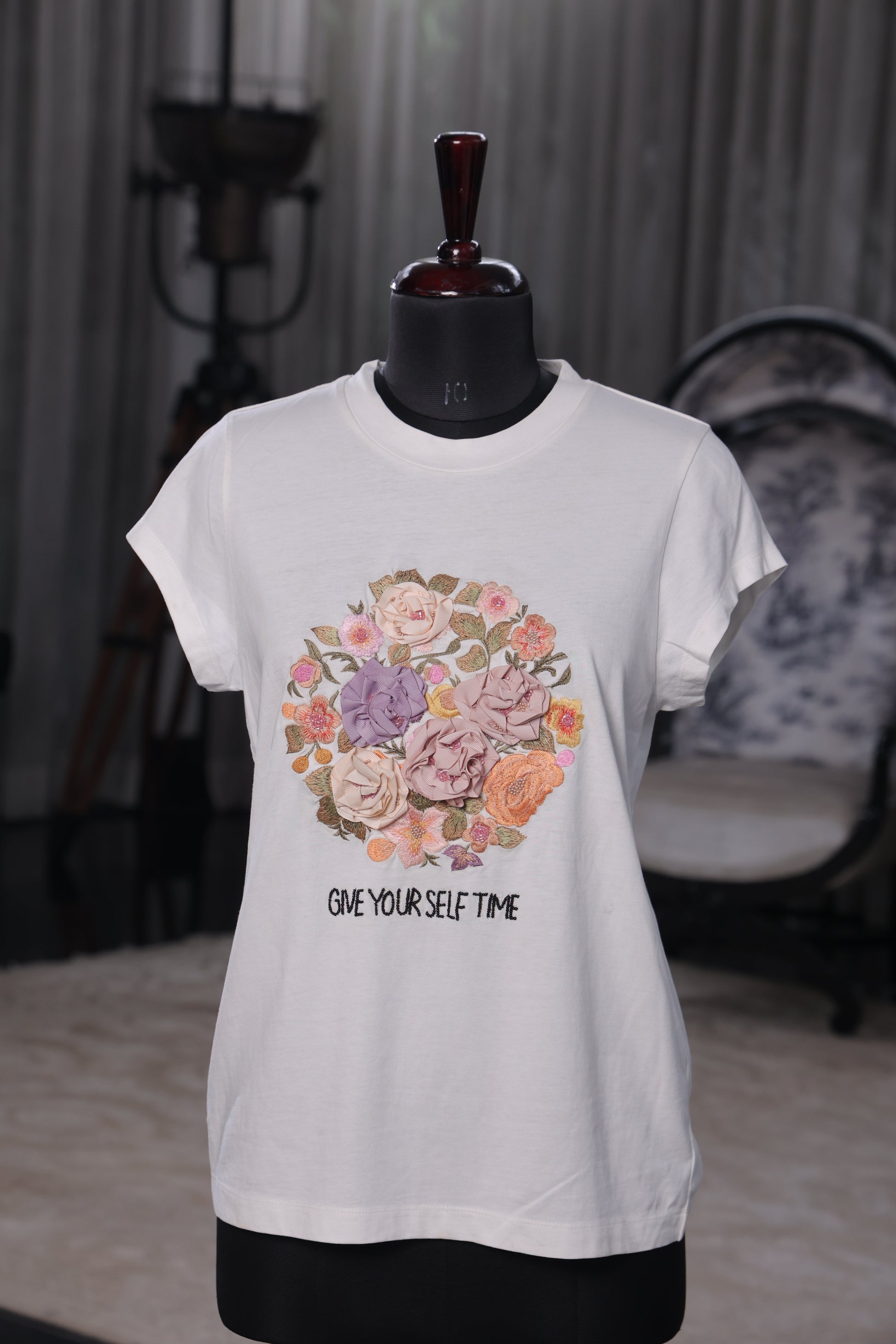 A white tee featuring a delicate, embroidered floral wreath with a motivational message, perfect for a soft and uplifting casual style.