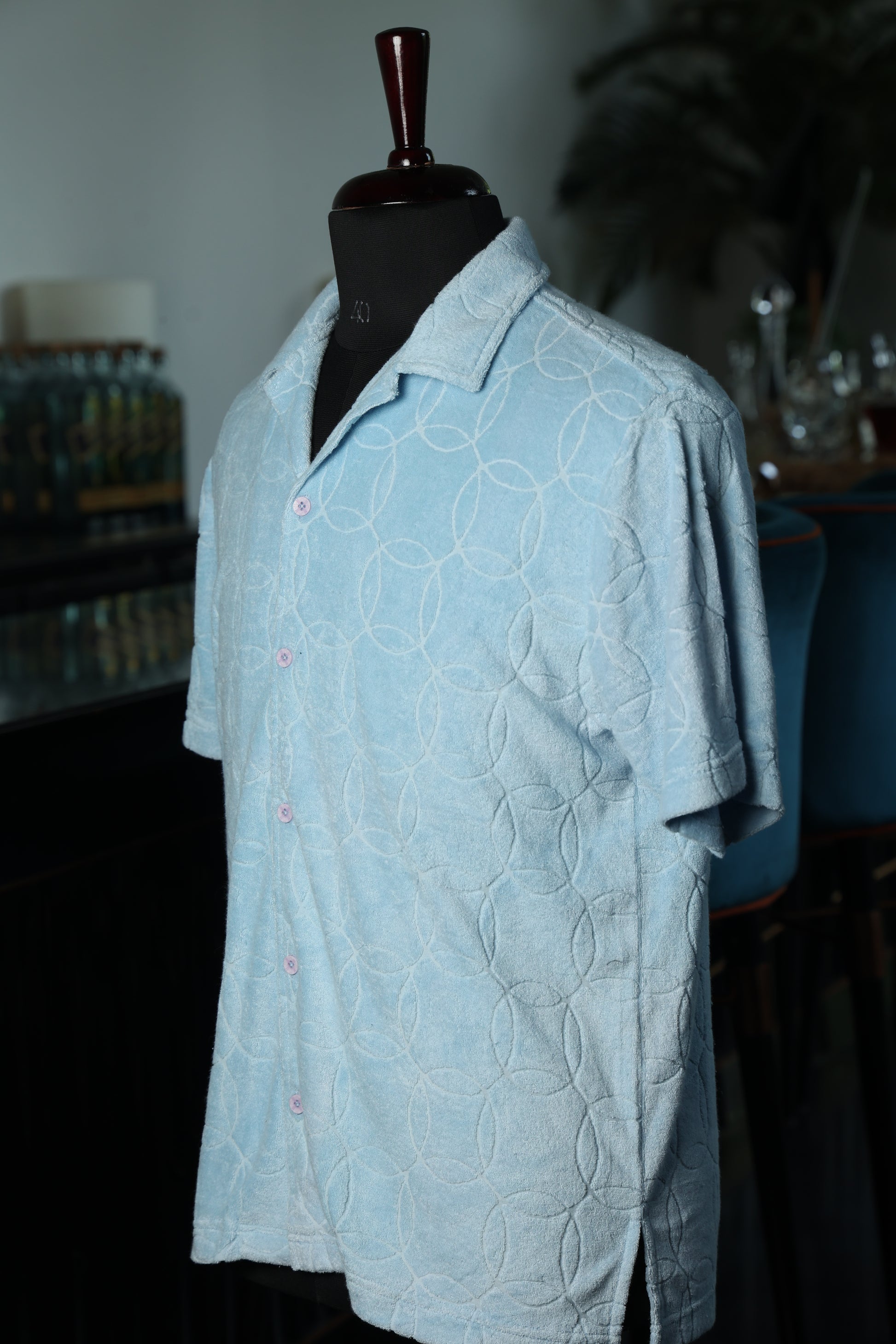 A short-sleeved, button-up shirt featuring a subtle textured pattern, offering a refined, casual look with a touch of elegance. Perfect for warm days and easy-going outings.
