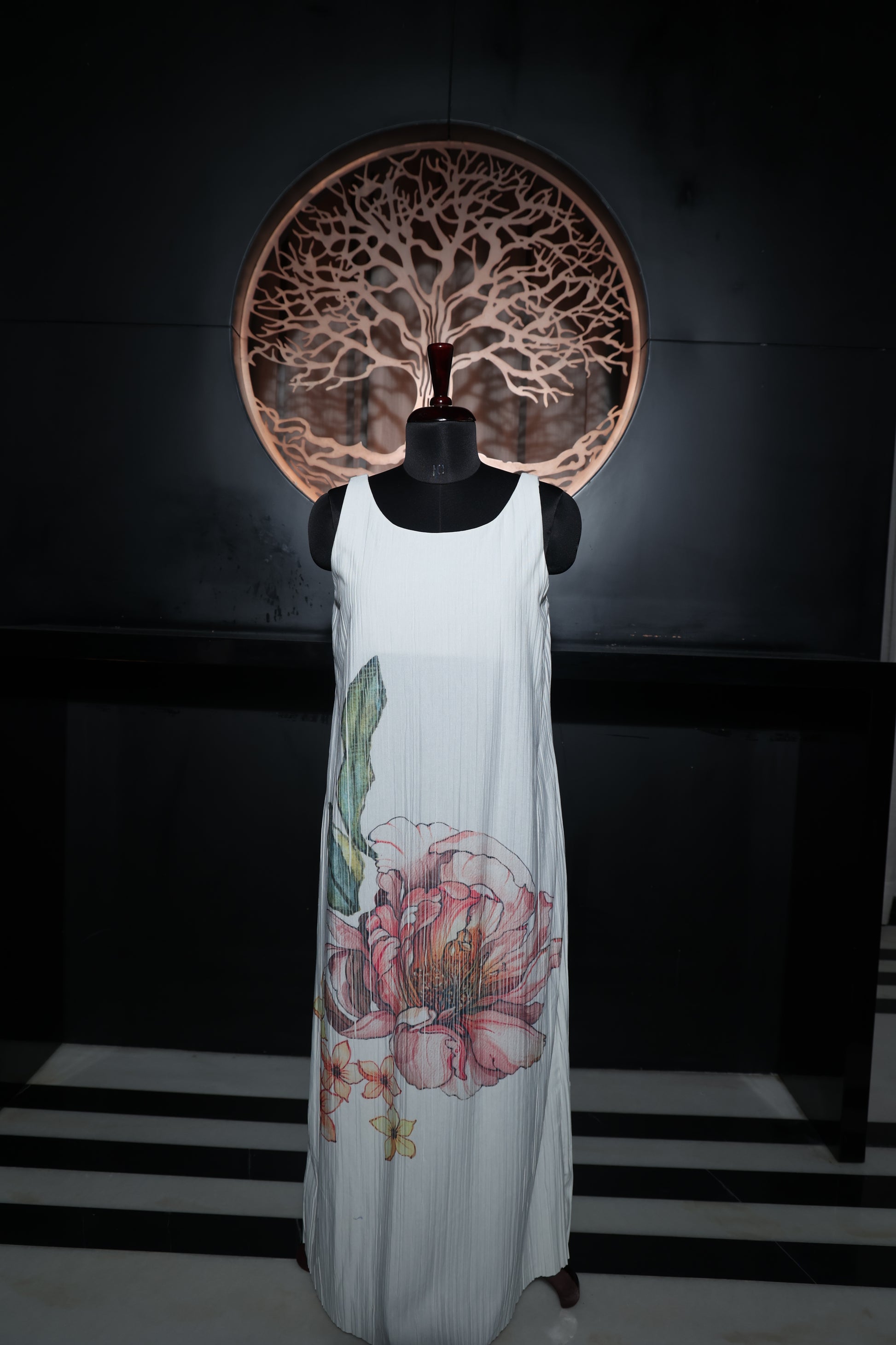 A timeless long white dress with a bold and artistic floral design, perfect for making a standout statement with elegance.