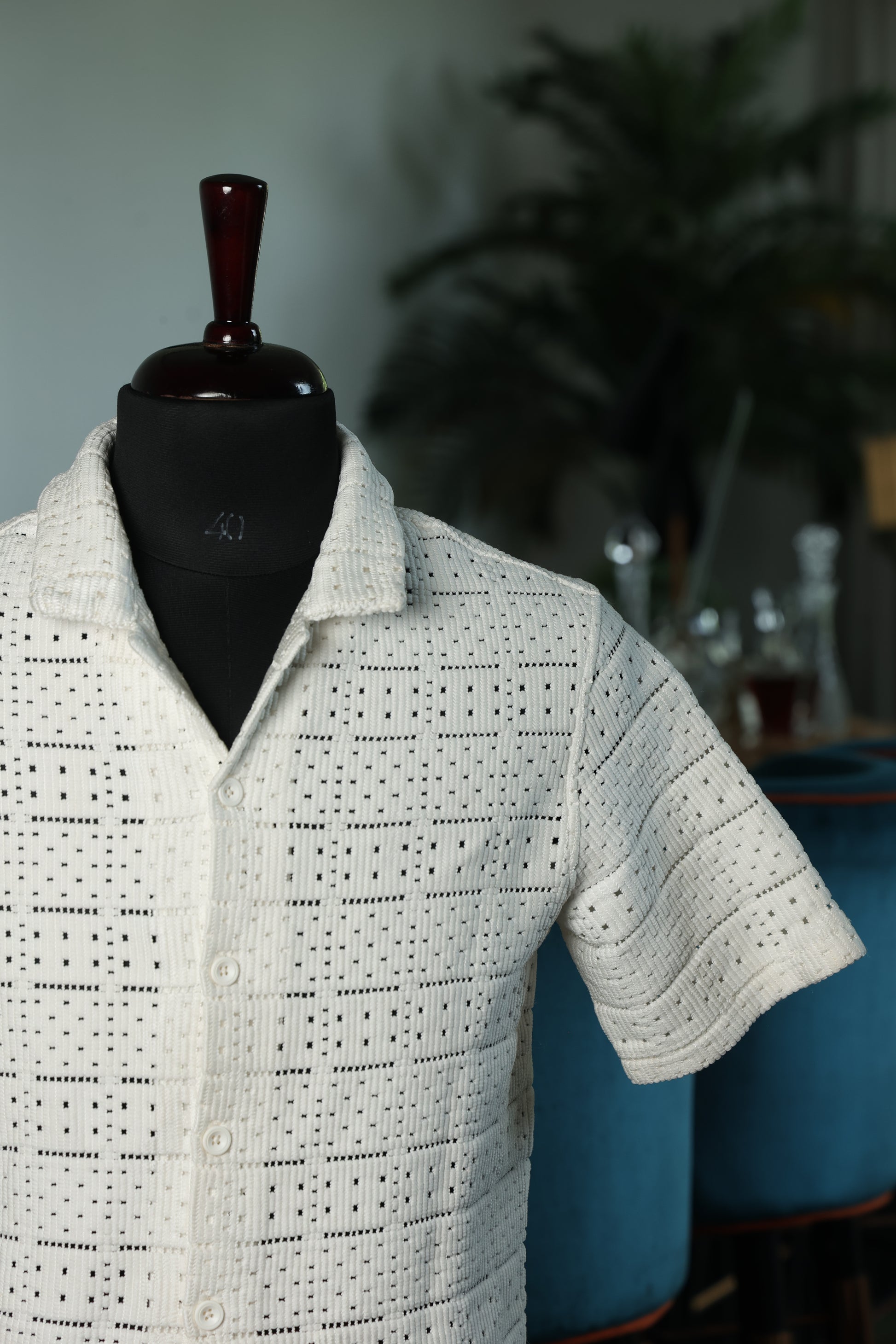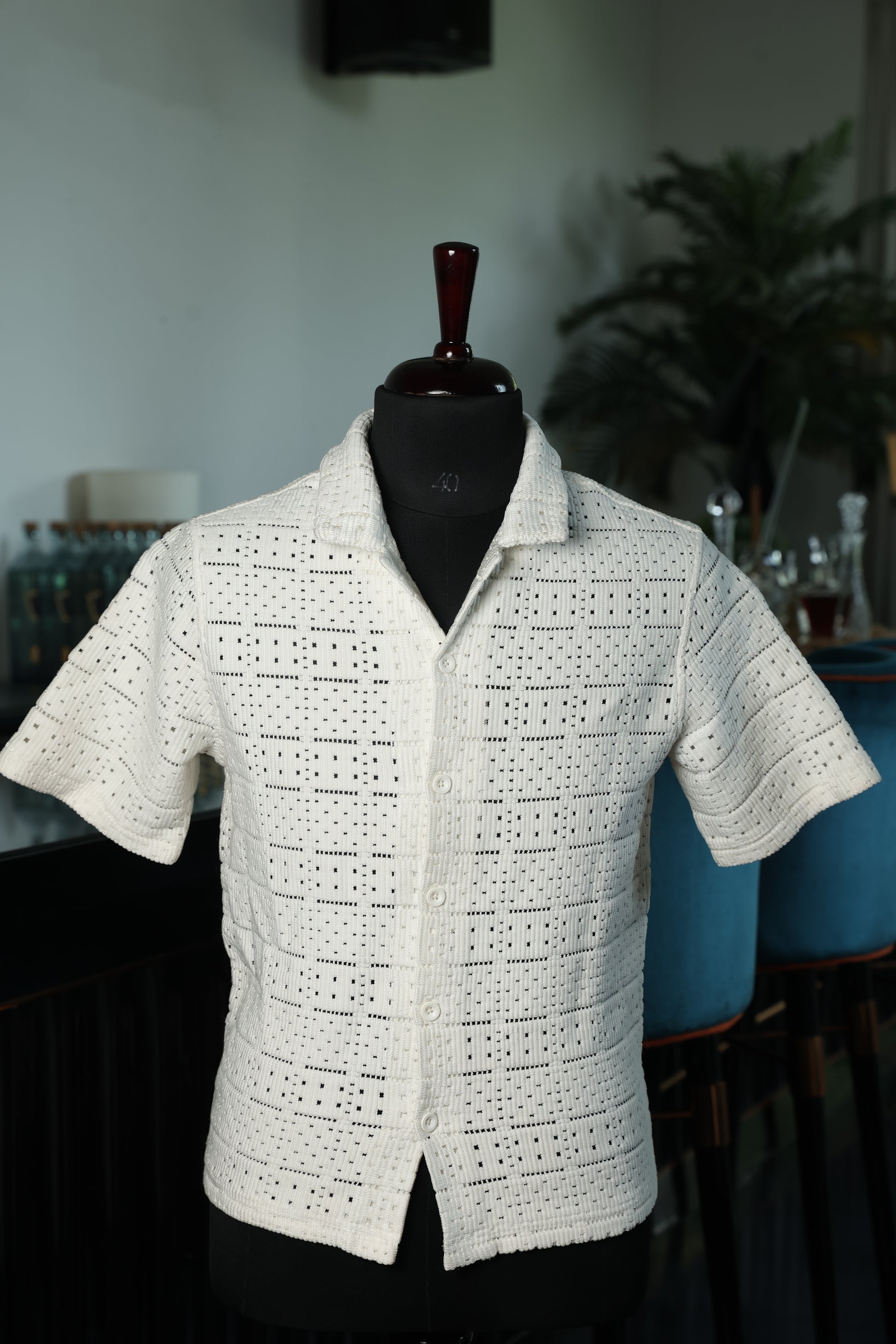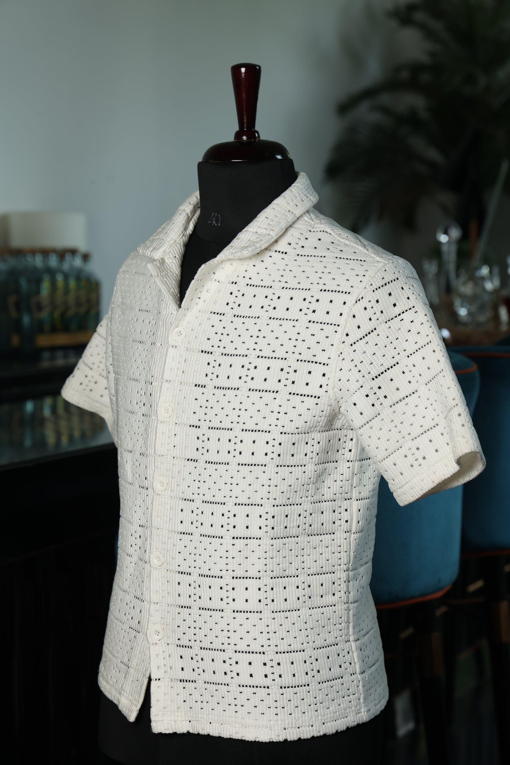 This Schiffli shirt features intricate embroidery with a clean, tailored fit, offering a perfect balance of craftsmanship and modern style.