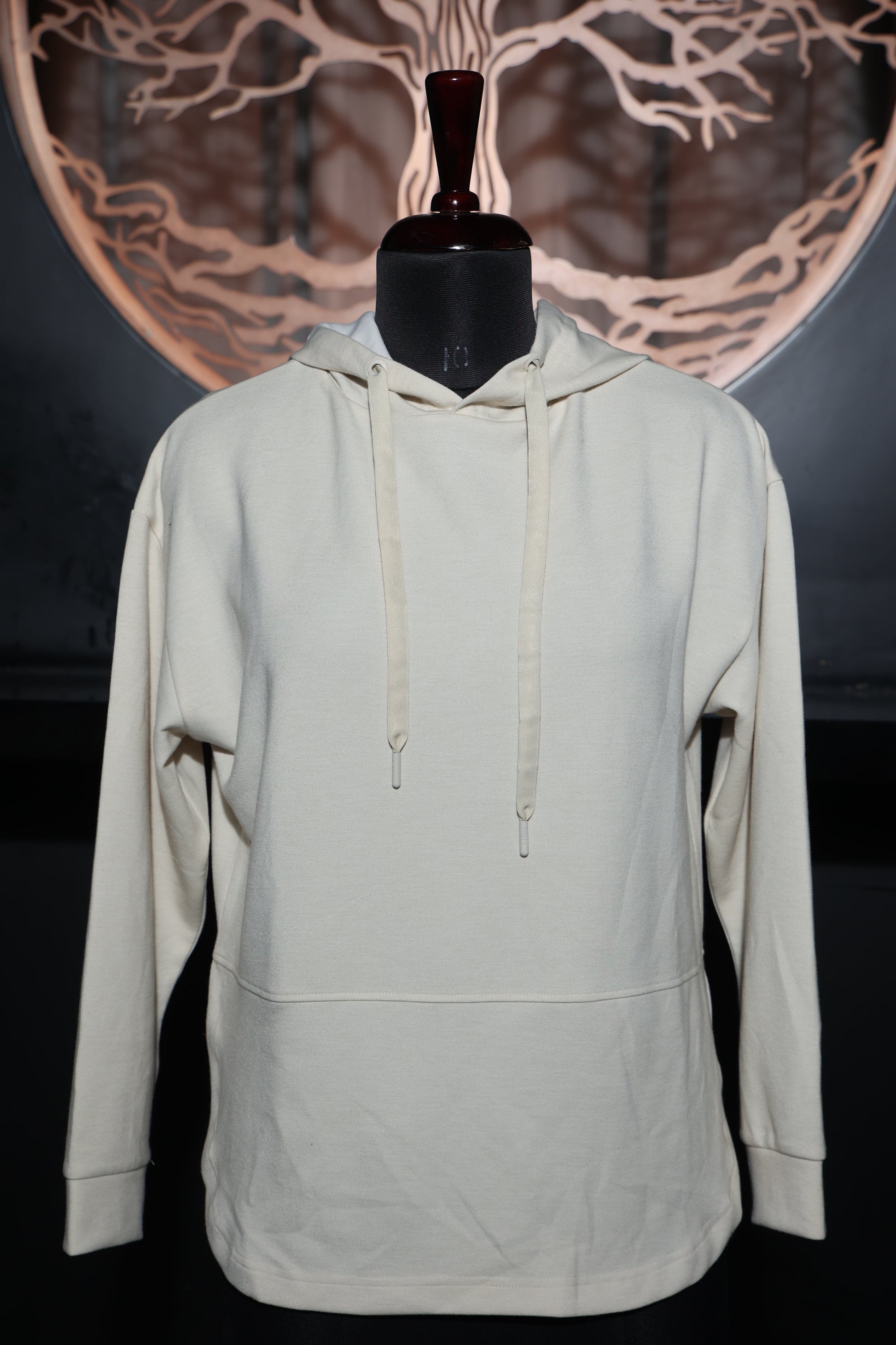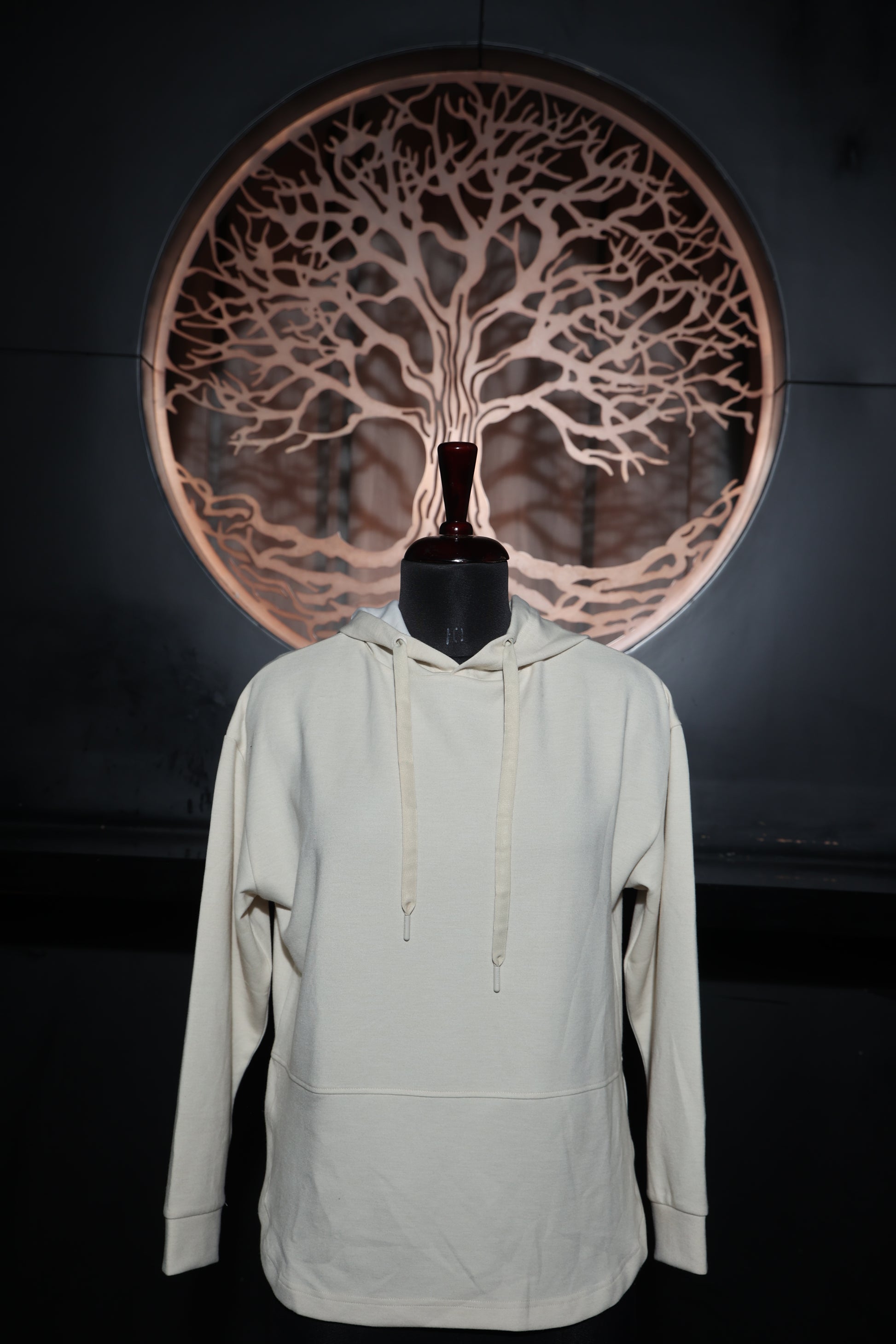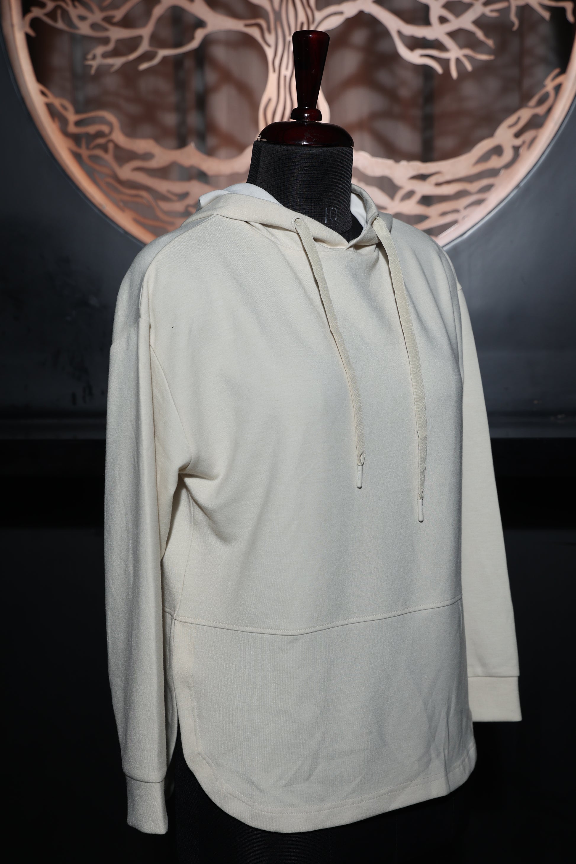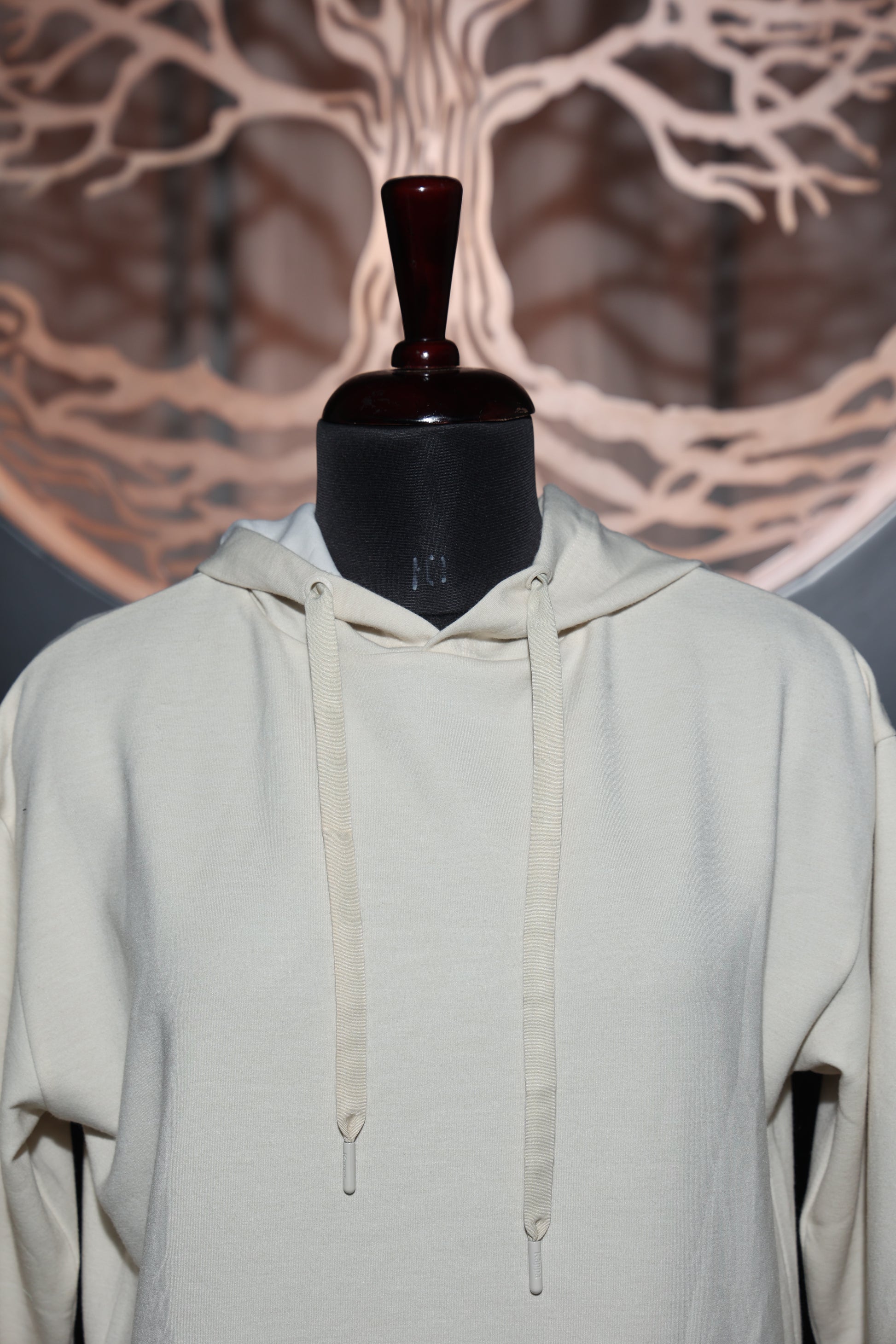 A cozy cream hoodie featuring a modern curved side cut, adding a unique twist to a classic style for an effortlessly relaxed look.