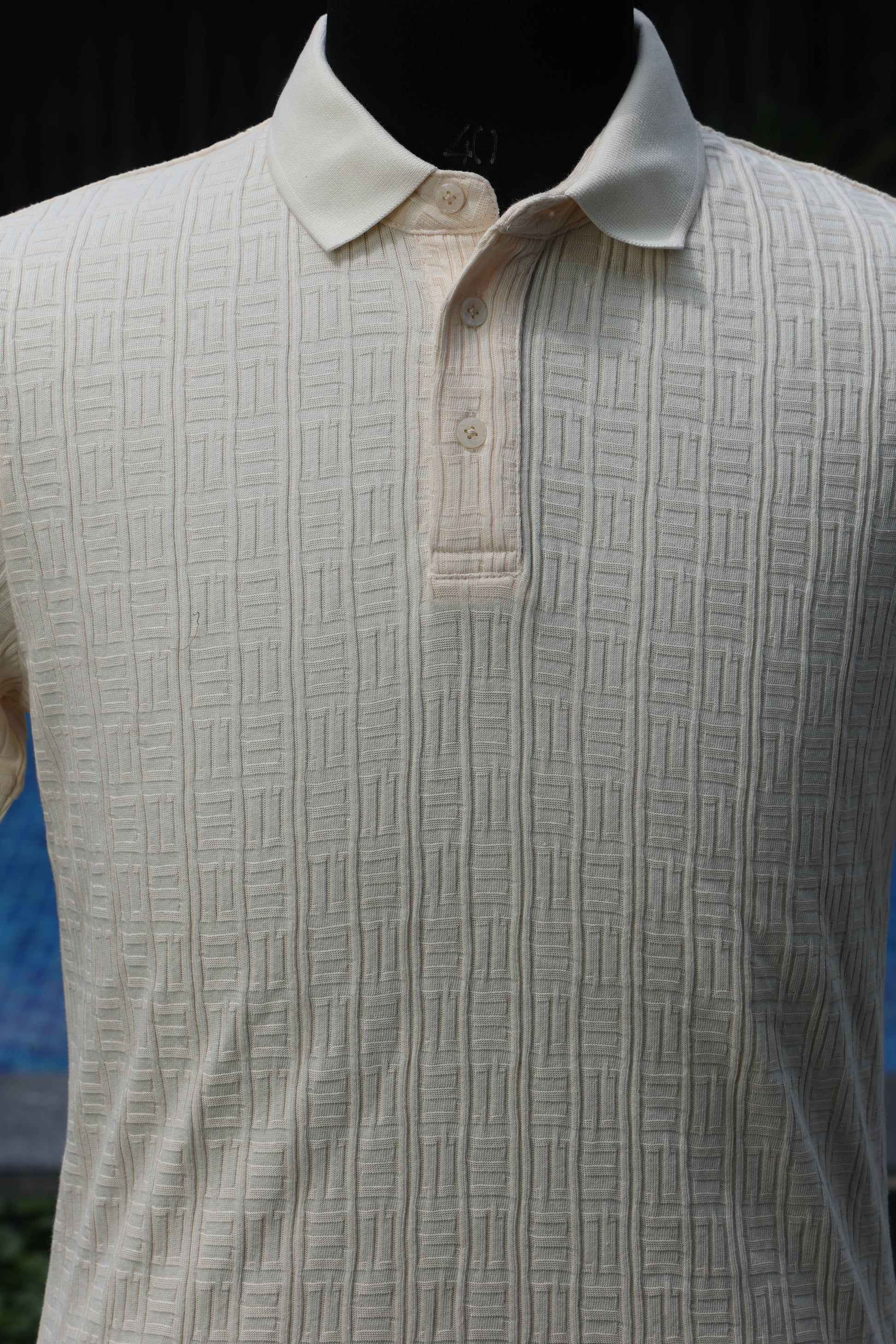 Elevate your style with this refined cream polo tee, featuring a textured geometric pattern that adds depth and character.