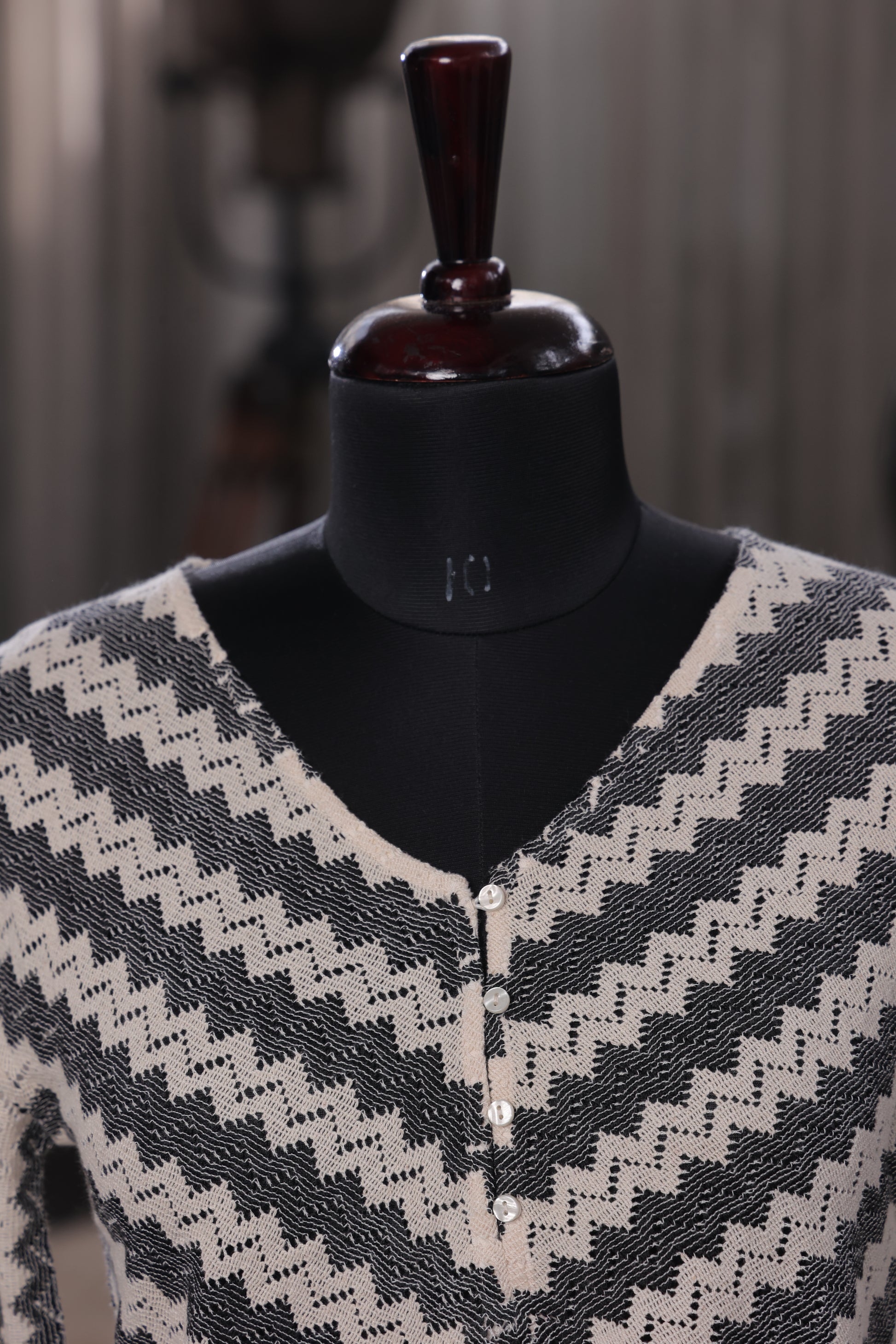 A cozy knit top featuring a zigzag chevron pattern with a relaxed, easygoing vibe.