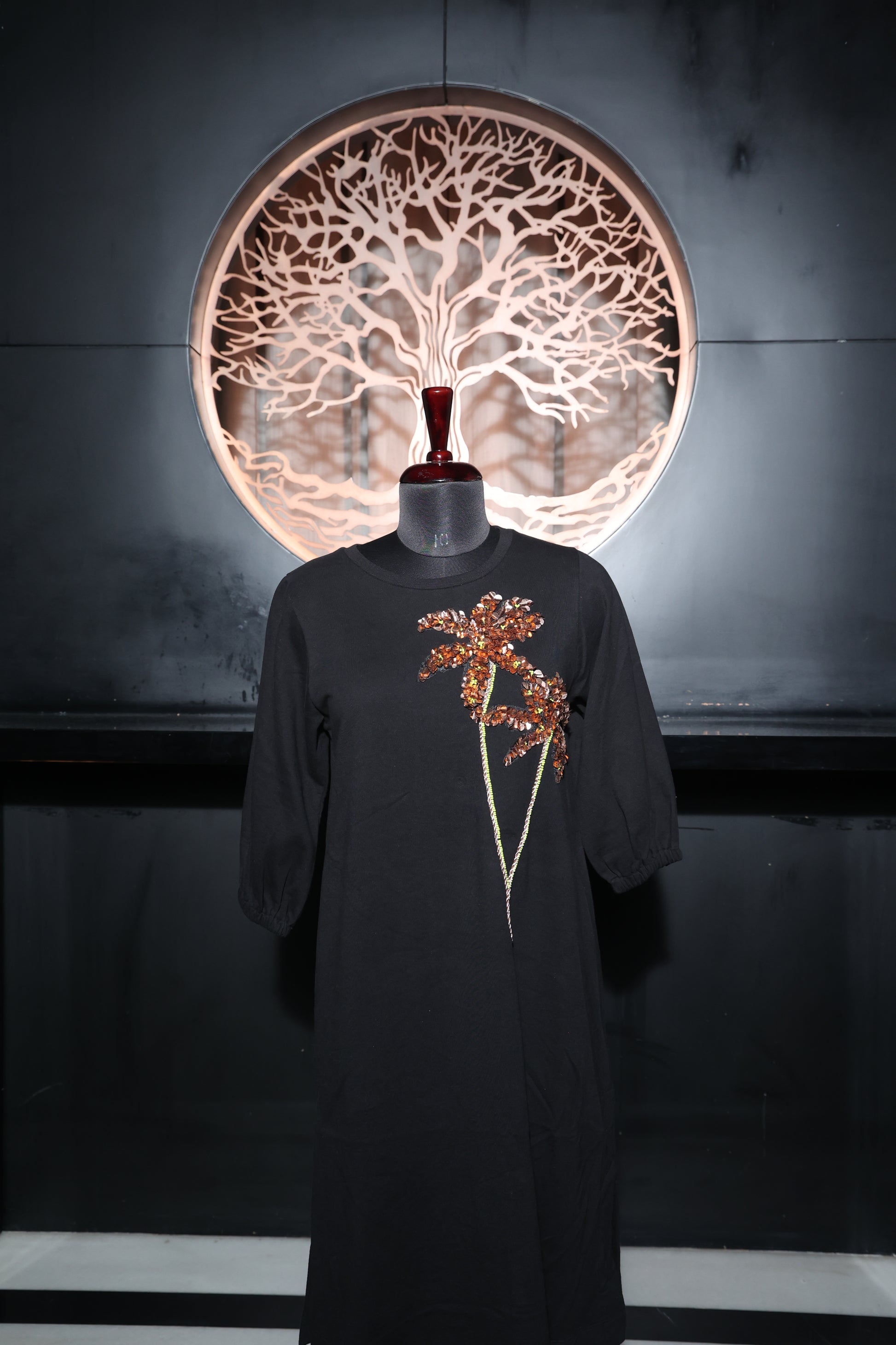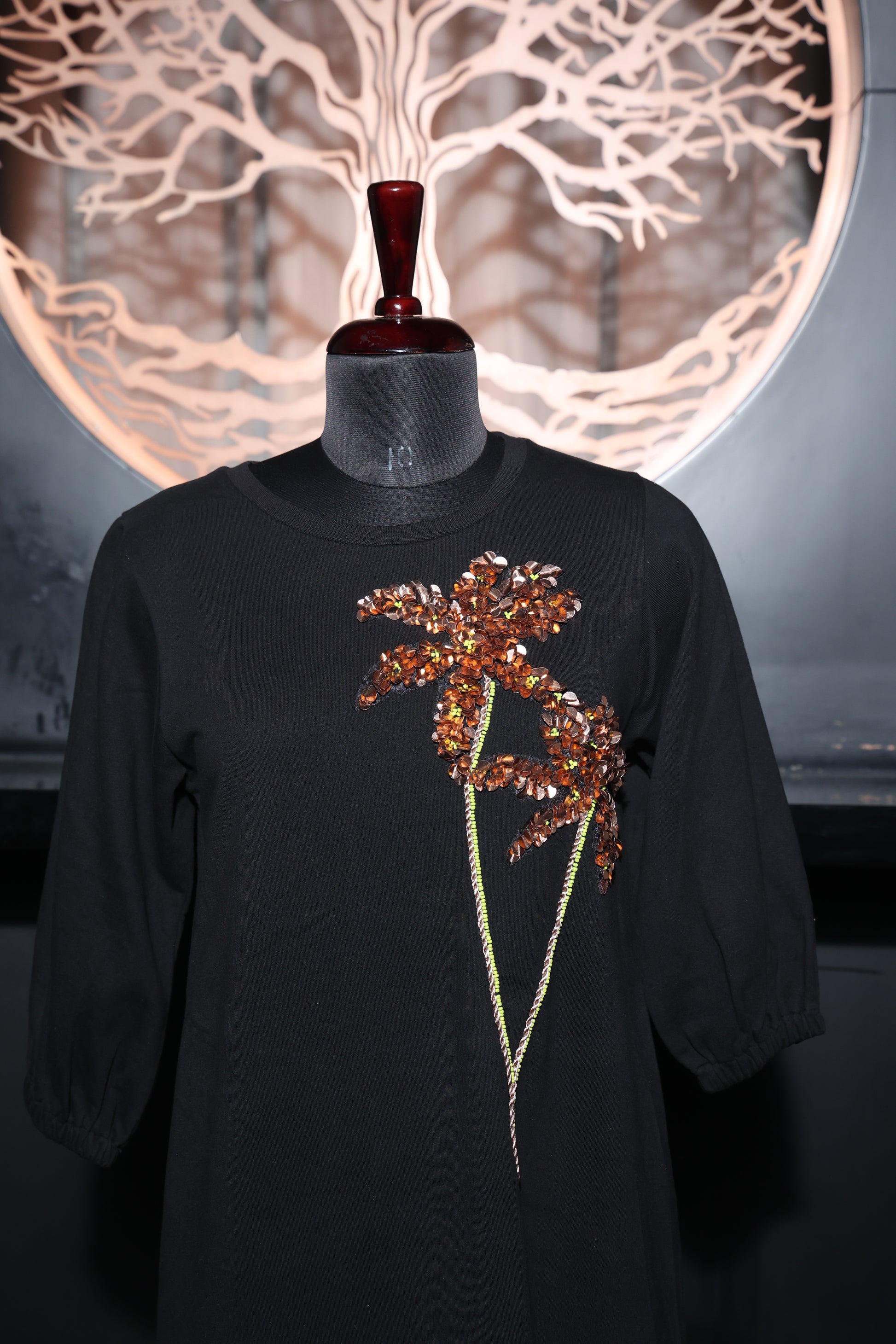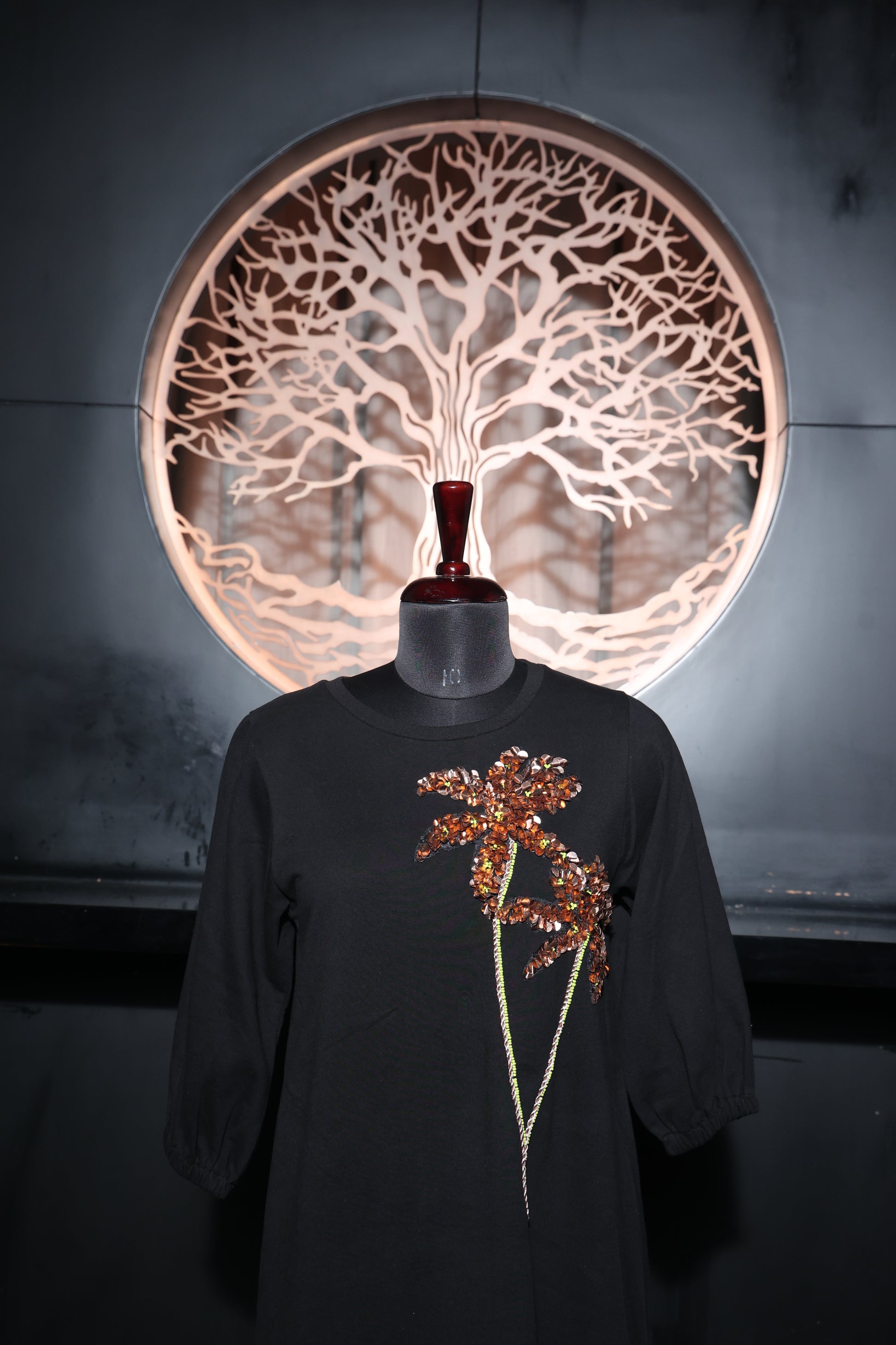 A sophisticated black dress featuring striking golden floral embroidery. With its elegant silhouette and artistic detailing, this piece effortlessly blends timeless style with a modern artistic touch.