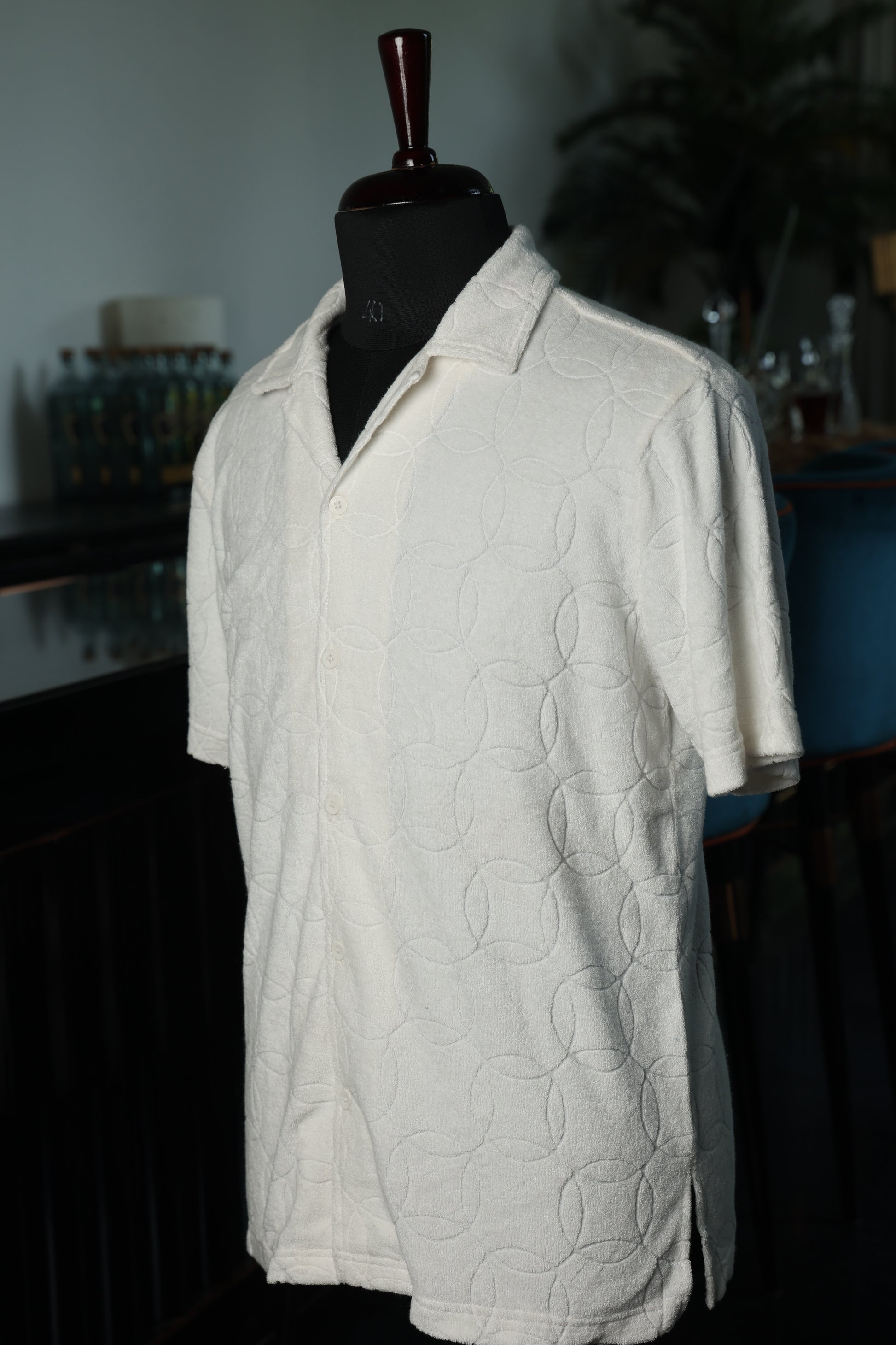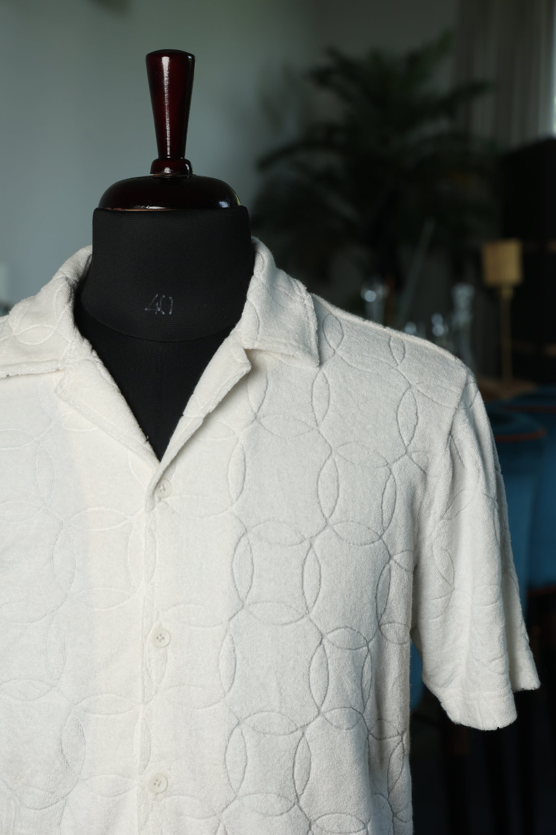 A short-sleeved, button-up shirt featuring a subtle textured pattern, offering a refined, casual look with a touch of elegance. Perfect for warm days and easy-going outings.