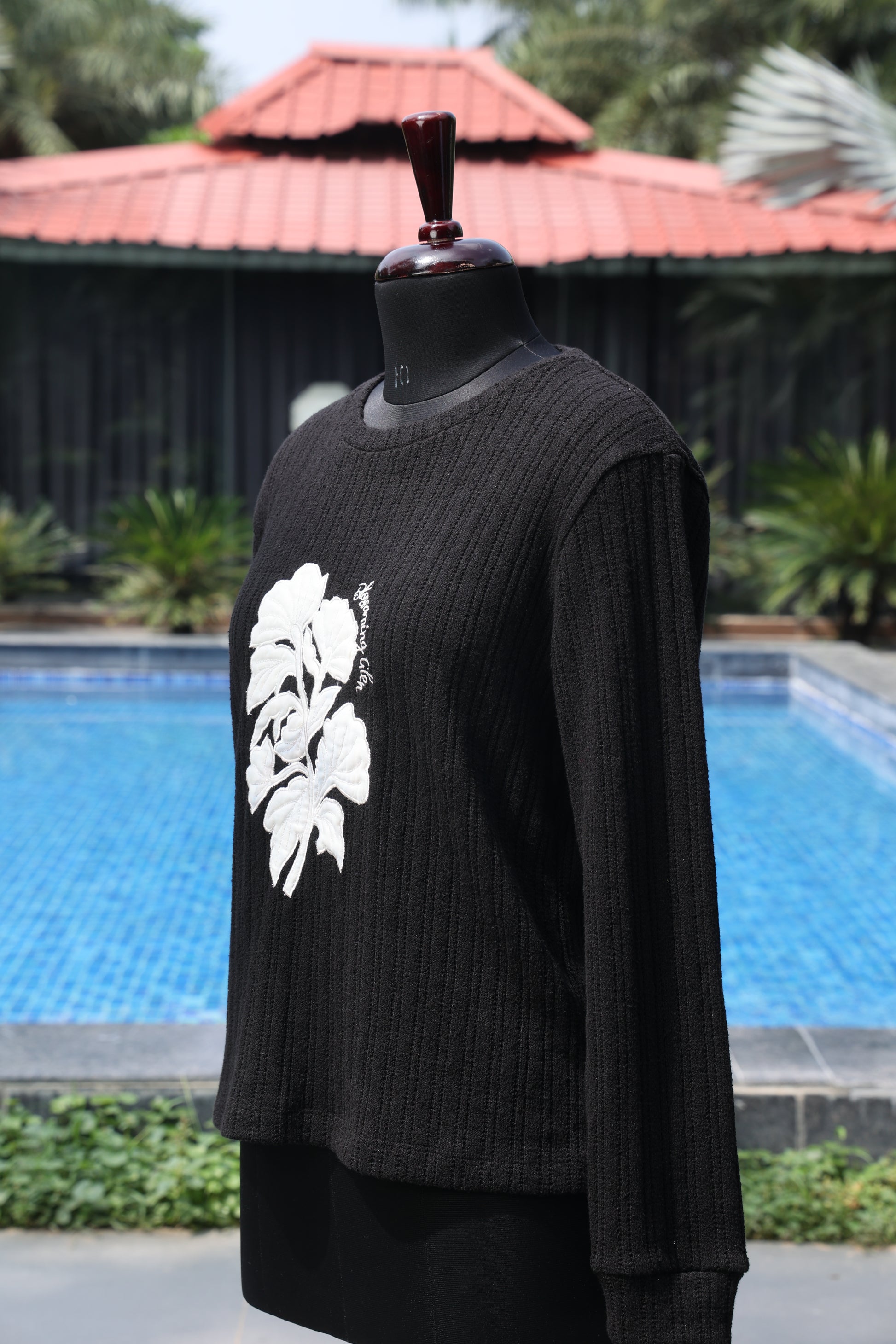 Embrace the beauty of contrasts with our black textured top featuring an elegant white floral print.