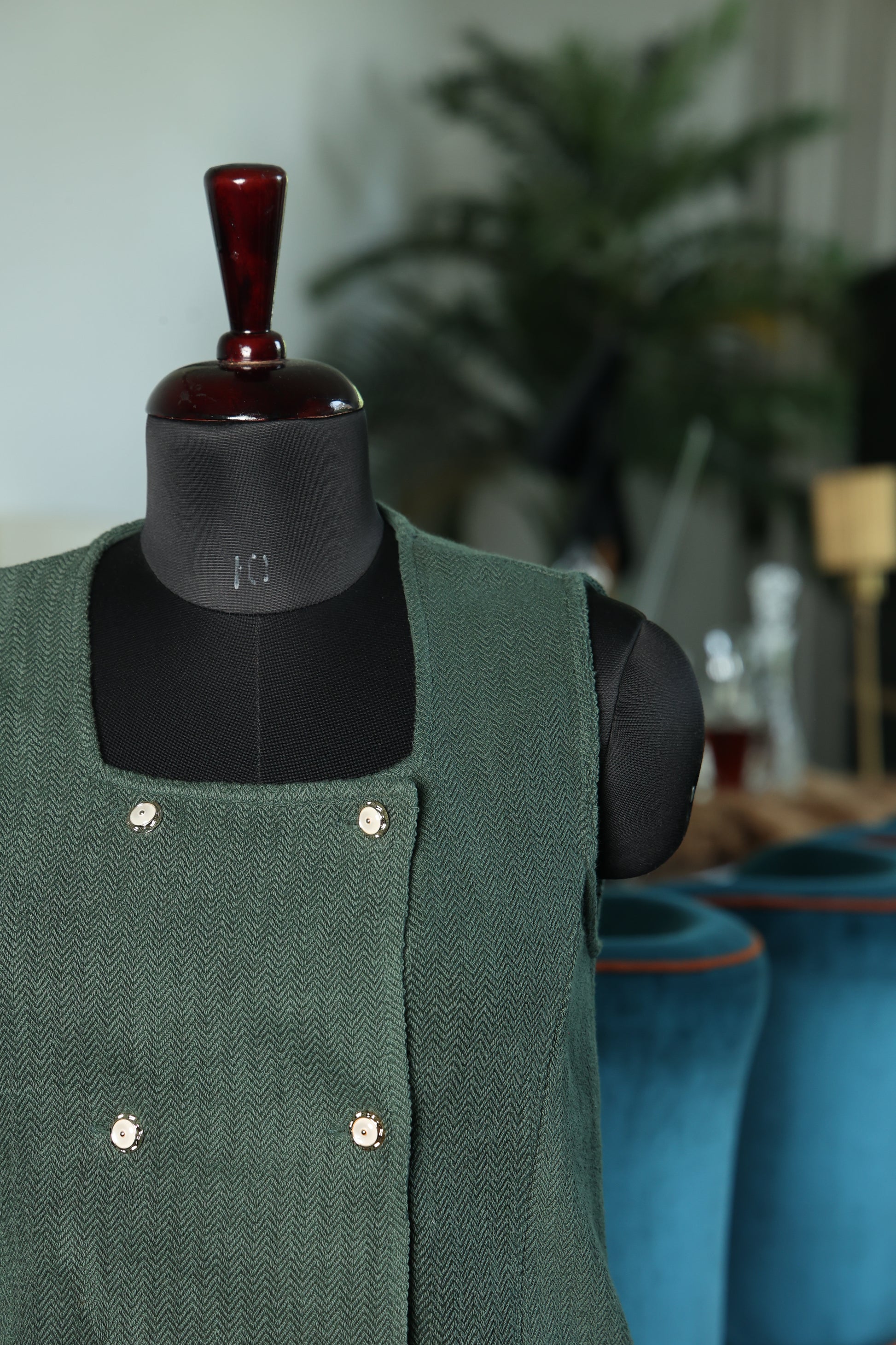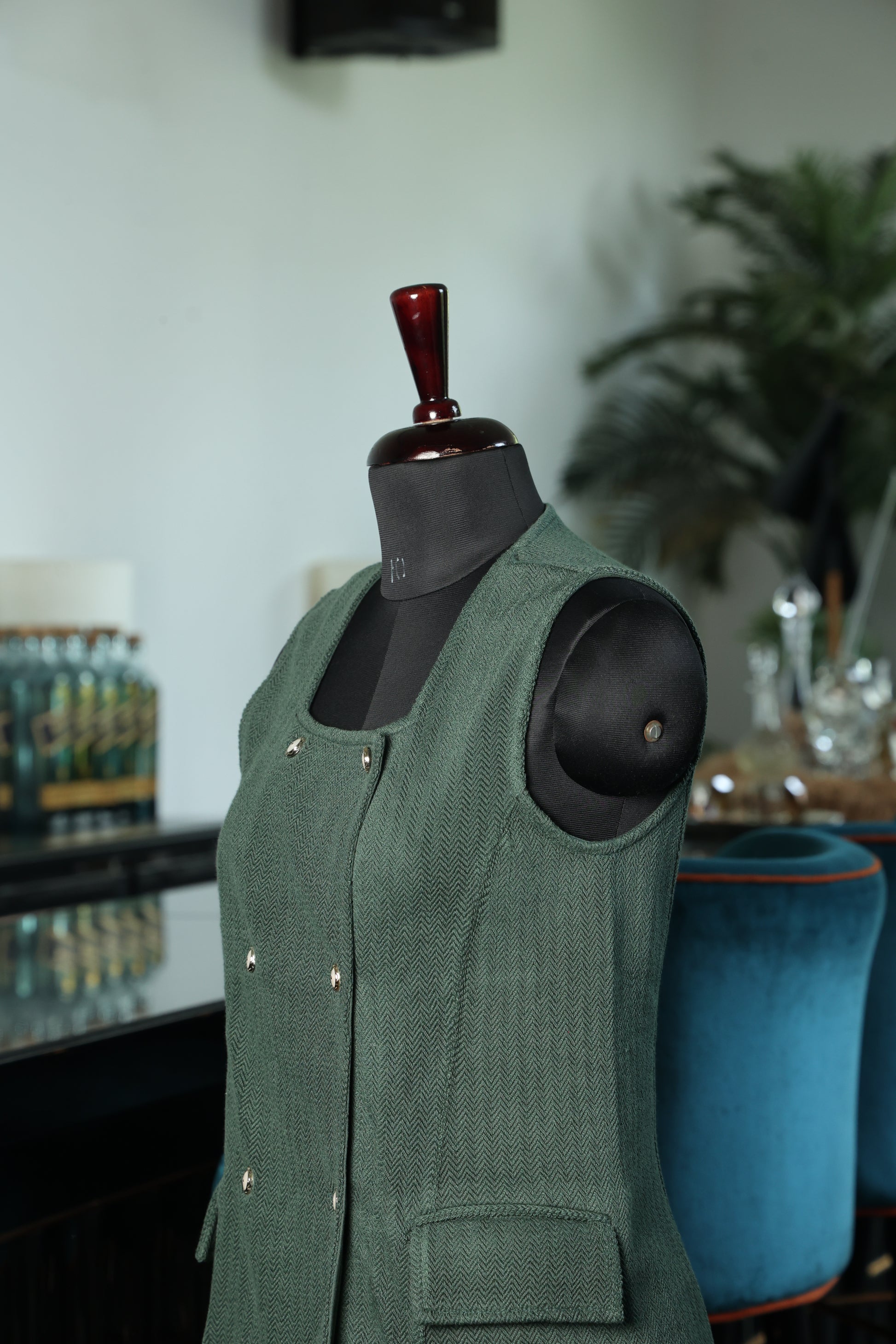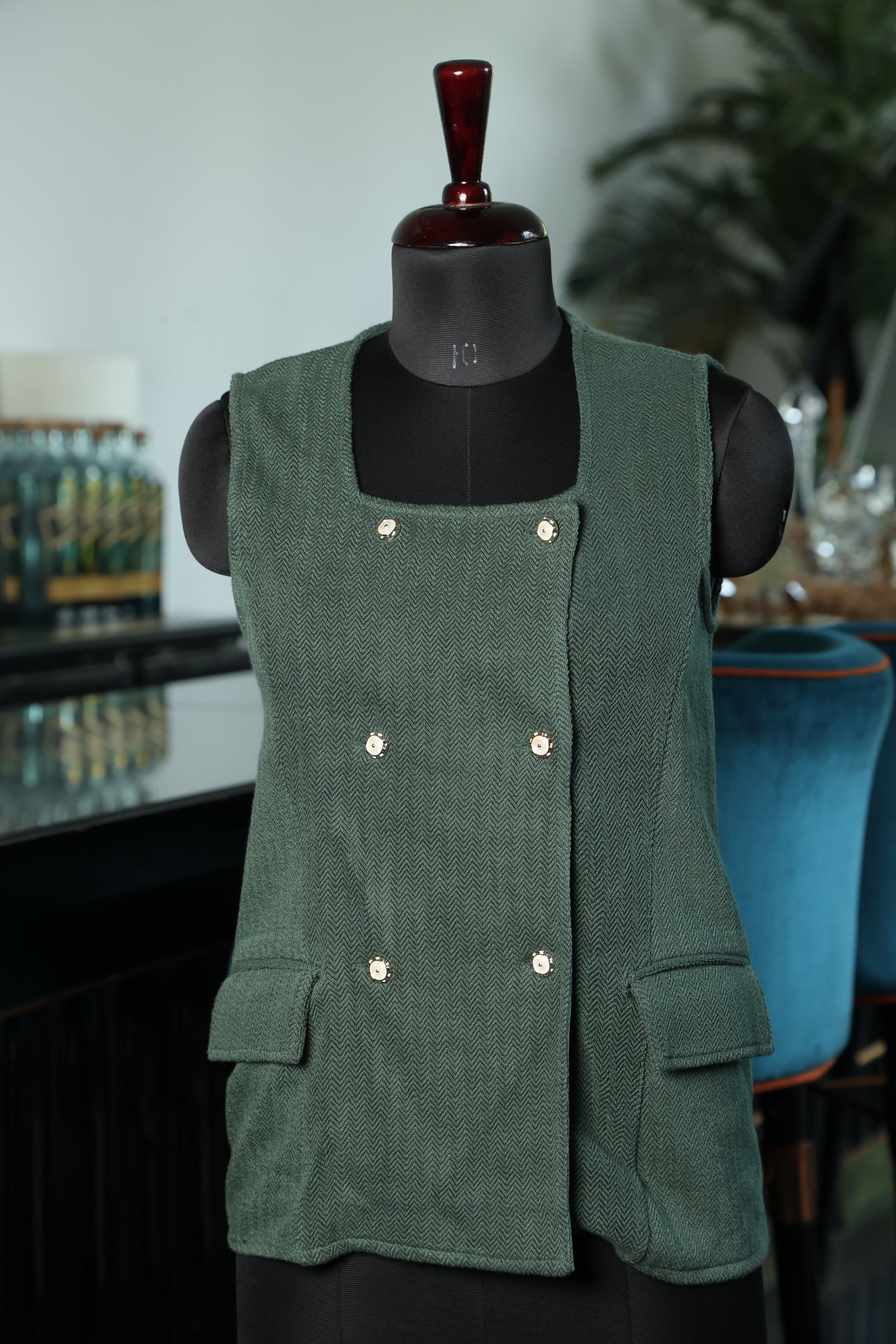 A sophisticated sleeveless vest in a deep green hue, this piece features a double-breasted front with elegant button accents and flap pockets for a classic touch. Its structured fit and subtle texture add depth to the design, making it a versatile addition for layering over casual or smart outfits.