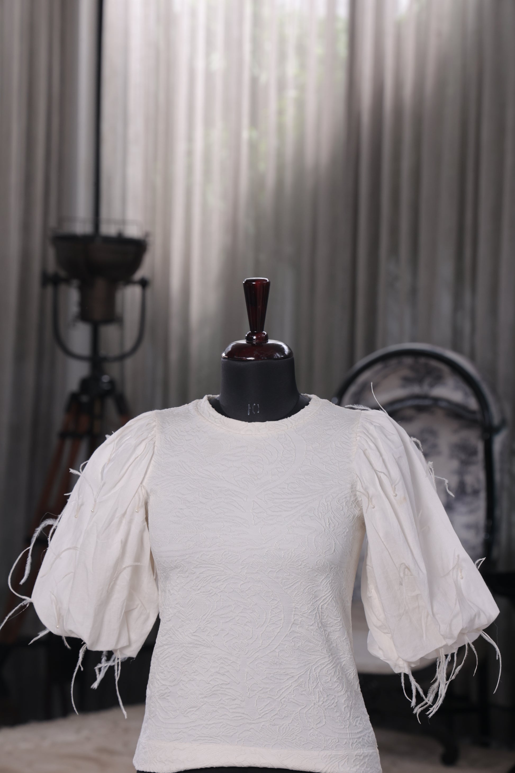 This white blouse features playful puff sleeves that beautifully frame the shoulders, enhanced by cascading raw feather-like strings. Wear it to showcase your individuality while staying effortlessly chic.