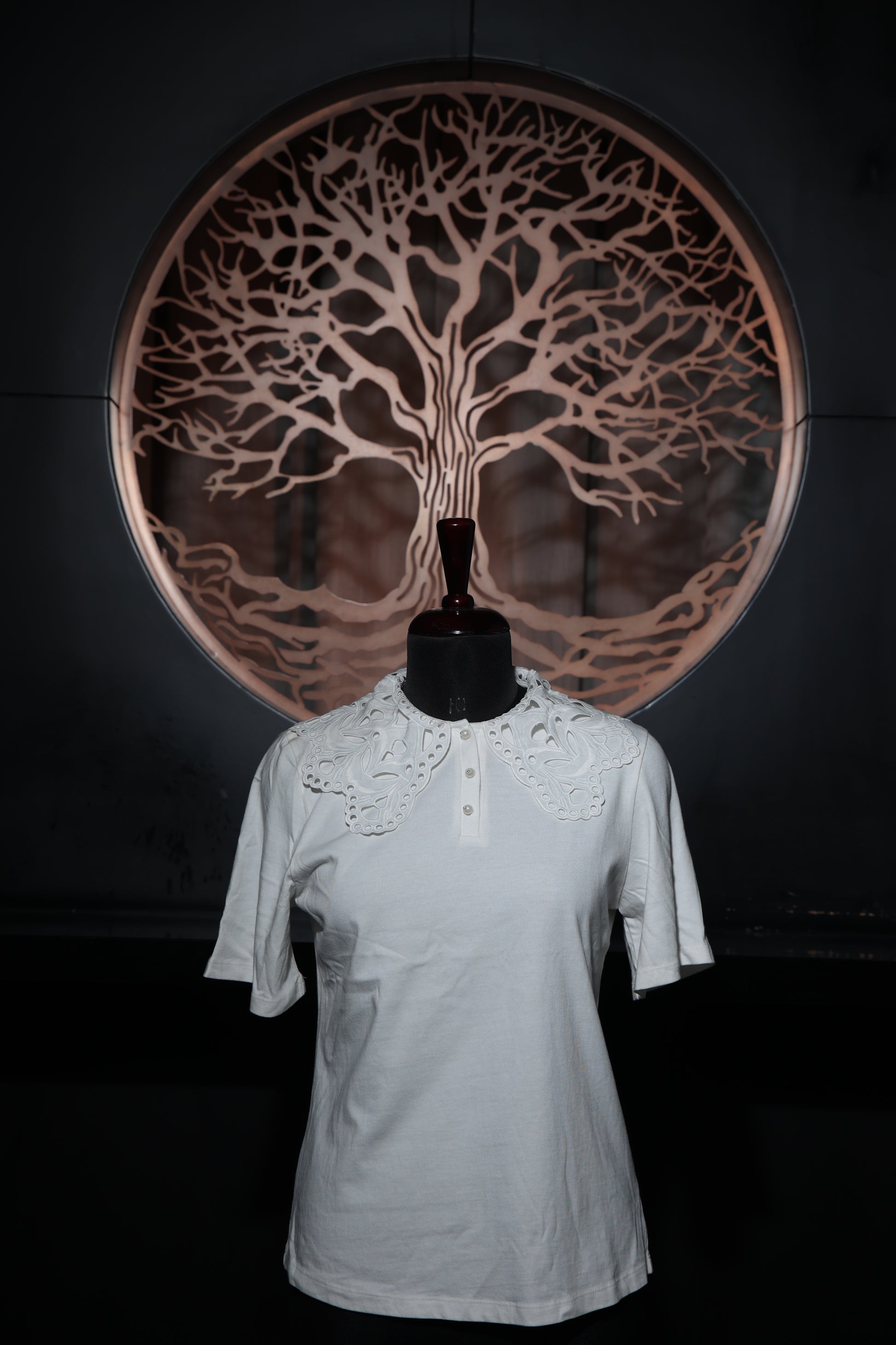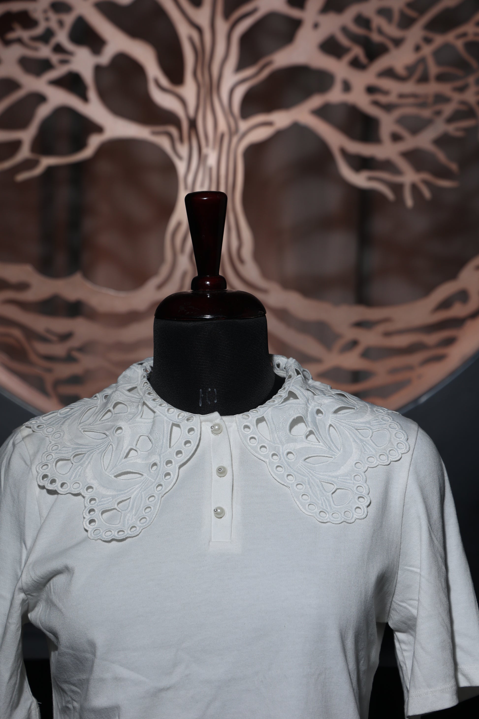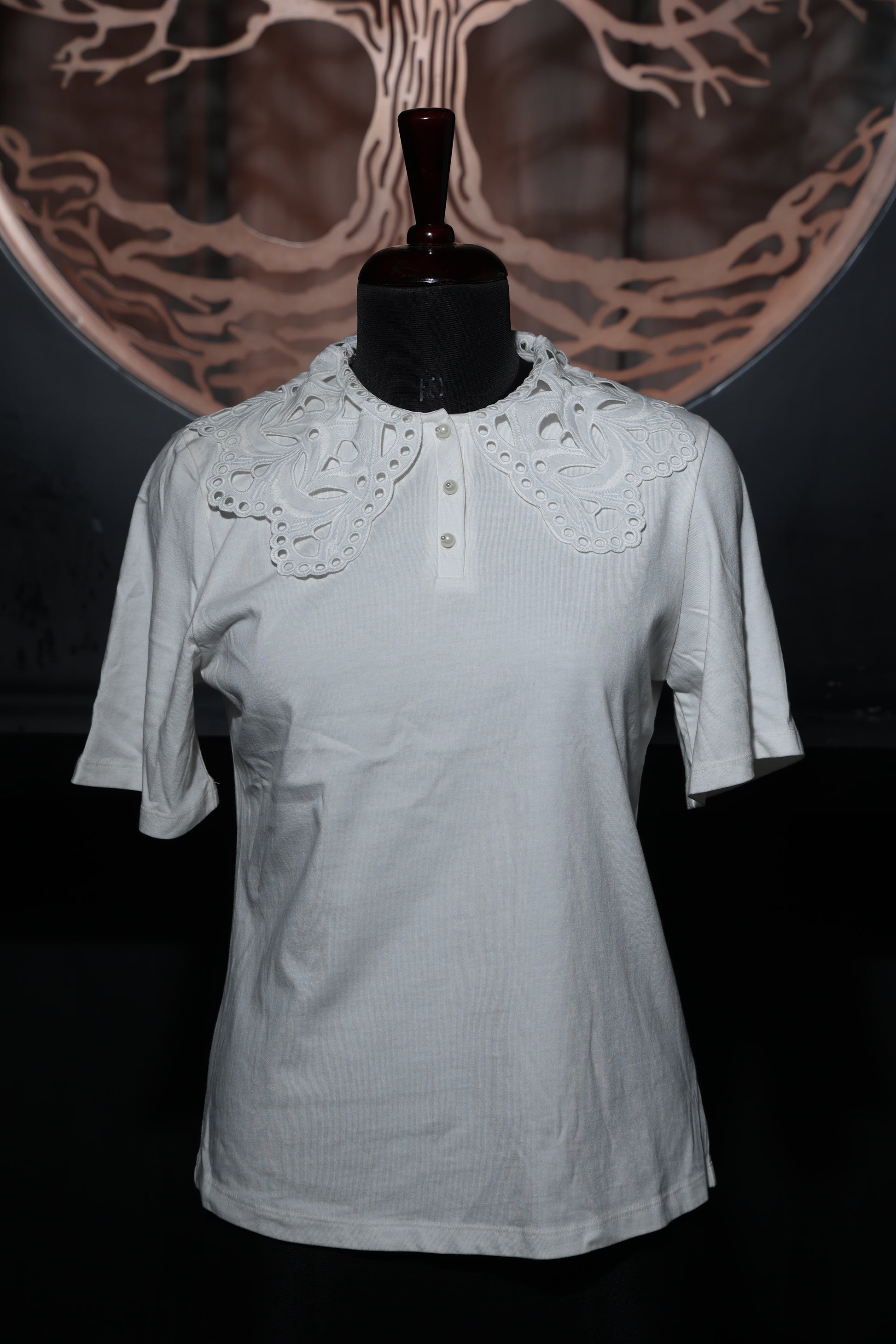 Beautiful combination of delicate schiffli collar with a soft, short-sleeve white design, offering a perfect balance of elegance and simplicity.