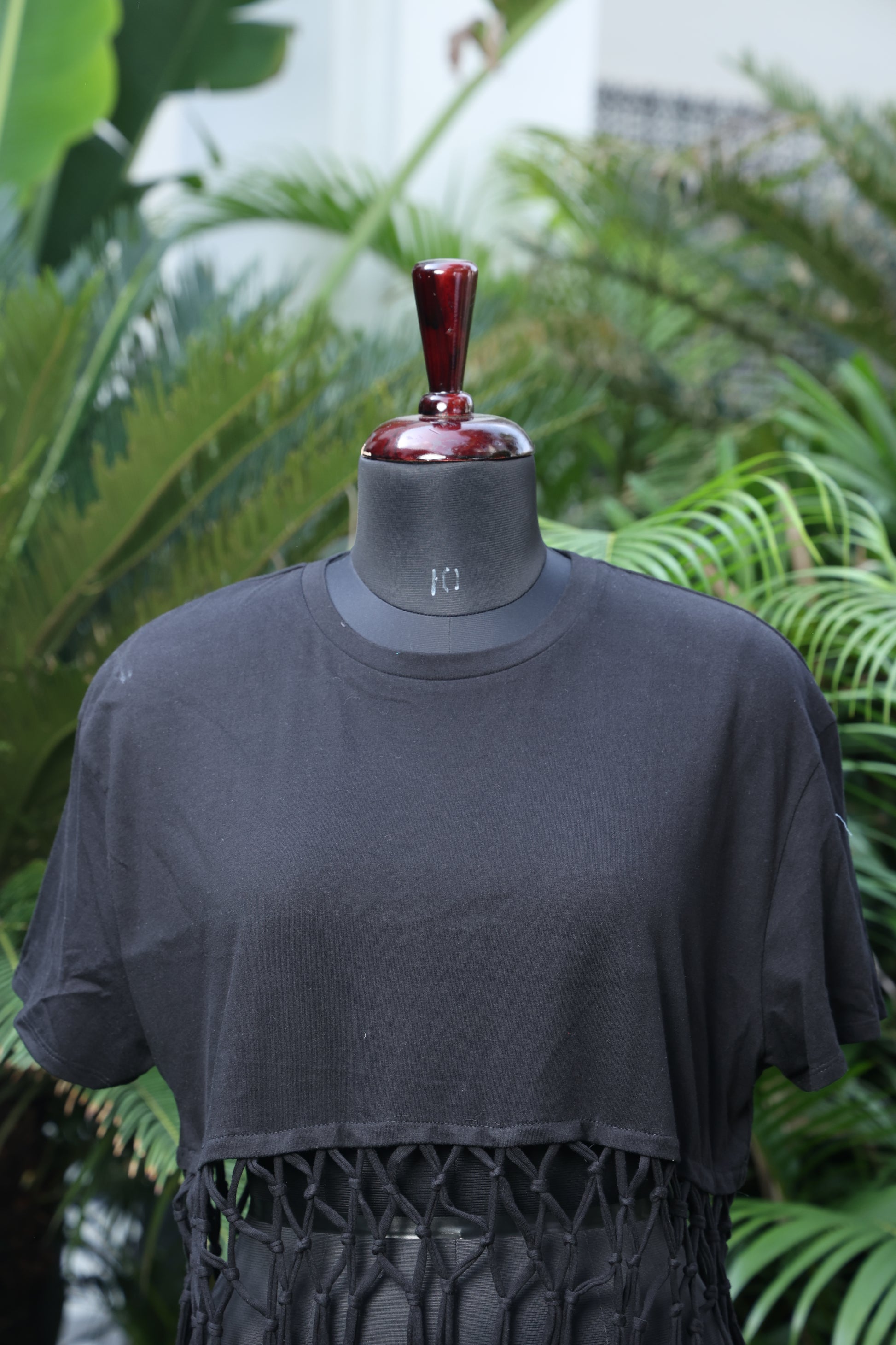 The Fringe Edge Cropped Black Top adds a bold twist to your style with its sleek black design and thick fringe detailing along the hem.