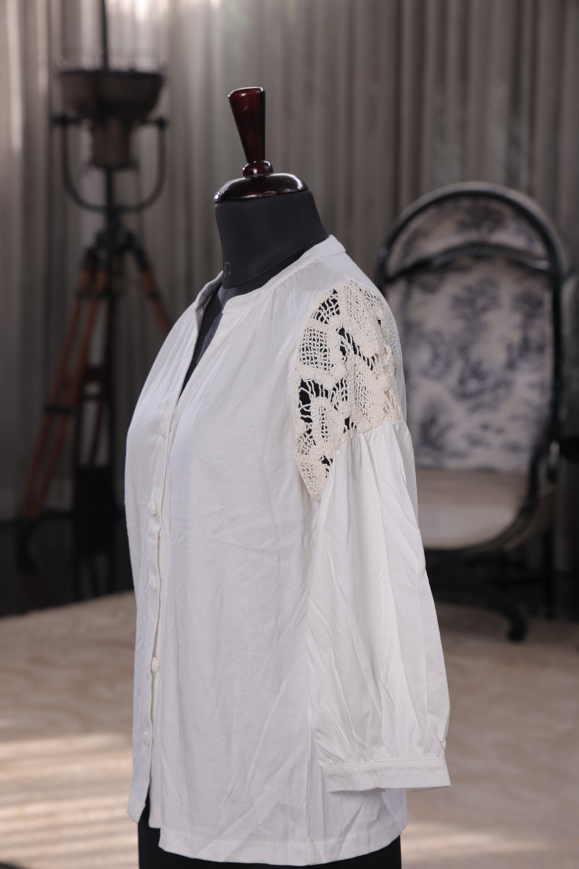 A refined button up top with subtle lace detailing on the shoulders, adding a touch of grace and femininity to your everyday style. Perfect for an elegant yet casual look.