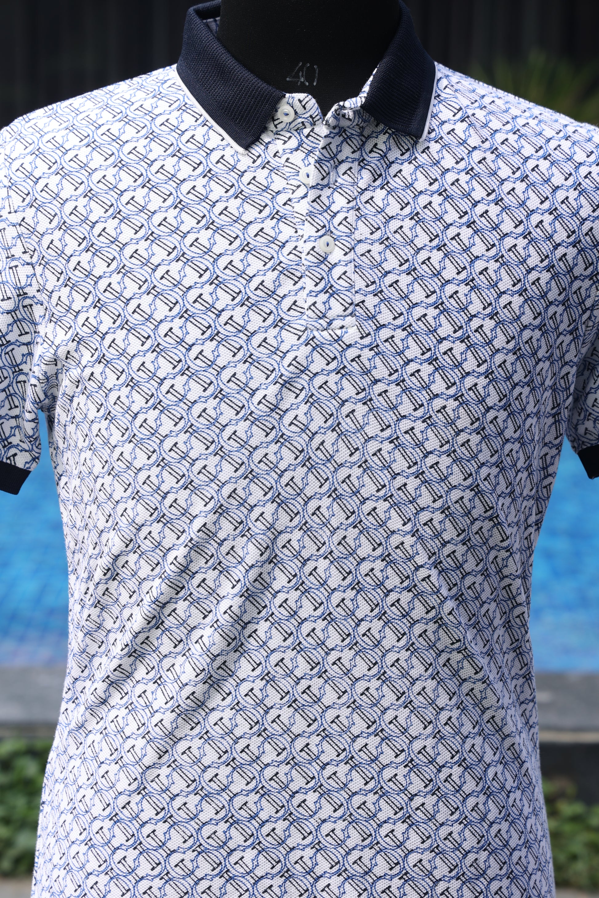 Elevate your casual style with this patterned blue polo, featuring a refined all-over geometric design. Perfect for both relaxed weekends and smart-casual outings.