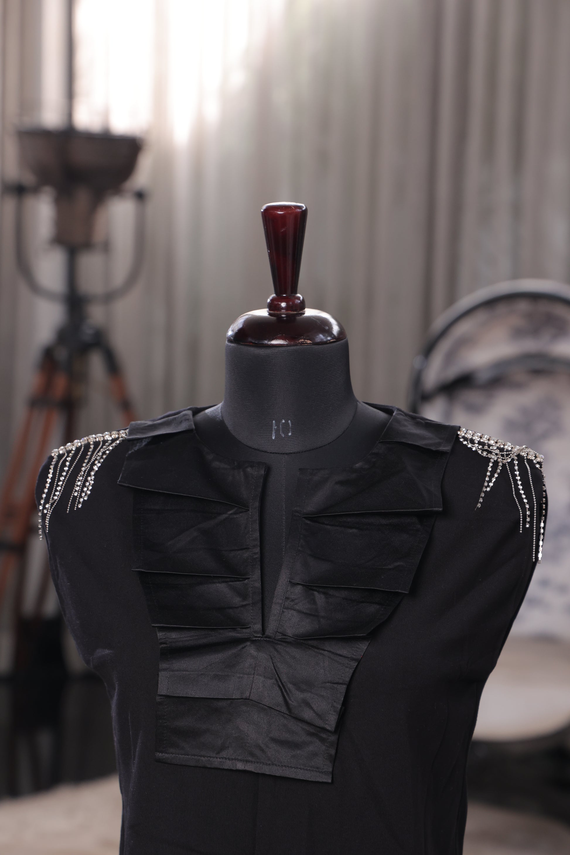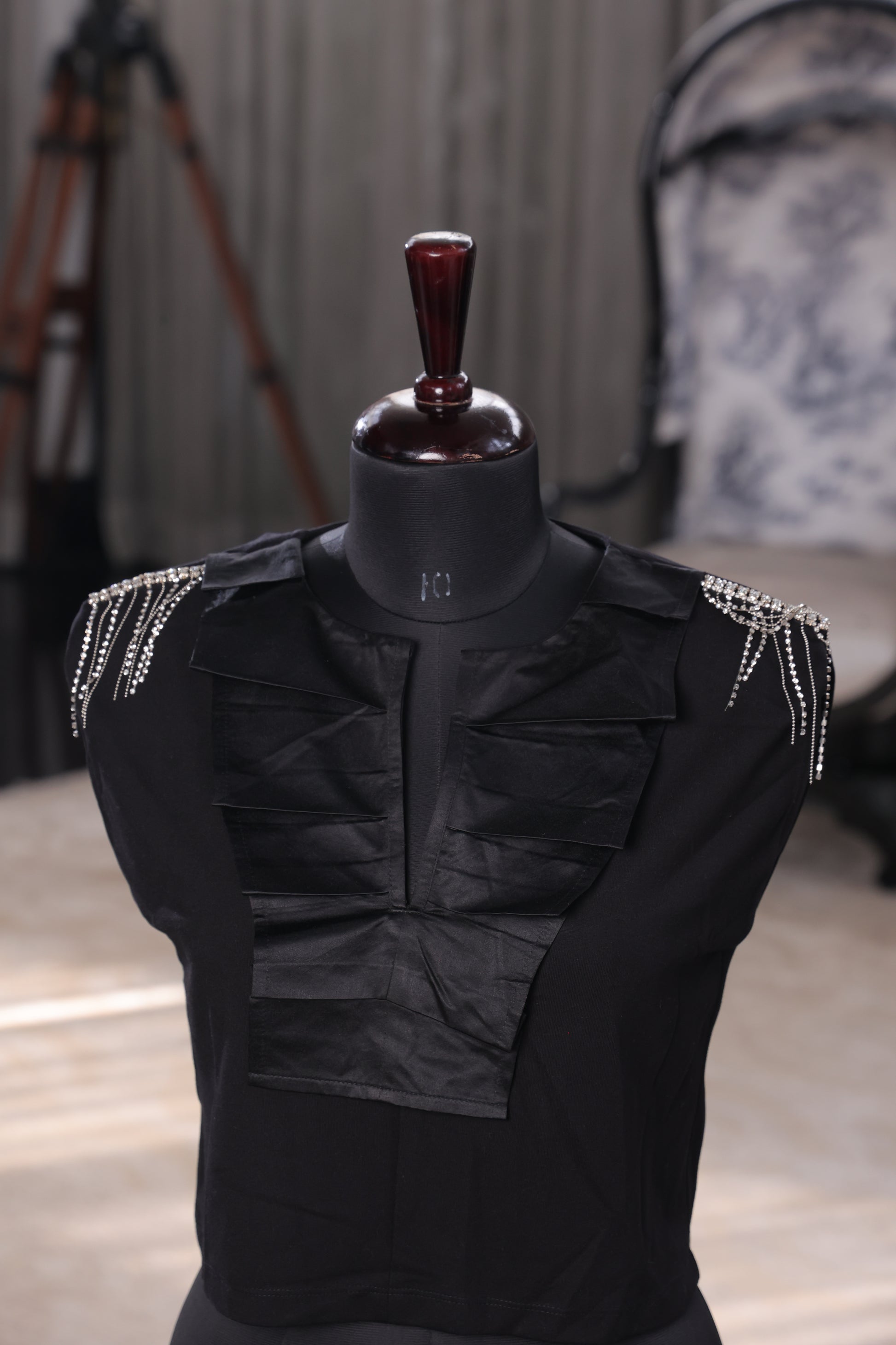 This black sleeveless top features chic ruffles down the front and beaded fringe embellishments on the shoulders, adding a glamorous touch to its bold design.