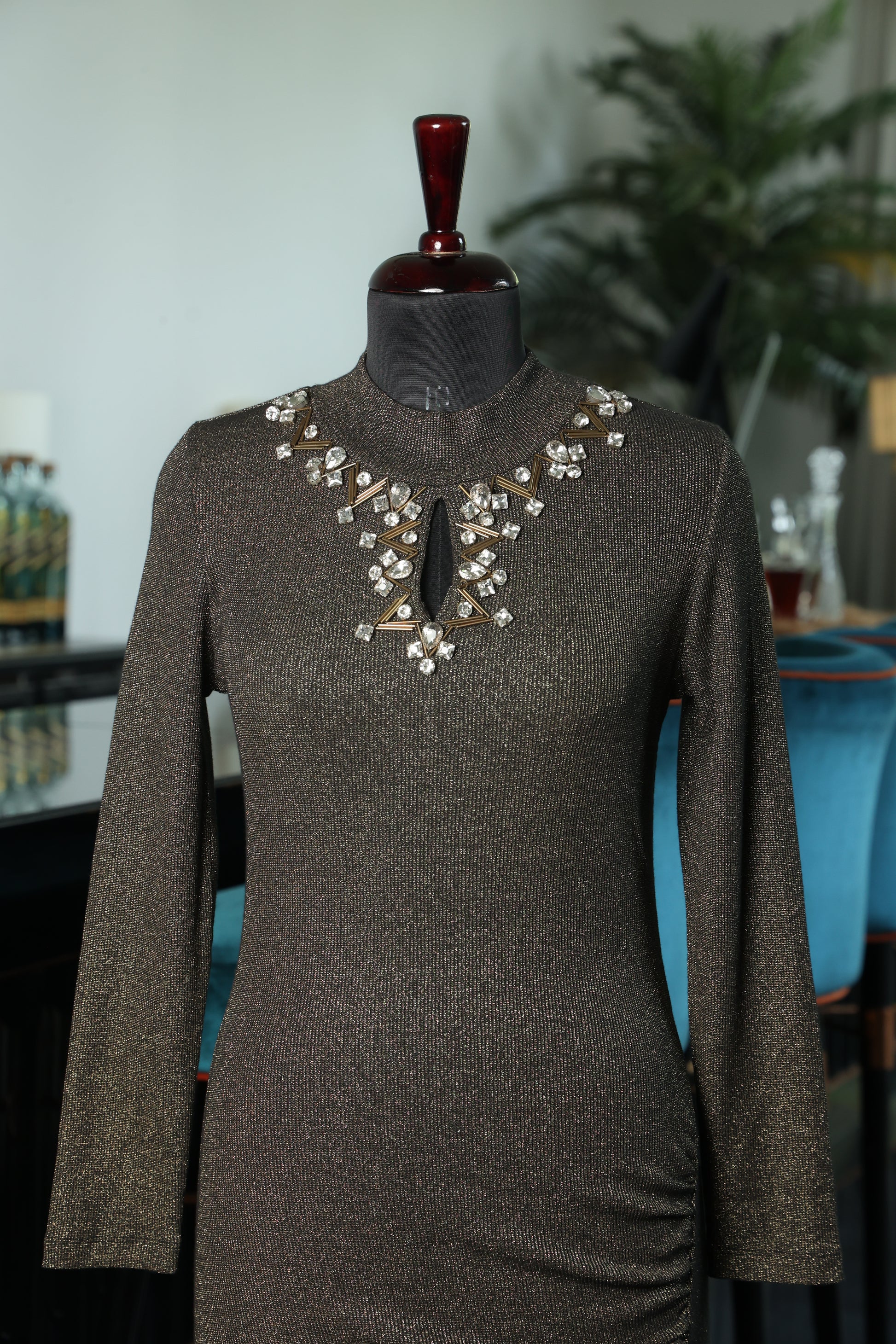Embrace the late night vibes of winter with the embellished slim fit ruched dress, perfect for making a standout statement with elegance.