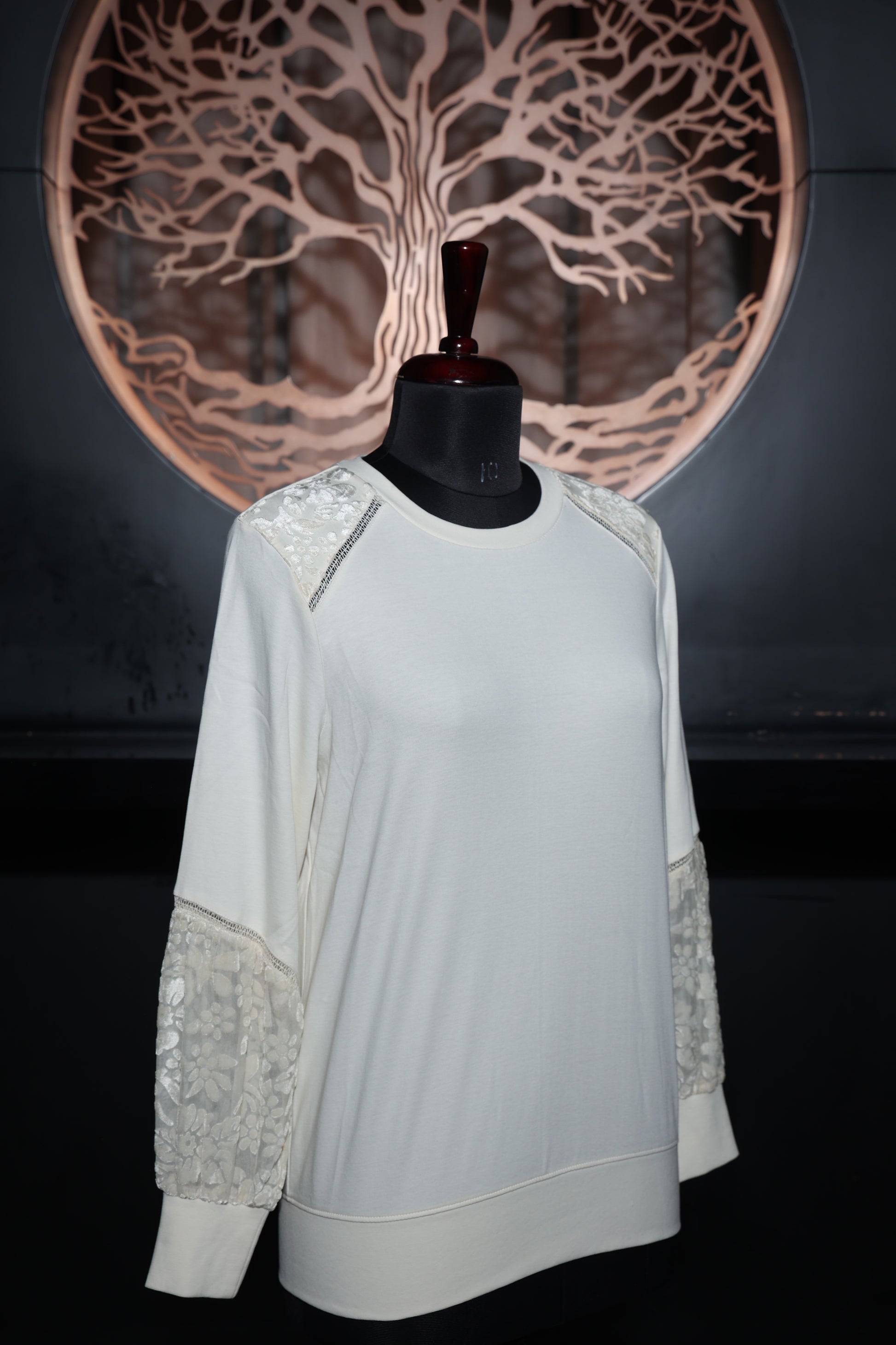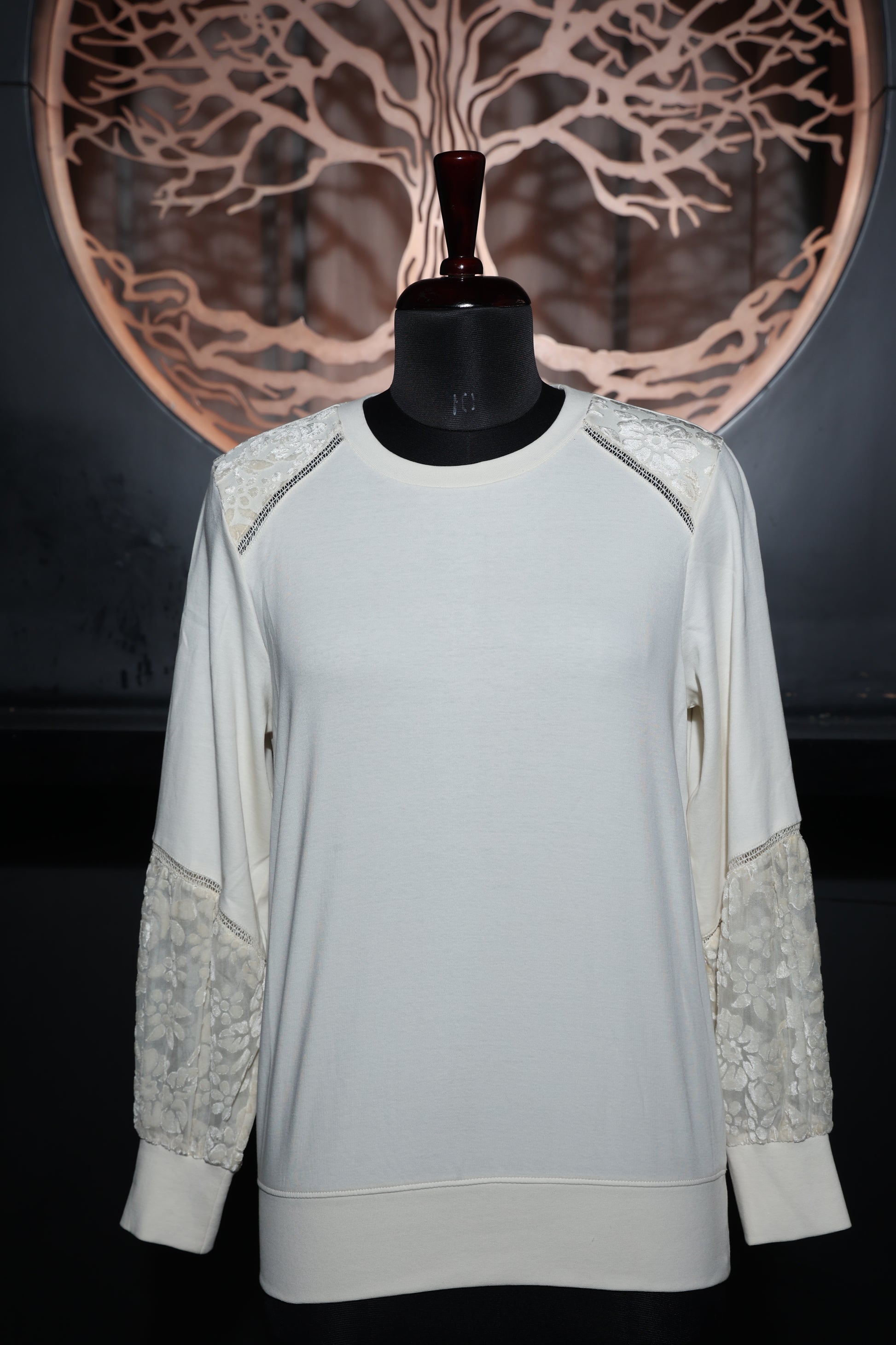This cozy cream sweatshirt is elevated with delicate floral lace detail, featuring a double-layered design for a touch of feminine elegance and texture.