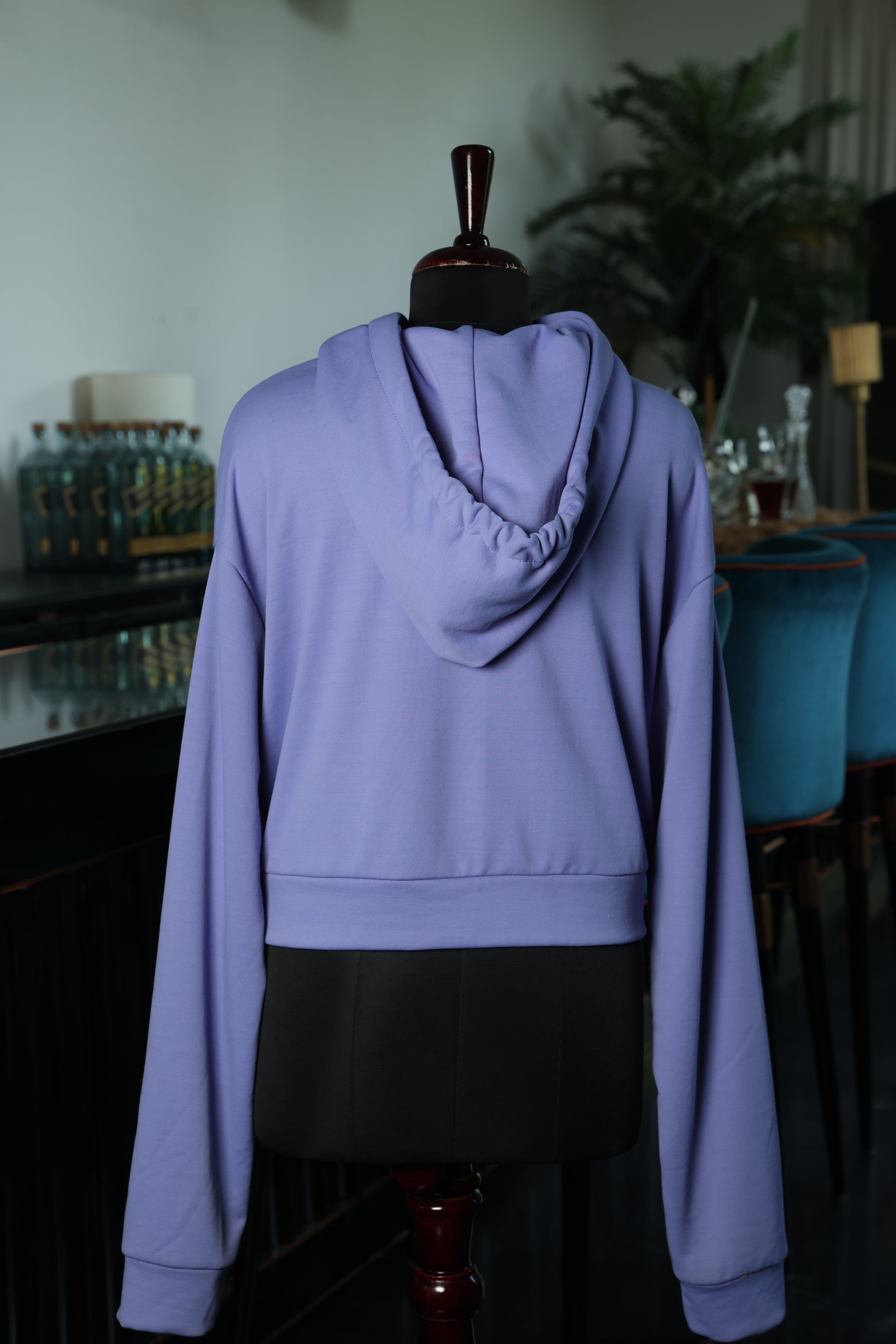 This soft lilac hoodie features a unique draped twist at the waist, combining casual comfort with an elevated, chic style perfect for any relaxed outing.