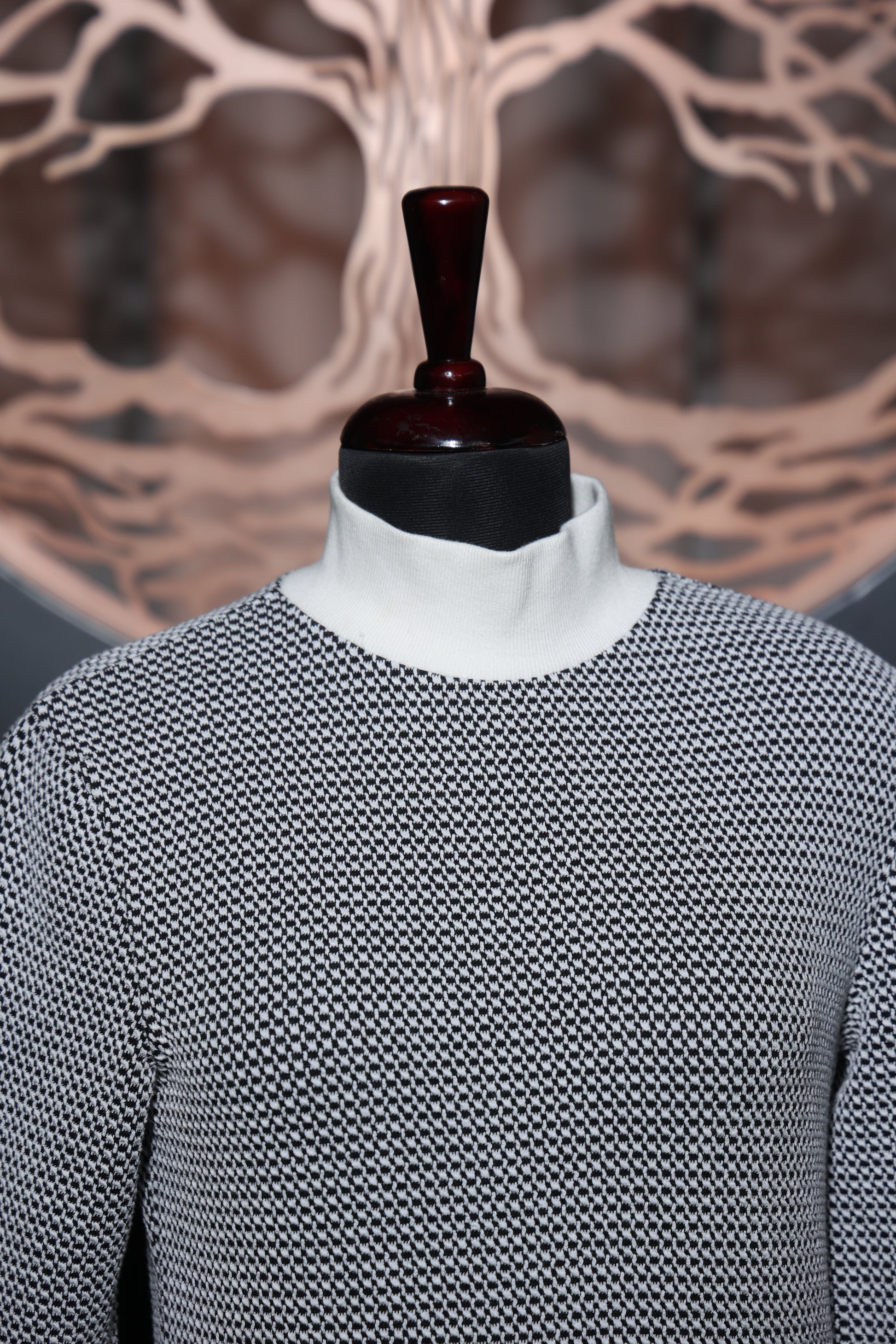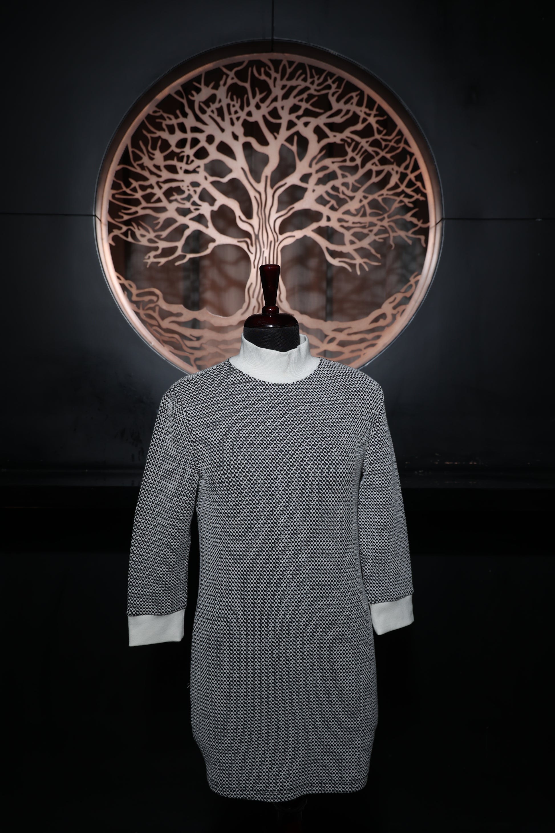 A chic high-neck knit dress with a sleek monochrome pattern, blending sophistication and minimalism.