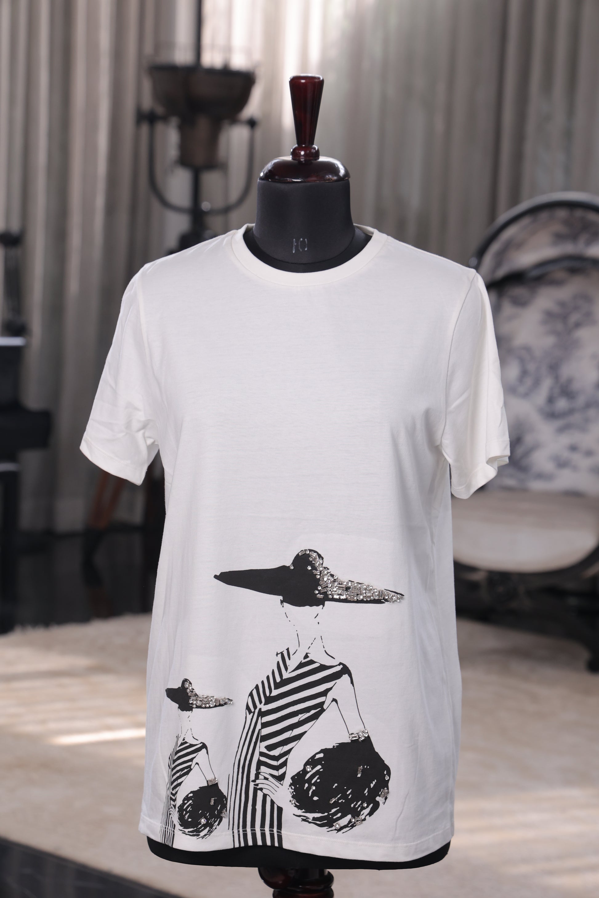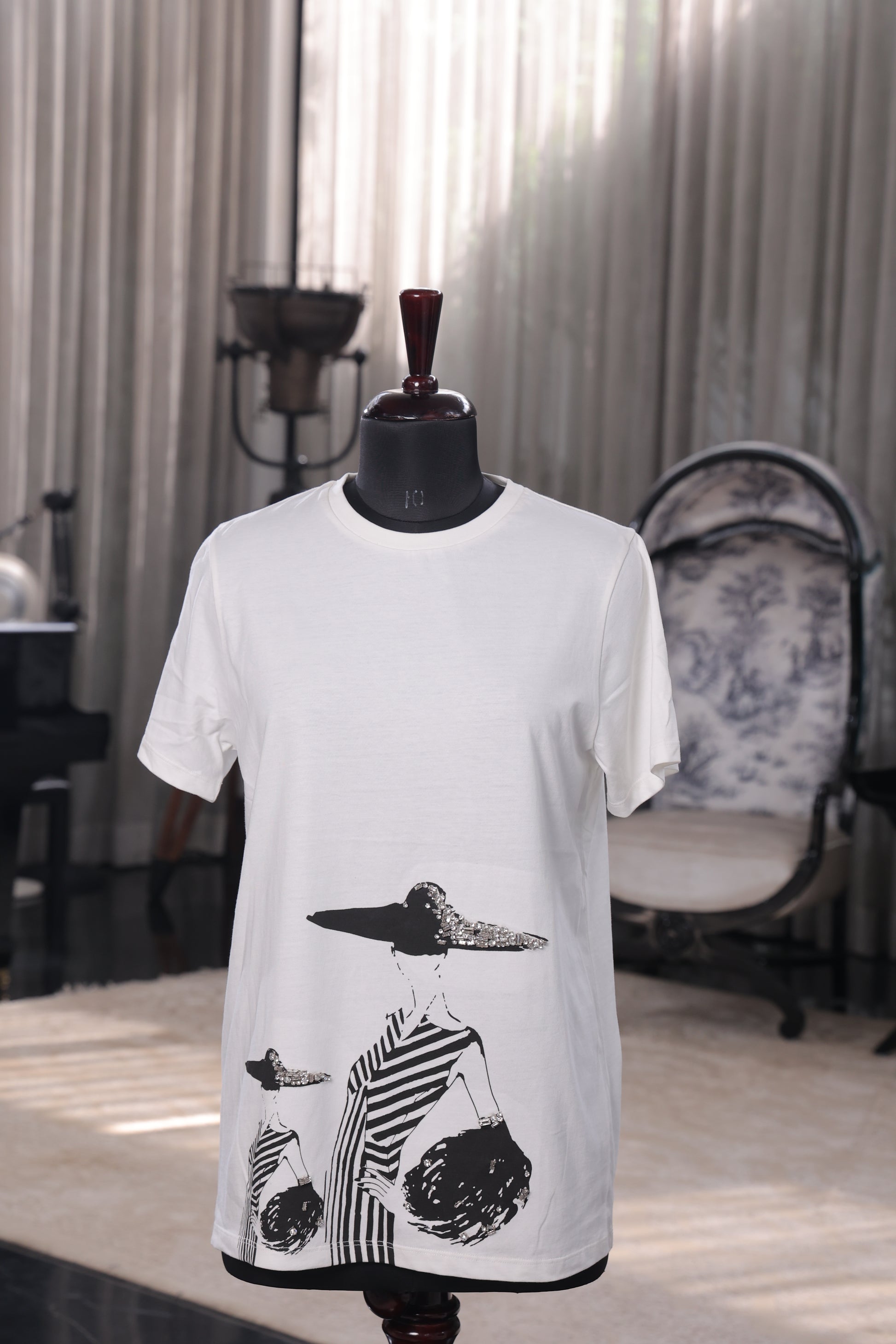 A striking white tee featuring bold black silhouettes of fashionable women in wide-brimmed hats, creating an artistic and chic statement piece.