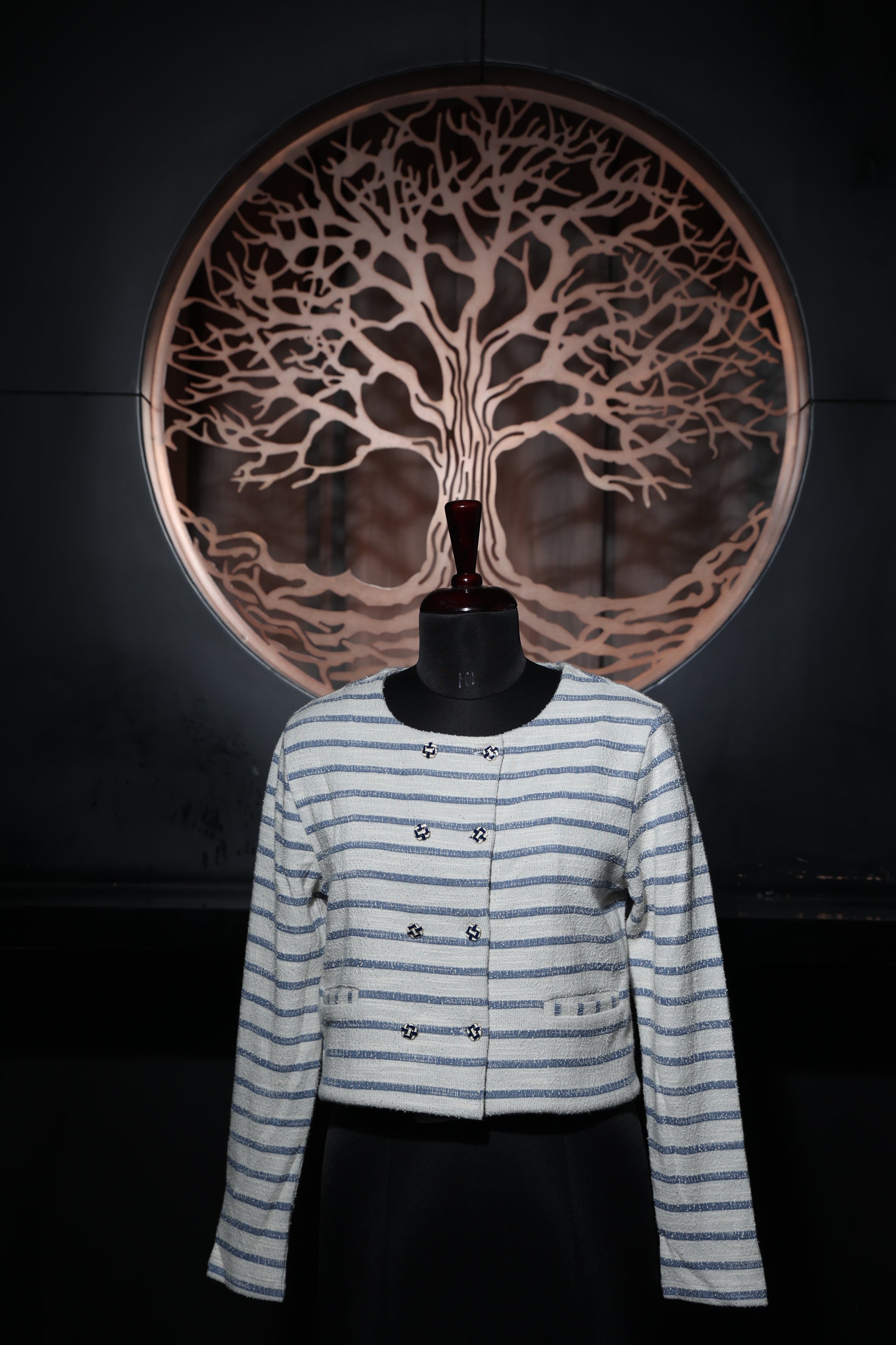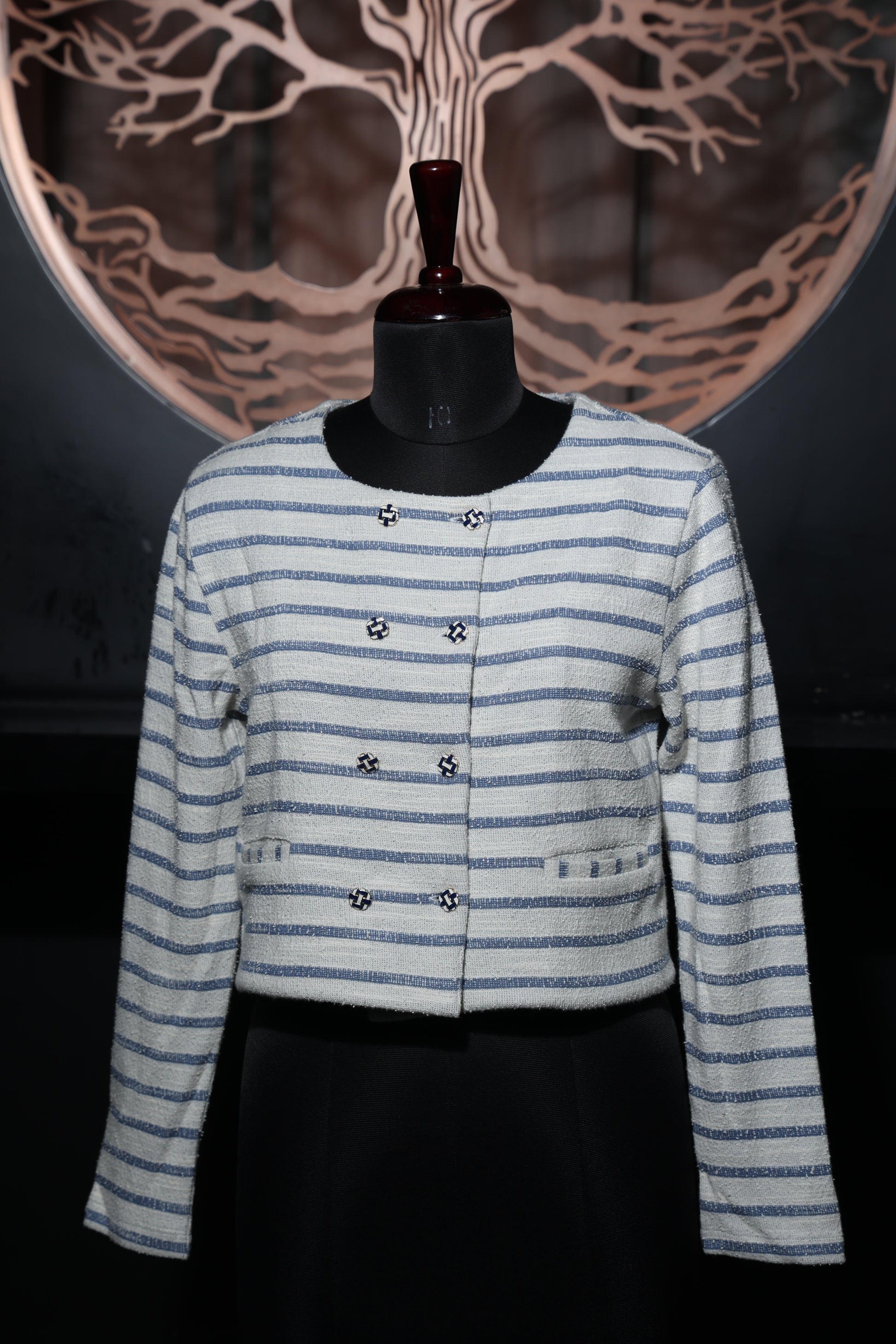 Sail into style with the Nautical Stripes Double-Breasted Top, featuring timeless blue and white stripes with a sophisticated double-breasted button detail.