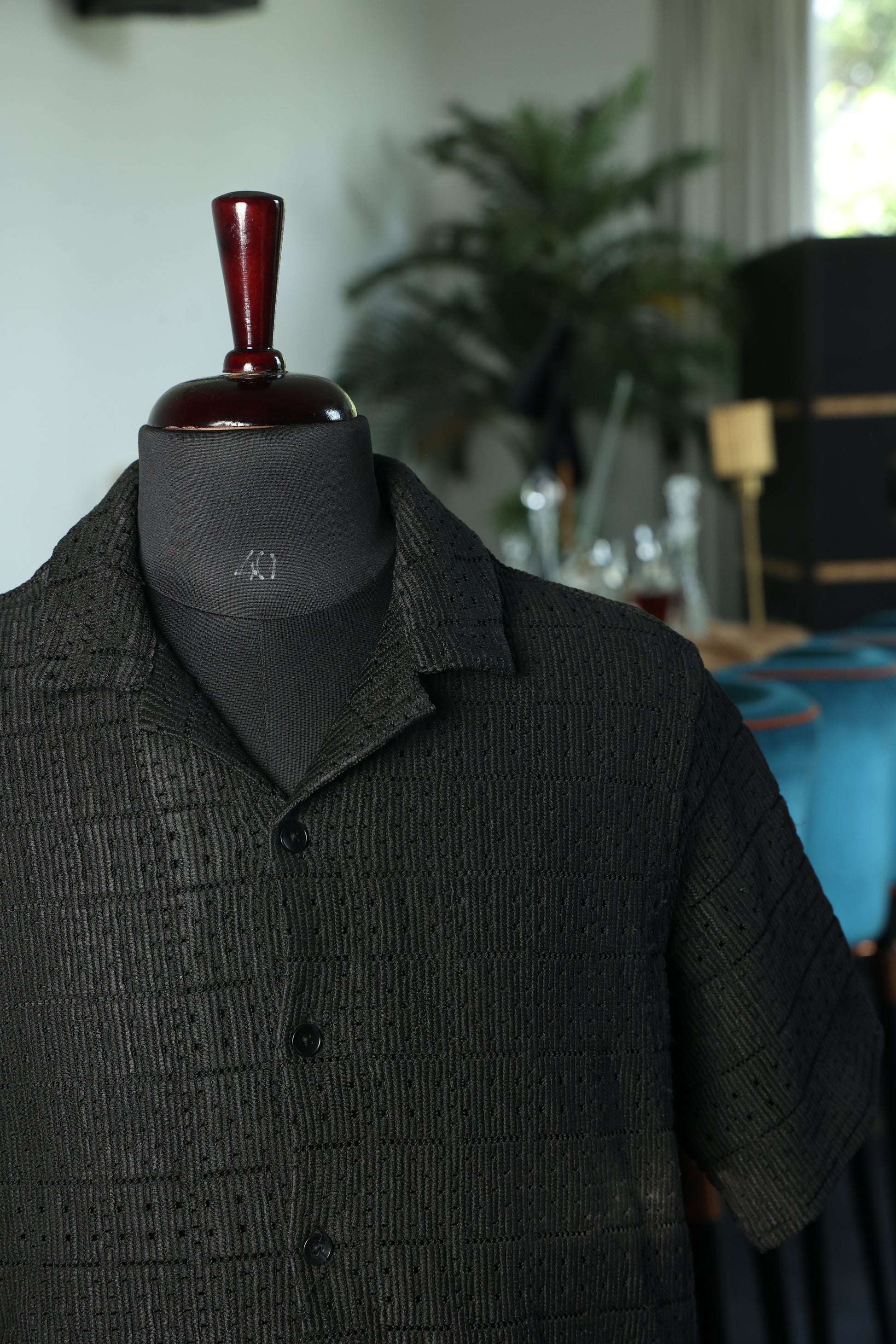 A short-sleeved, button-up shirt featuring a subtle textured pattern, offering a refined, casual look with a touch of elegance. Perfect for warm days and easy-going outings.