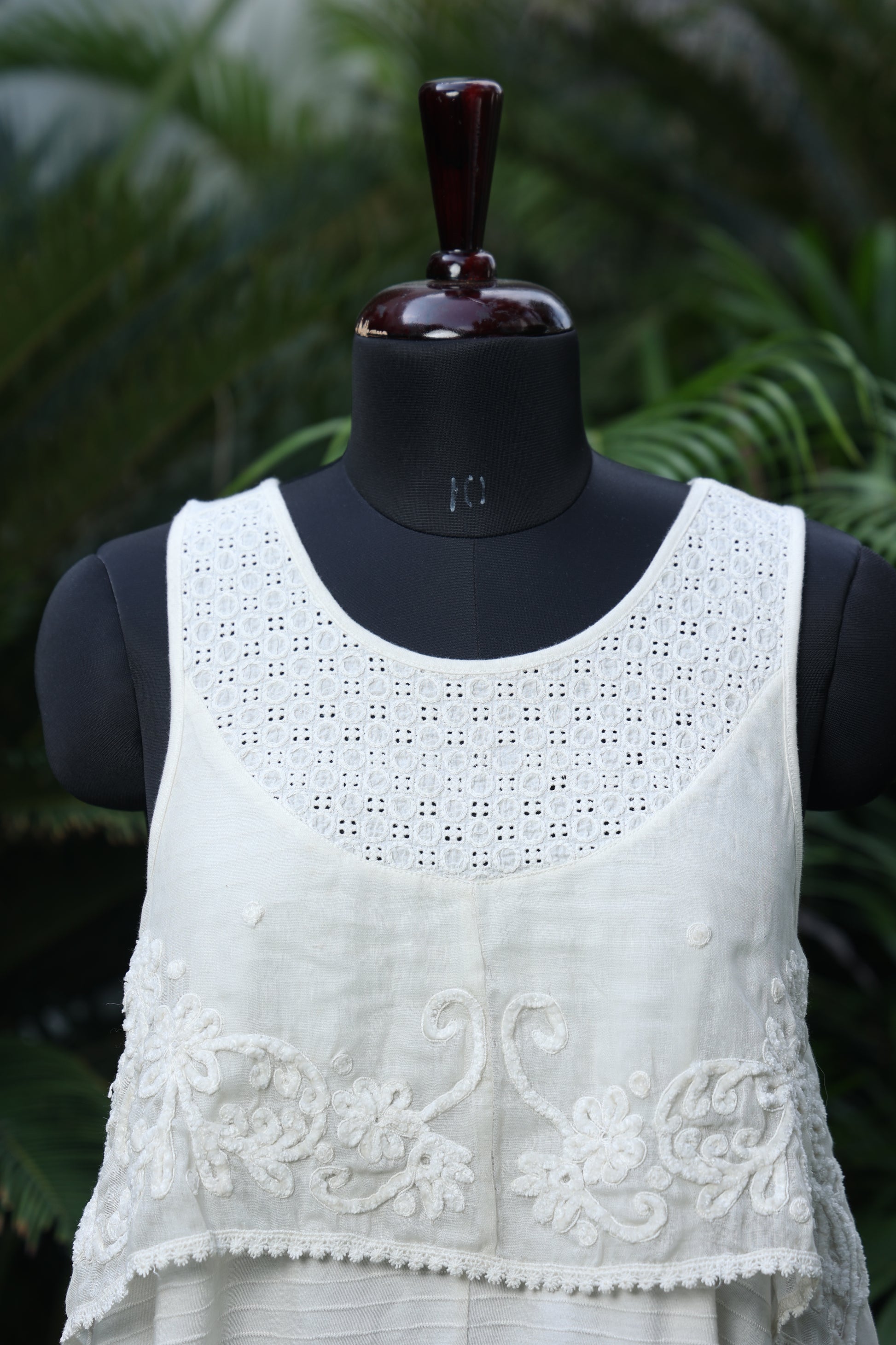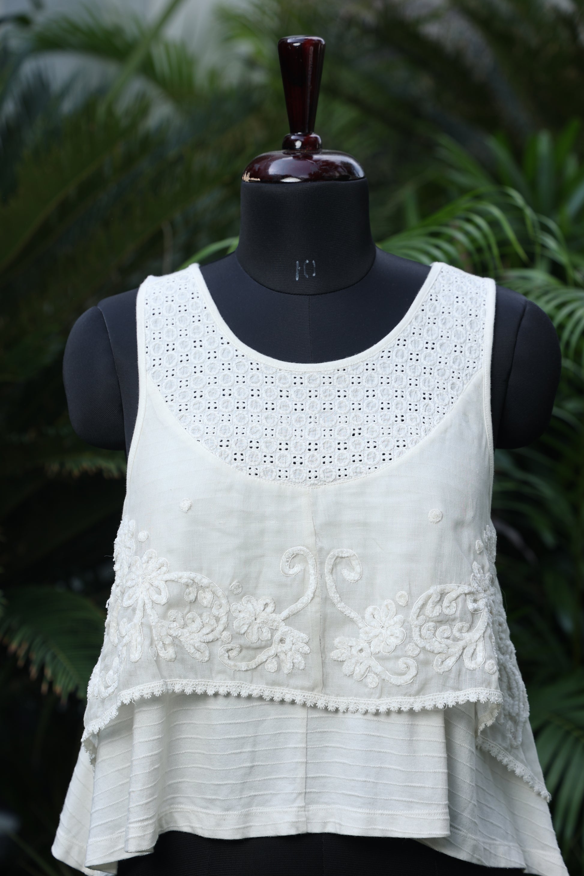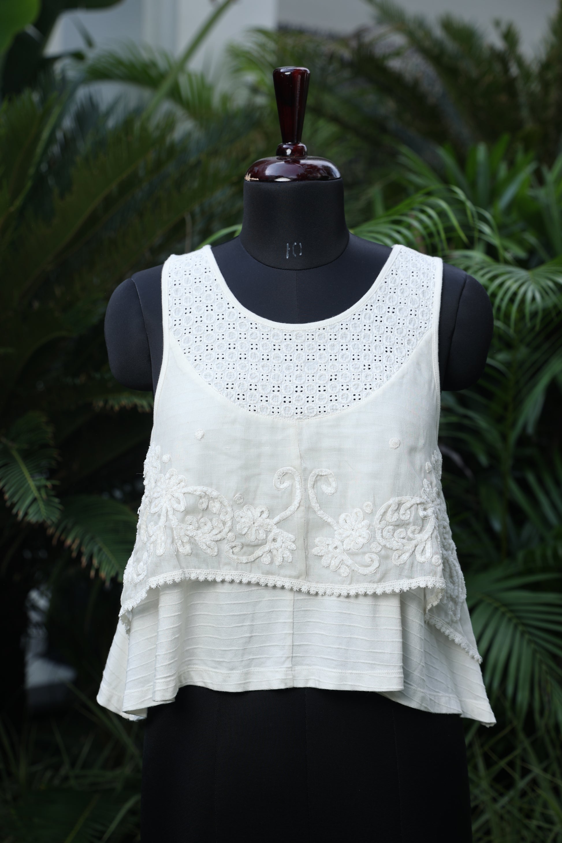 A beautifully detailed white top featuring intricate schiffli embroidery, blending classic elegance with a modern twist for effortless styling.