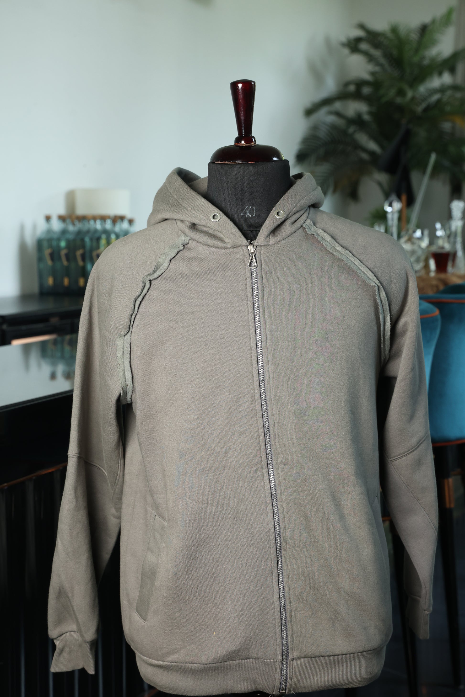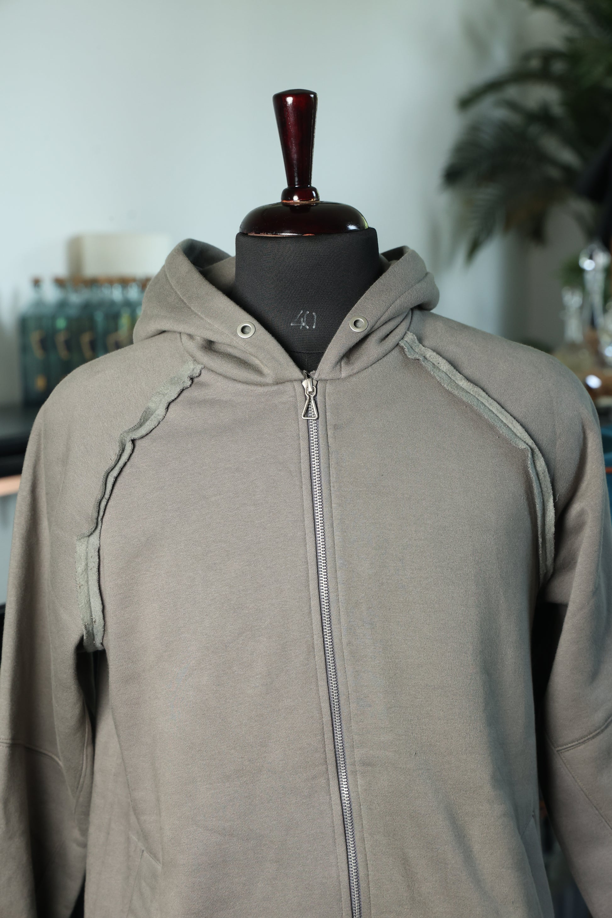 A minimalist full-zip hoodie featuring raw-edge seam detailing, relaxed fit, and functional front pockets for everyday comfort and style.