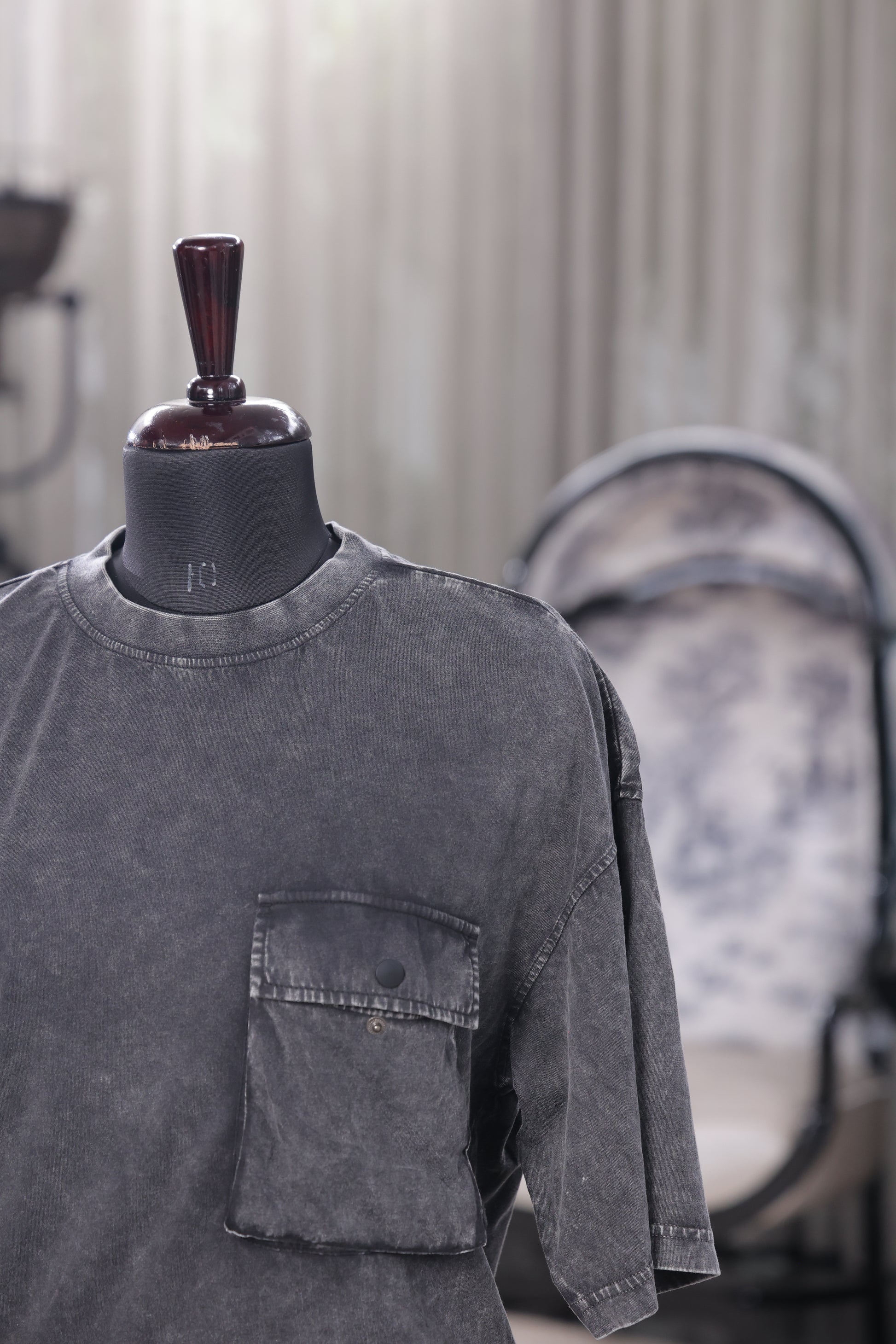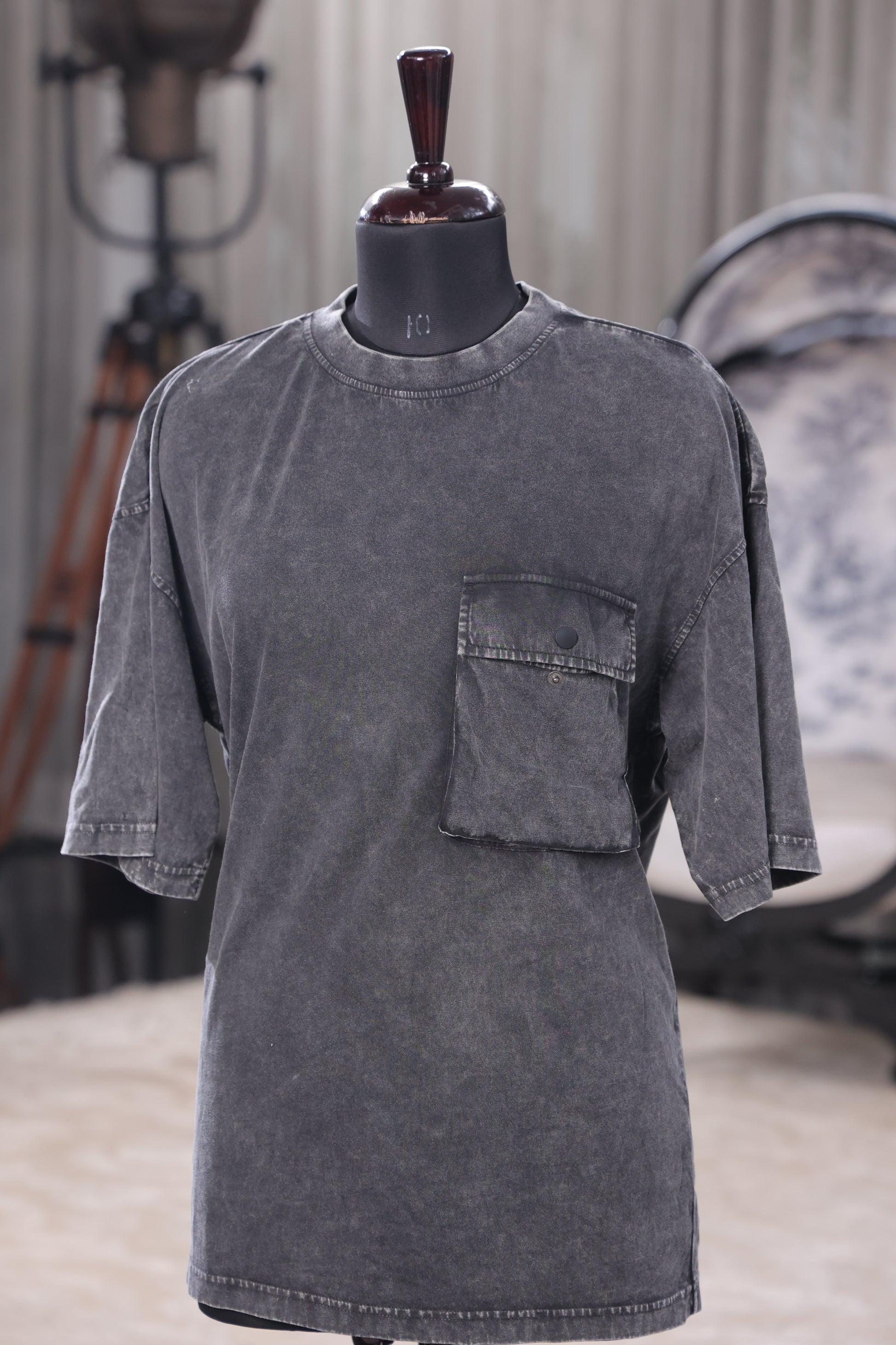 This washed-out black tee combines a rugged, vintage vibe with a large utility pocket for an effortlessly cool look.
