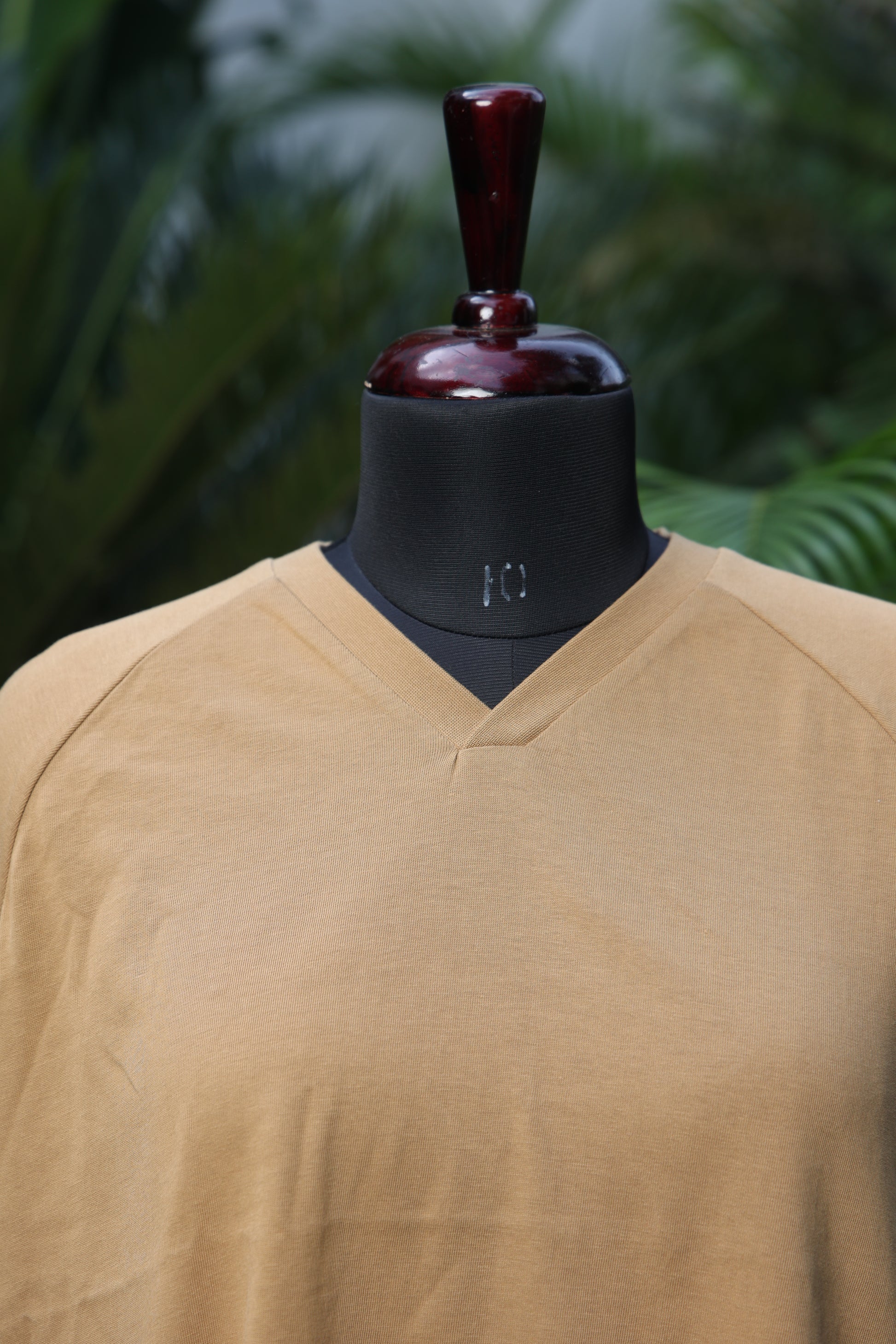 This relaxed-fit tee in a warm desert sand tone features a flattering V-neckline and soft fabric for all-day comfort.