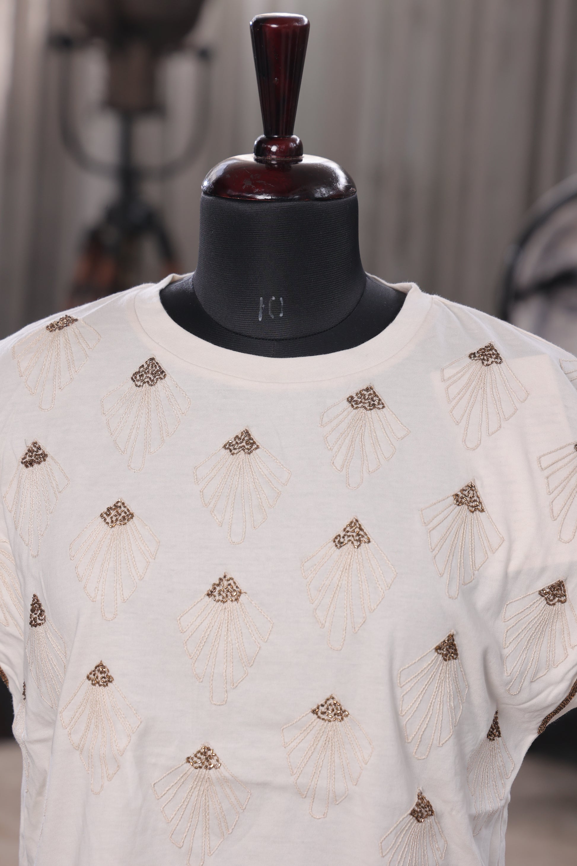 A chic beige top adorned with sparkling stone embellishments, adding a subtle shimmer for a touch of understated elegance and sophistication.