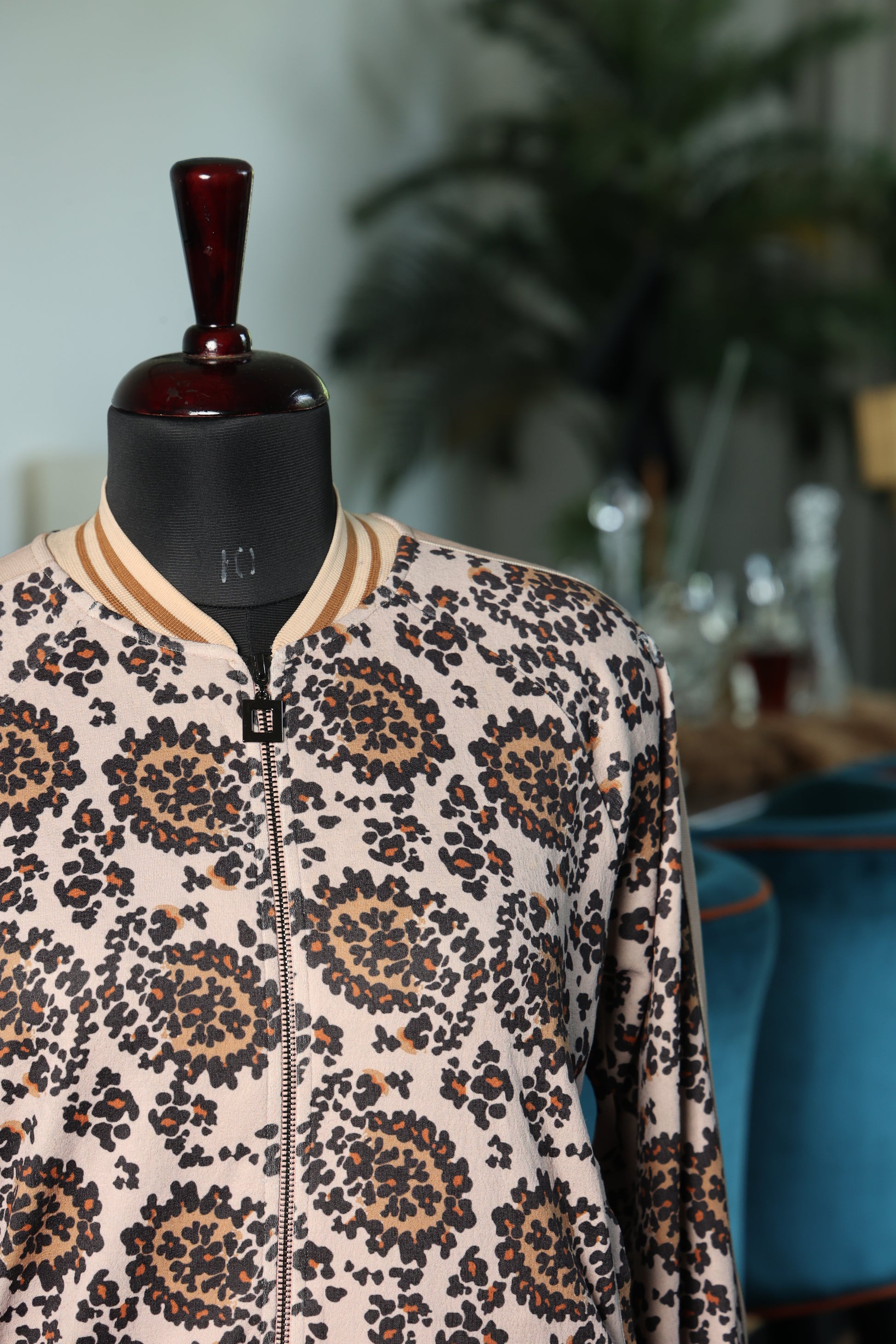 This jacket has a bold, retro charm with its floral-inspired animal print design. The contrasting beige ribbed trim on the collar, cuffs, and hem adds a classic touch, while the zip-up front keeps it casual yet polished. Perfect for layering, this piece effortlessly blends playful patterns with a sophisticated silhouette, making it a versatile addition to any wardrobe.