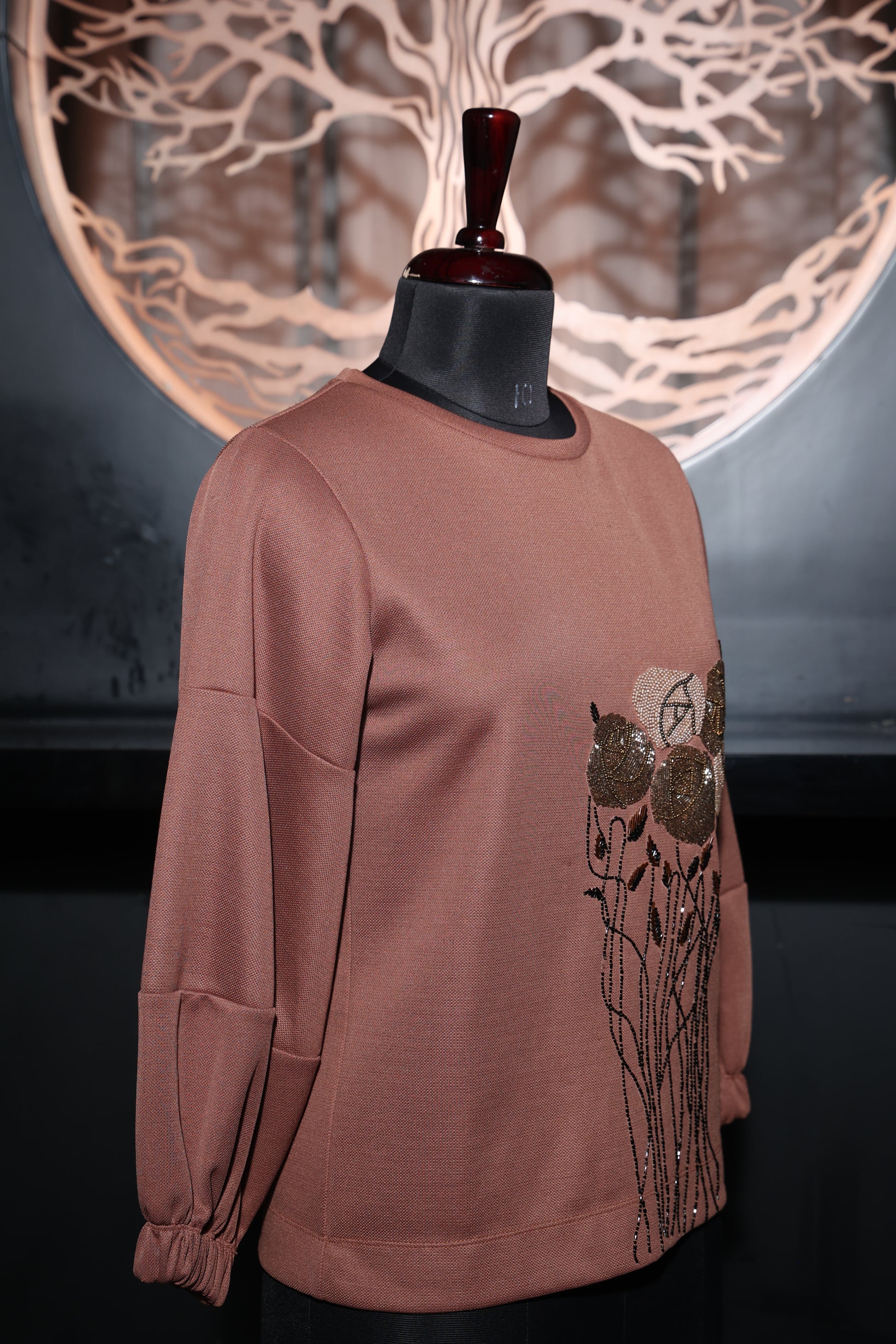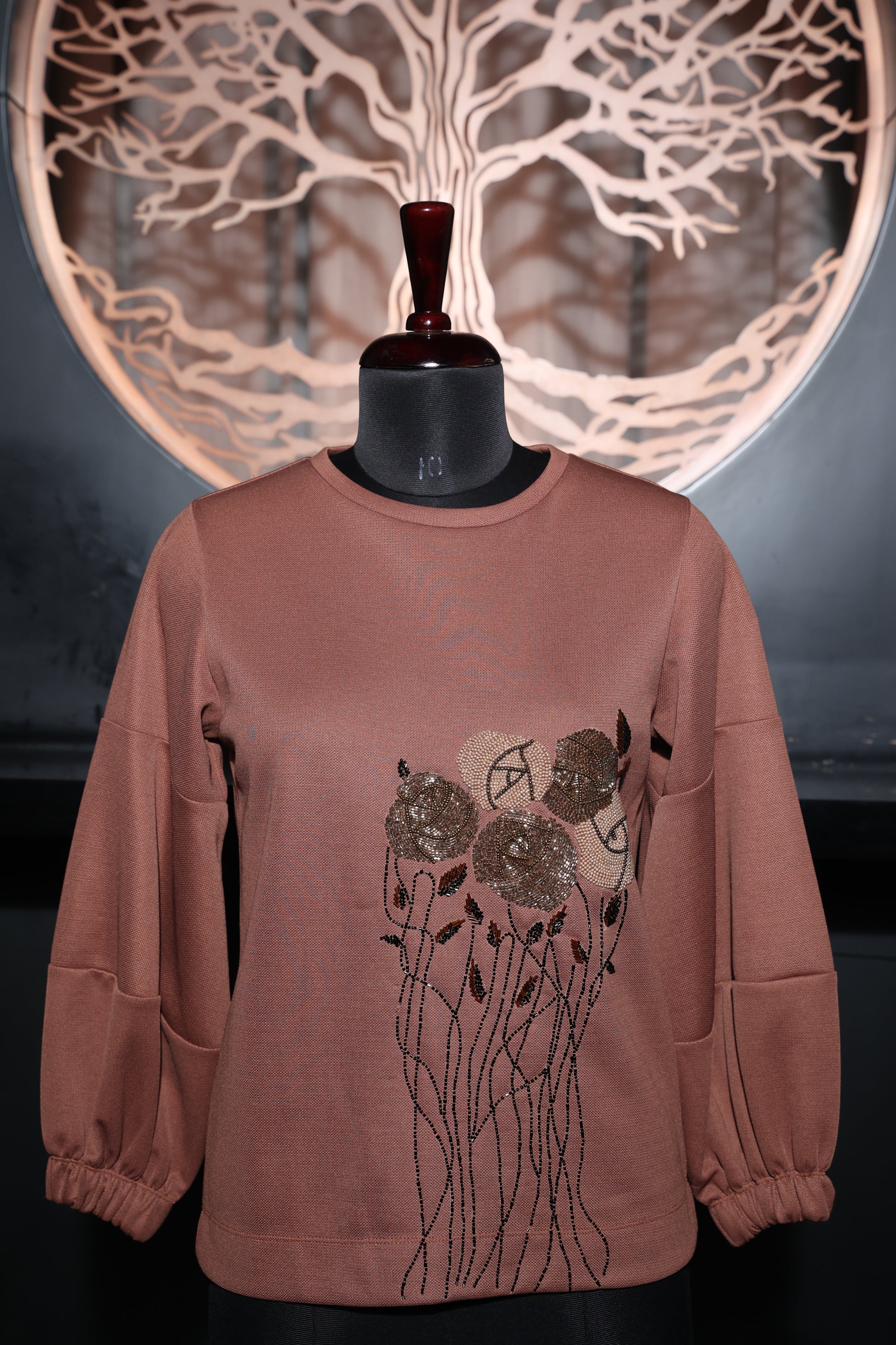A chic, cozy sweatshirt with stunning floral embellishments, perfect for adding a touch of elegance to your casual wardrobe.