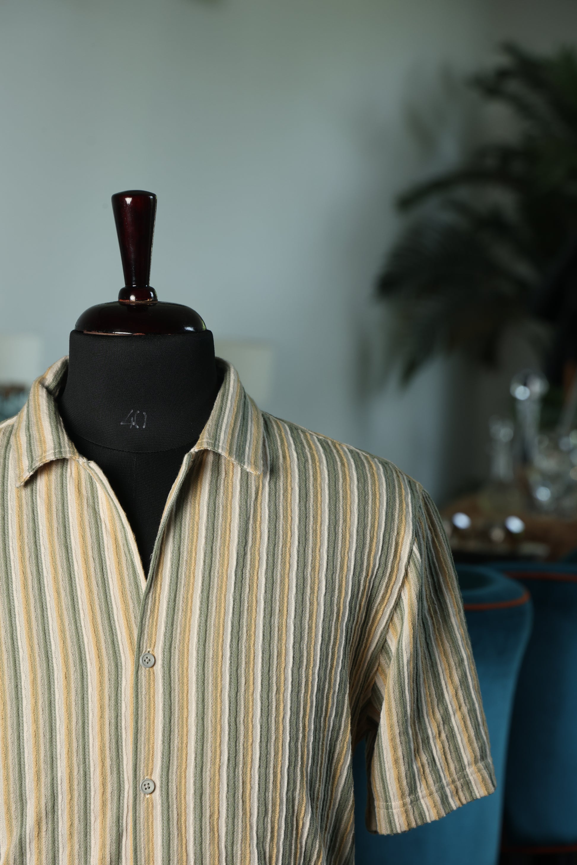 Brighten your wardrobe with this yellow stripe shirt, offering a vibrant design and relaxed fit perfect for casual outings or sunny days.