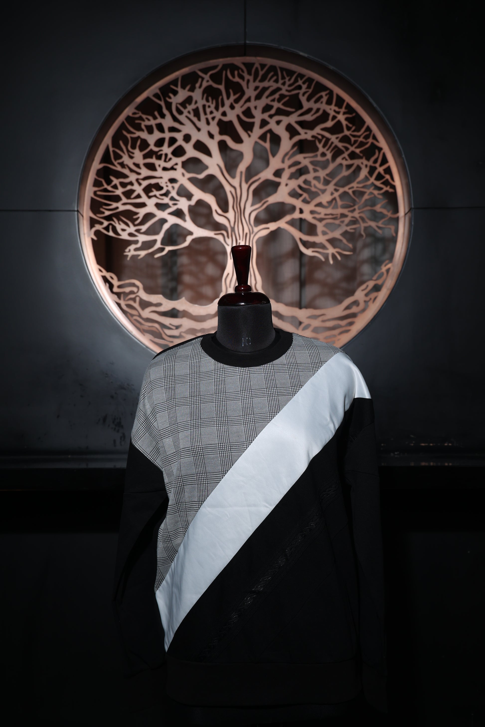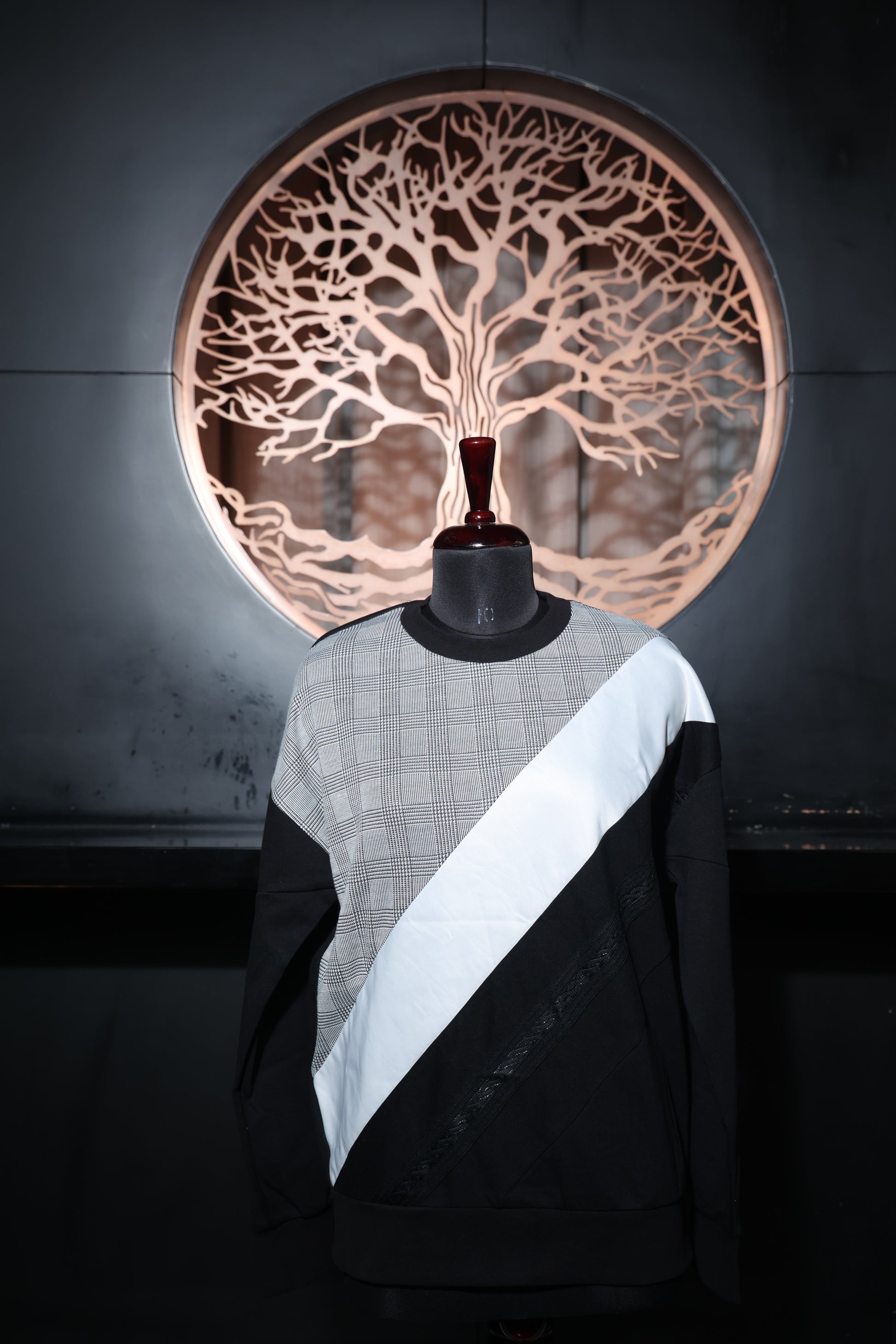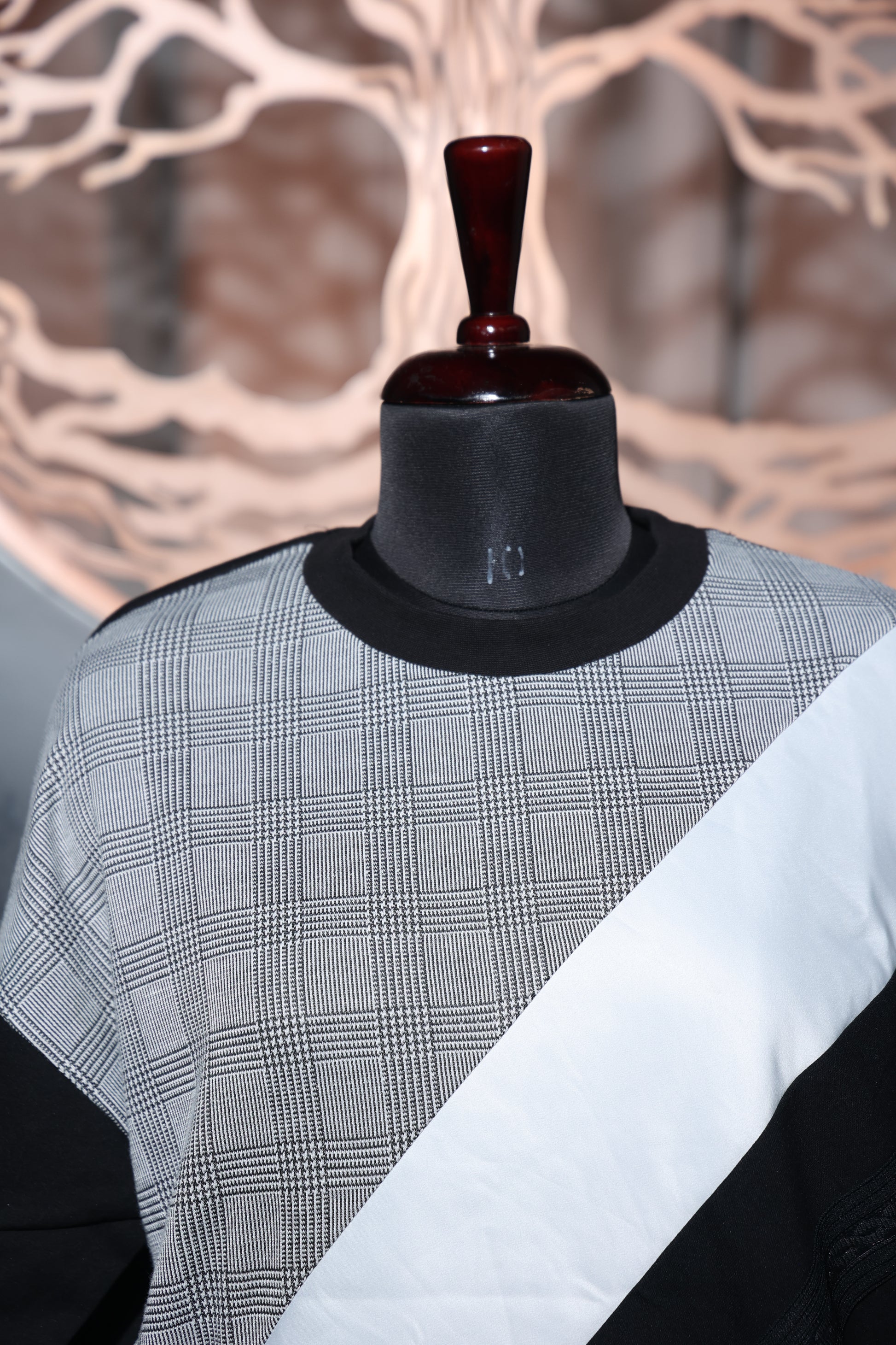 A contemporary black sweatshirt with a striking diagonal check design, offering a modern twist on classic style.