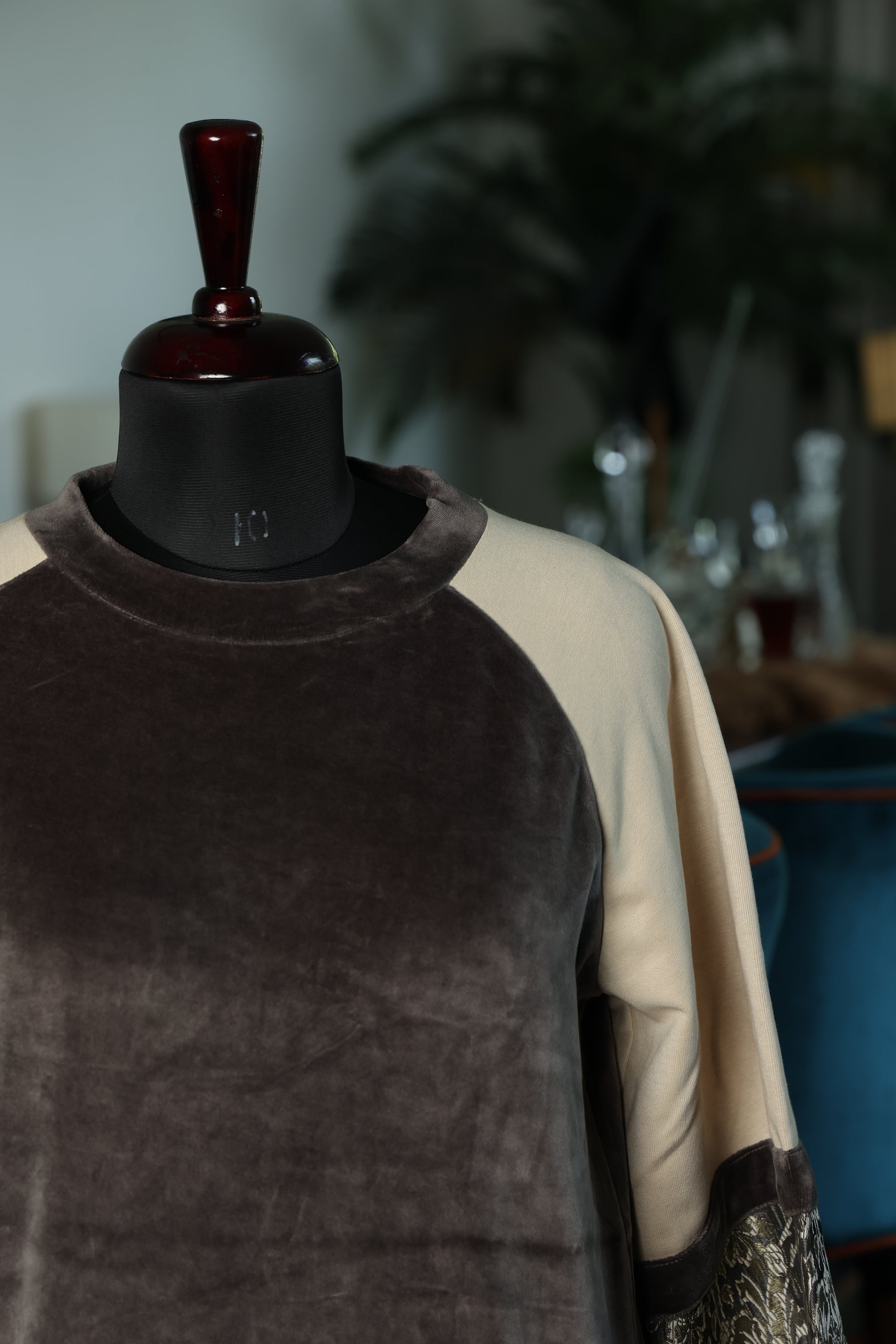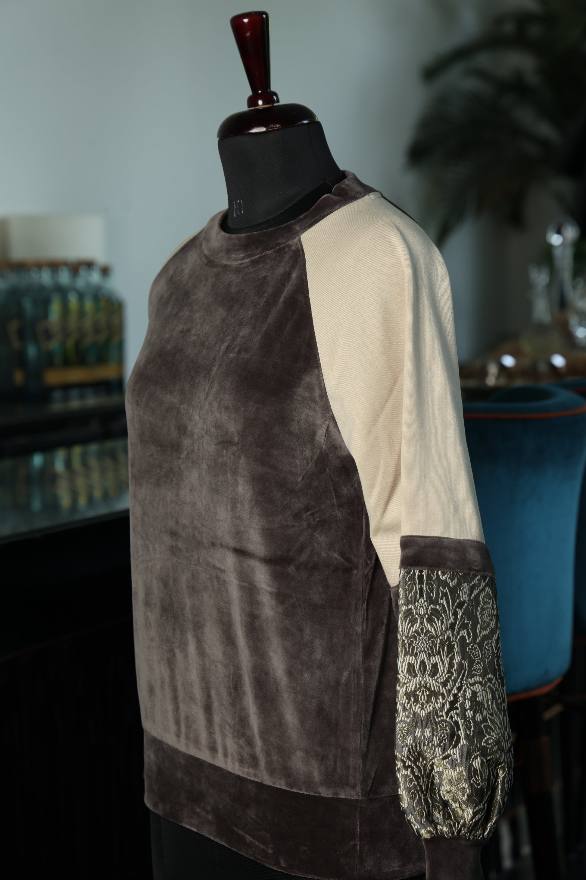 This luxurious top seamlessly blends comfort and elegance, featuring a rich velvet bodice complemented by contrasting color-blocked sleeves. The intricate lace detailing on the sleeves adds a touch of sophistication, making it perfect for both casual outings and chic evening gatherings.