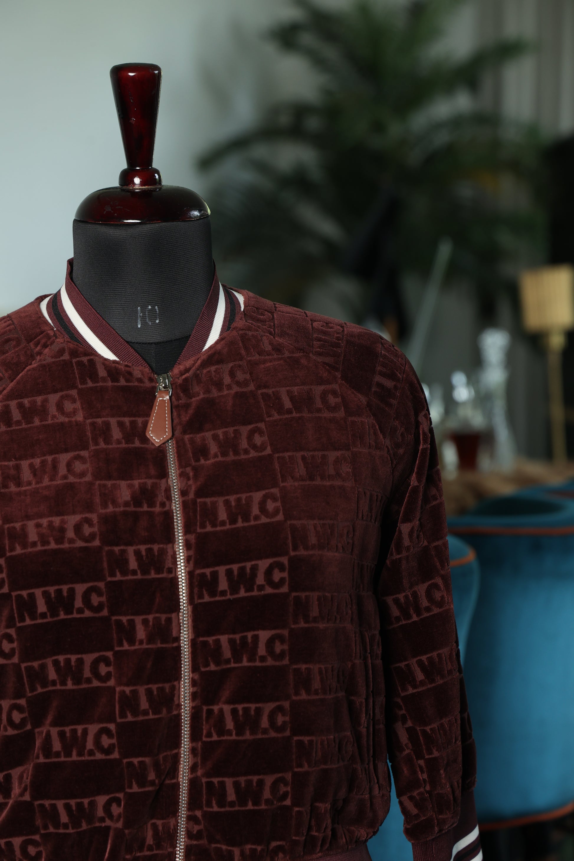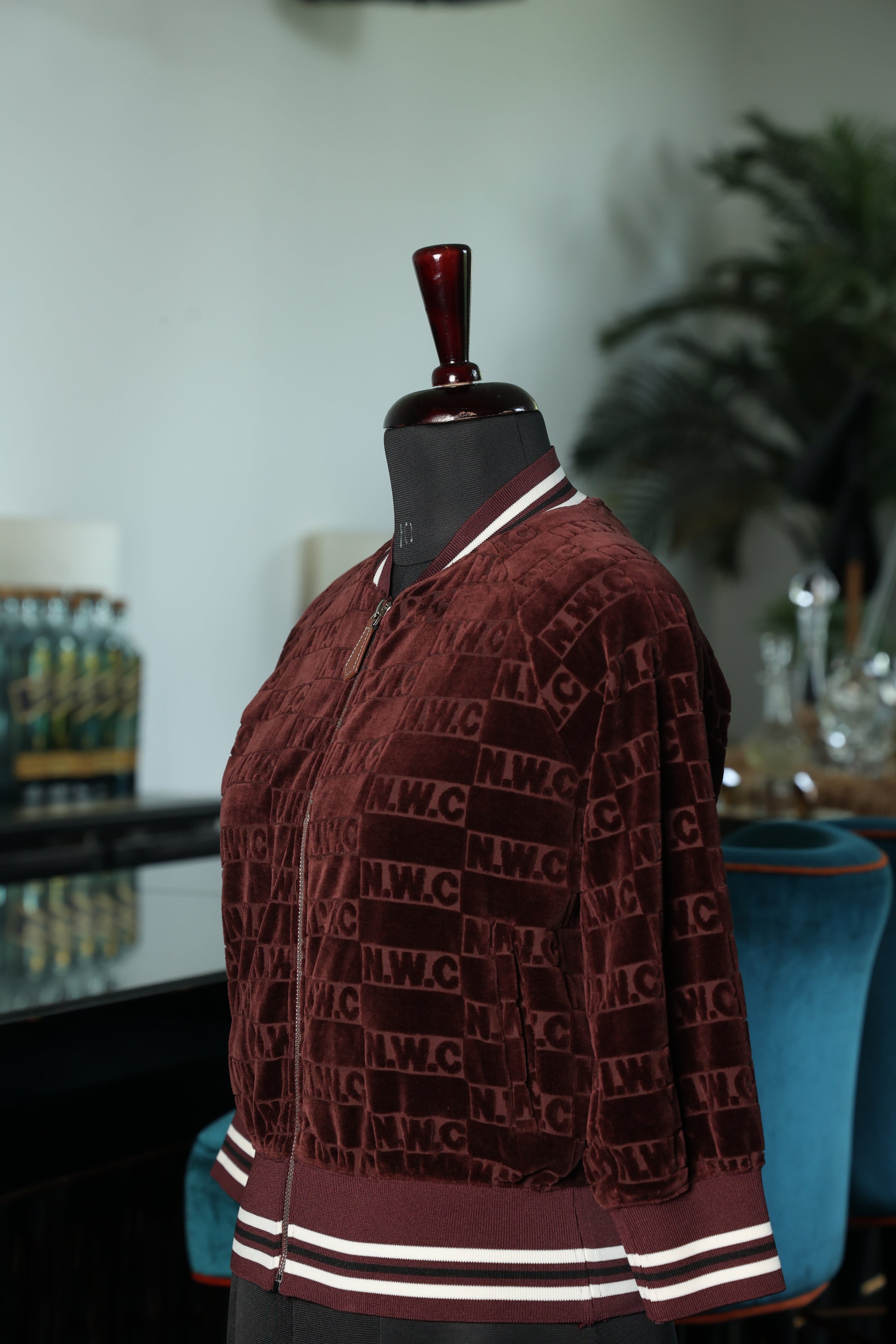 This jacket boasts a rich burgundy hue with a textured N.W.C logo pattern. Its plush velvet finish adds a layer of luxurious appeal, while the contrasting striped ribbed cuffs and hem provide a sporty touch. The zip-front closure gives it a casual yet refined style, perfect for those who want a balance of elegance and comfort. The jacket combines vintage charm with a modern twist, making it a versatile piece for any wardrobe.