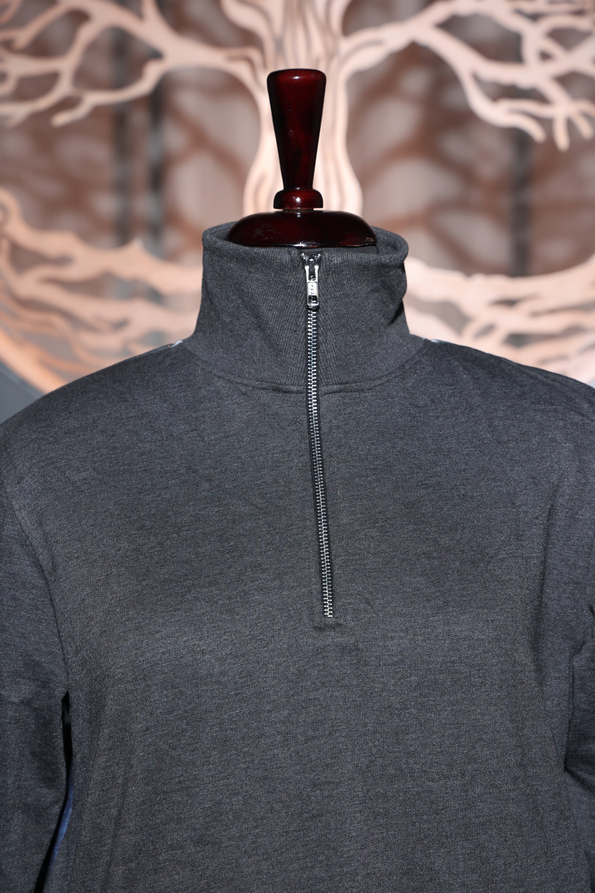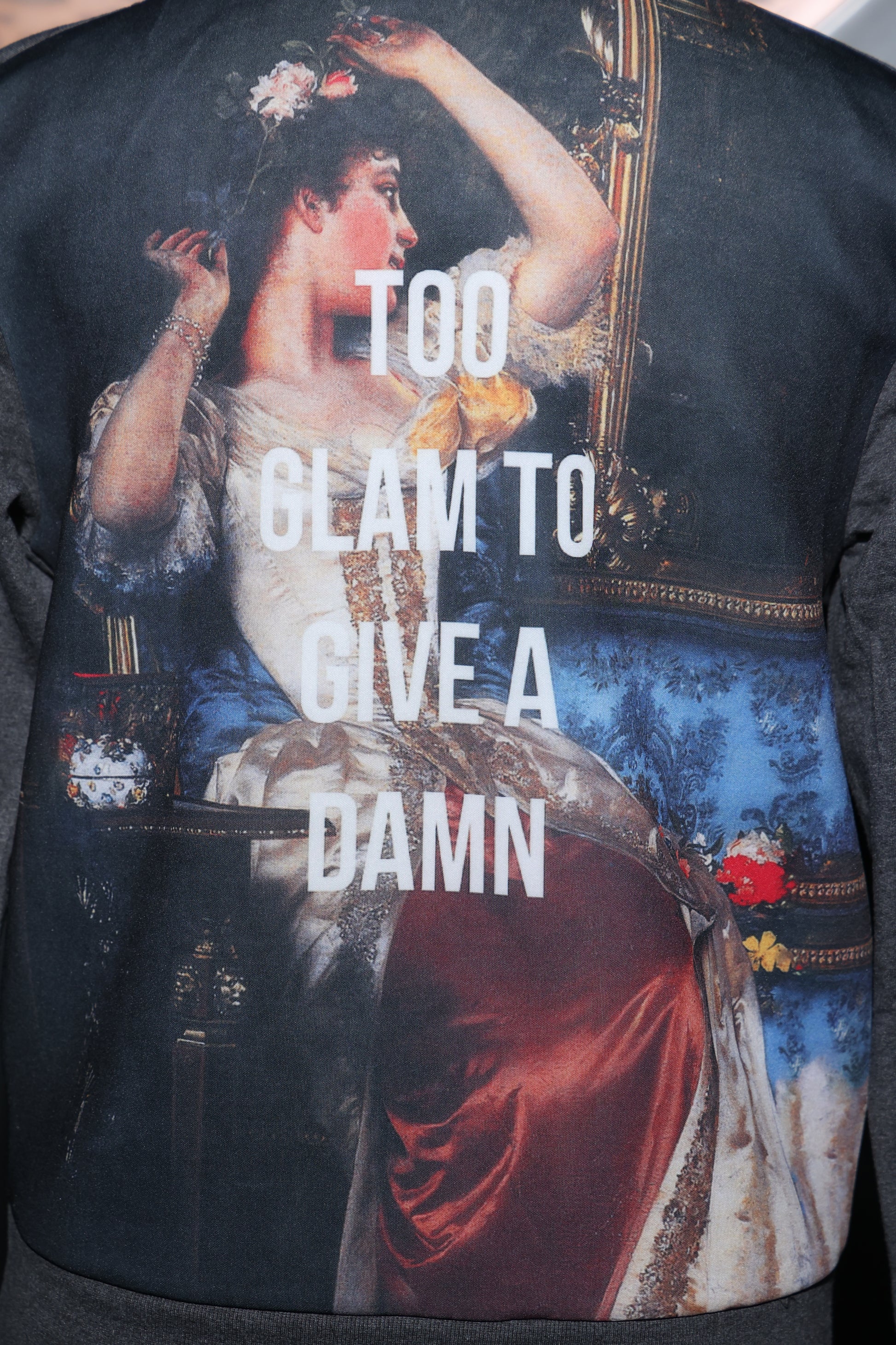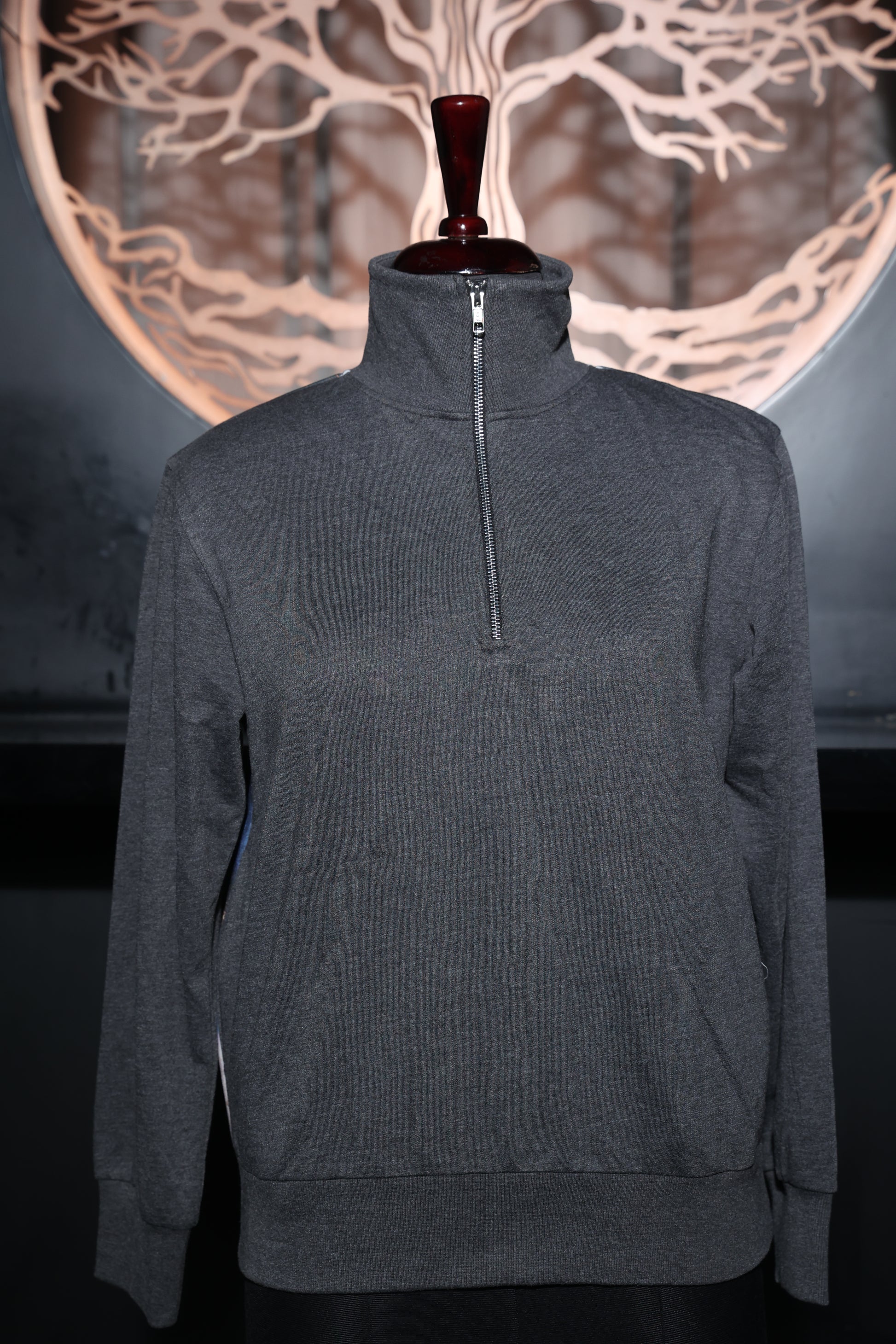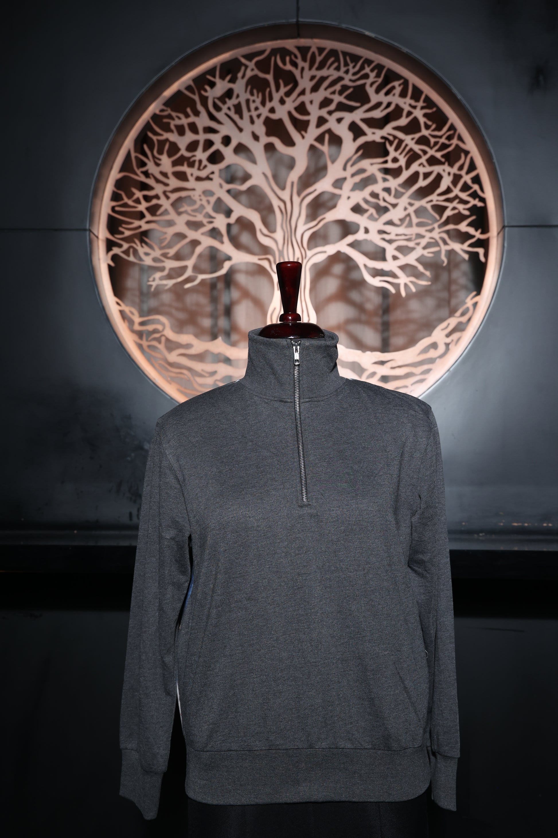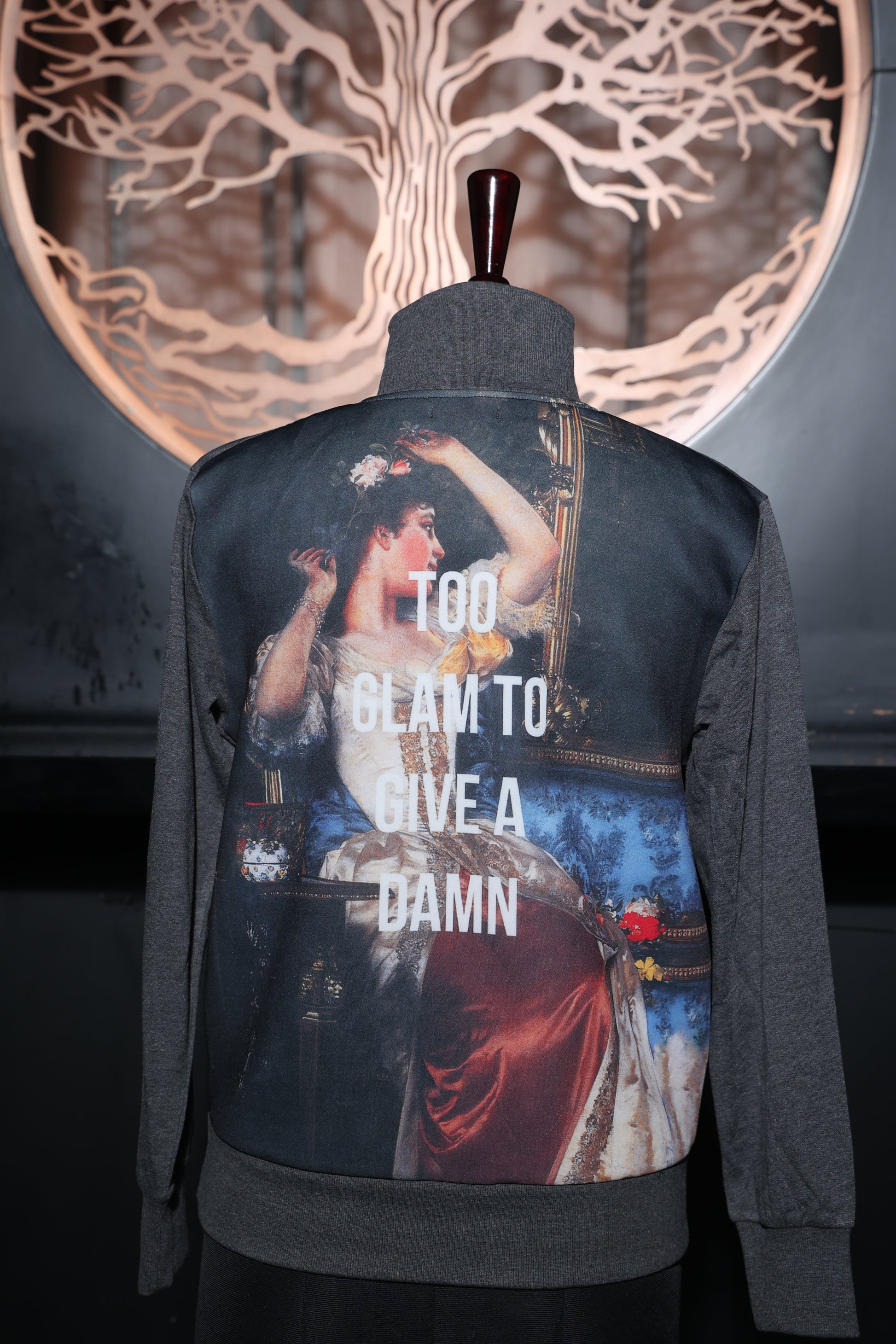 A sleek grey pullover with a bold artistic statement on the back, showcasing a striking art print.