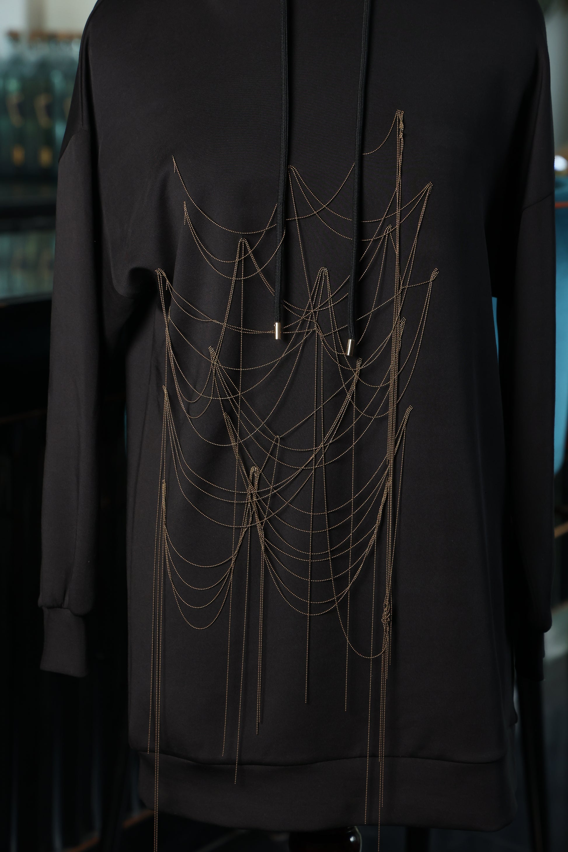 This edgy black hoodie features intricate threadwork forming a mesmerizing spider web design across the front, adding a bold, gothic touch to your wardrobe, perfect for anyone looking to embrace a dark, mysterious vibe. Comfortable yet striking, this hoodie is ideal for making a statement while staying cozy.
