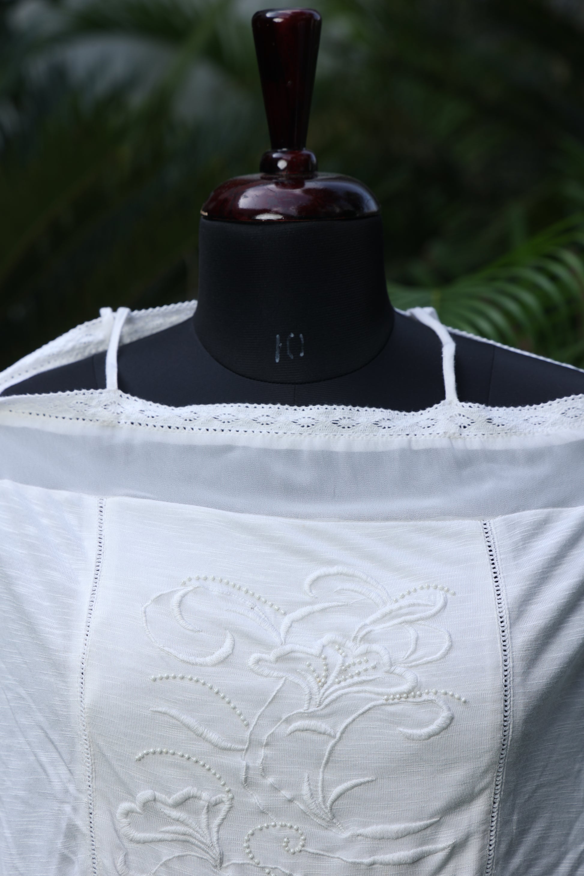 This delicate white crop top features intricate floral embroidery on the front and a lightweight, flowing silhouette with off-the-shoulder detailing, creating an effortlessly breezy and feminine look.