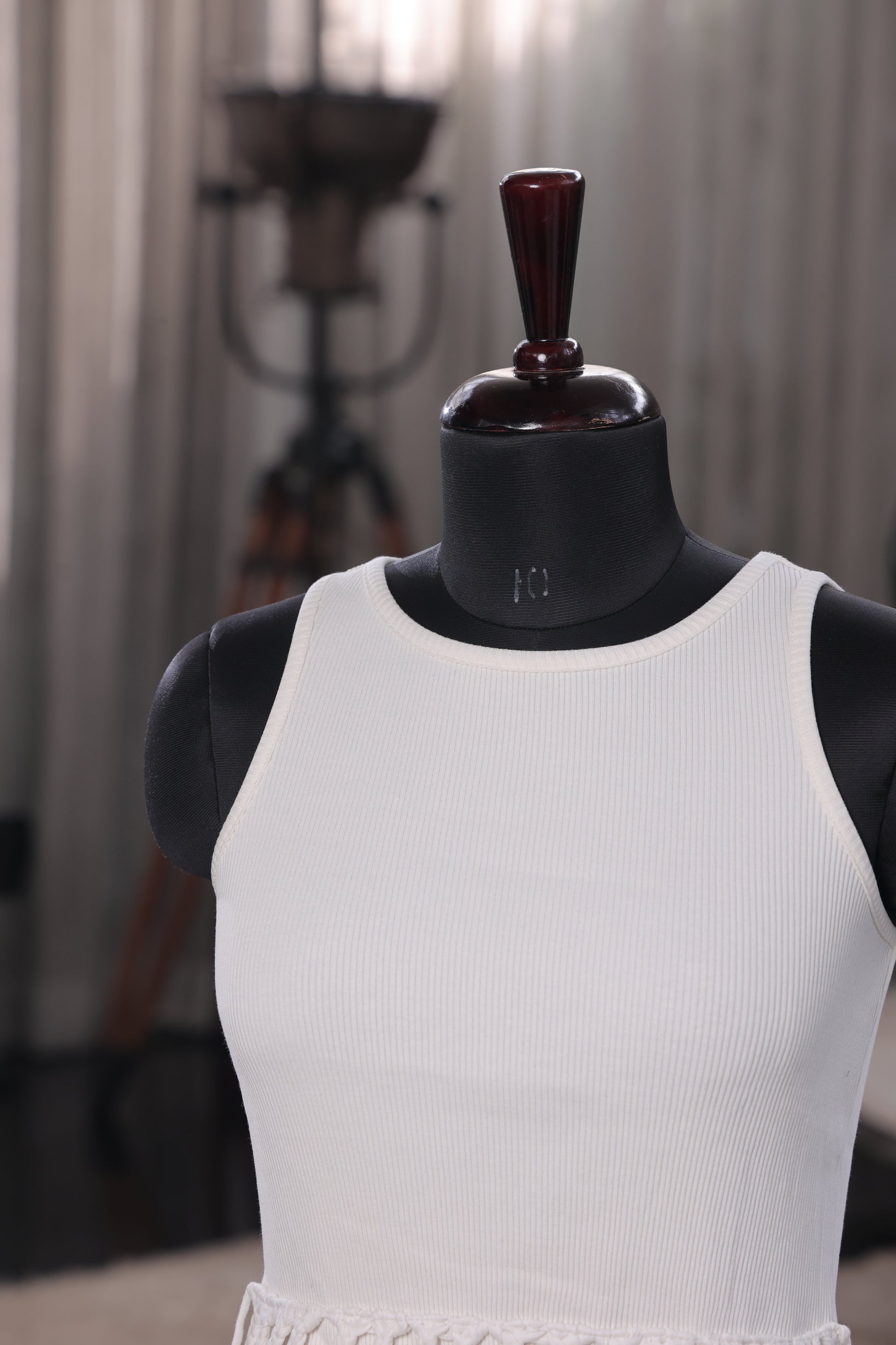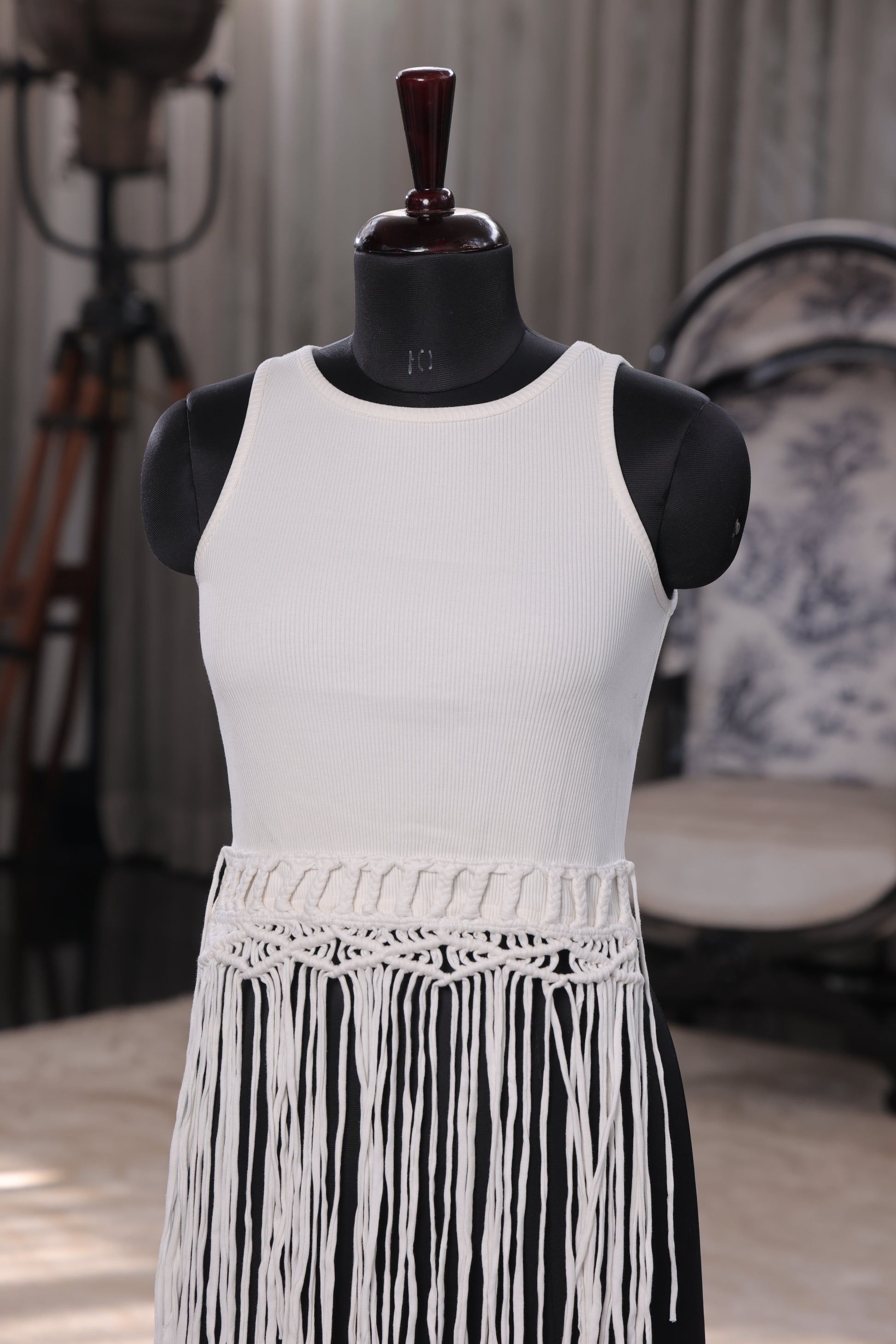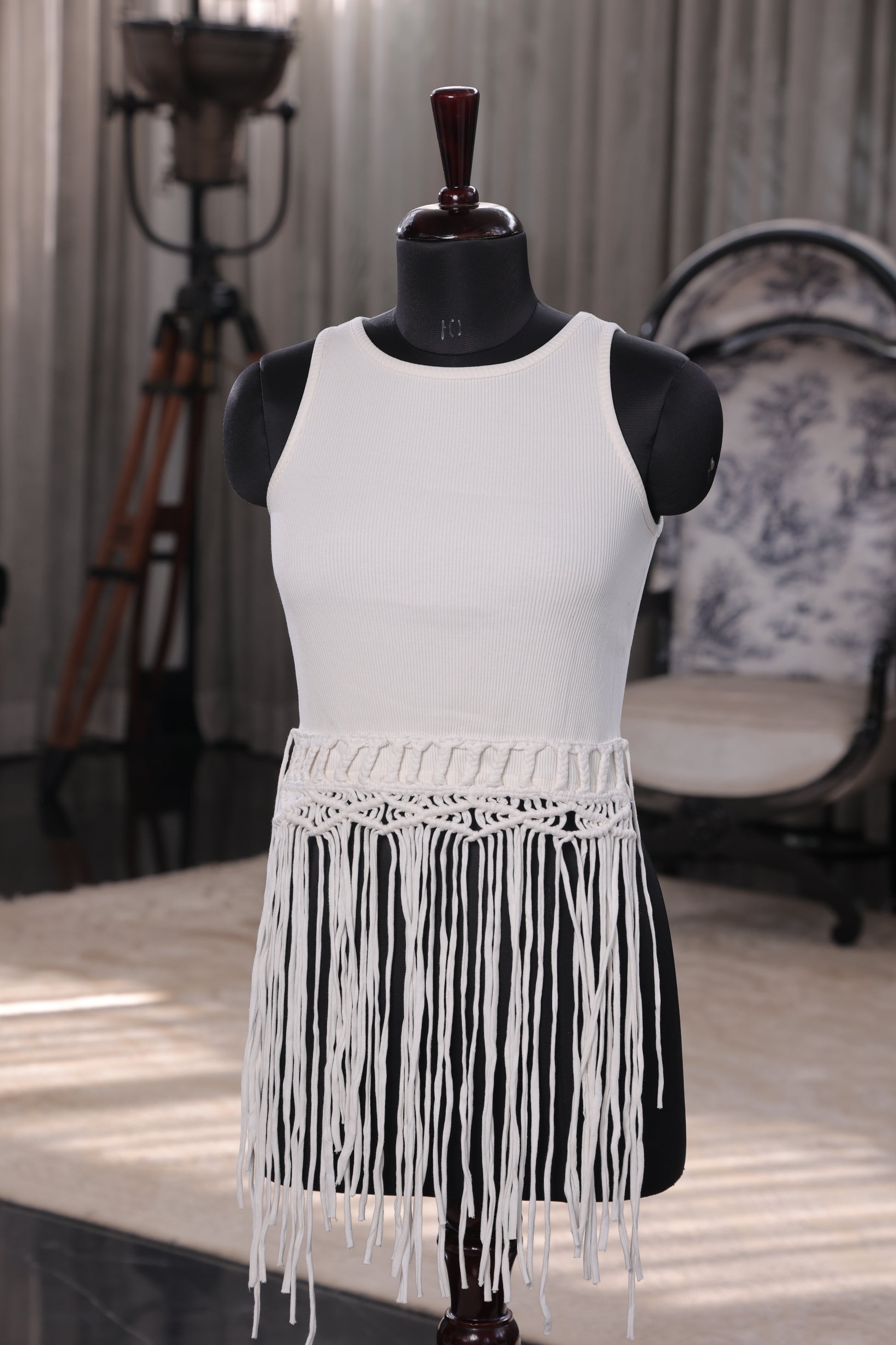 This stylish white tank top features a long fringe hem, combining a classic silhouette with a playful twist. Pair with your favorite shorts or jeans for a fresh, trendy look.